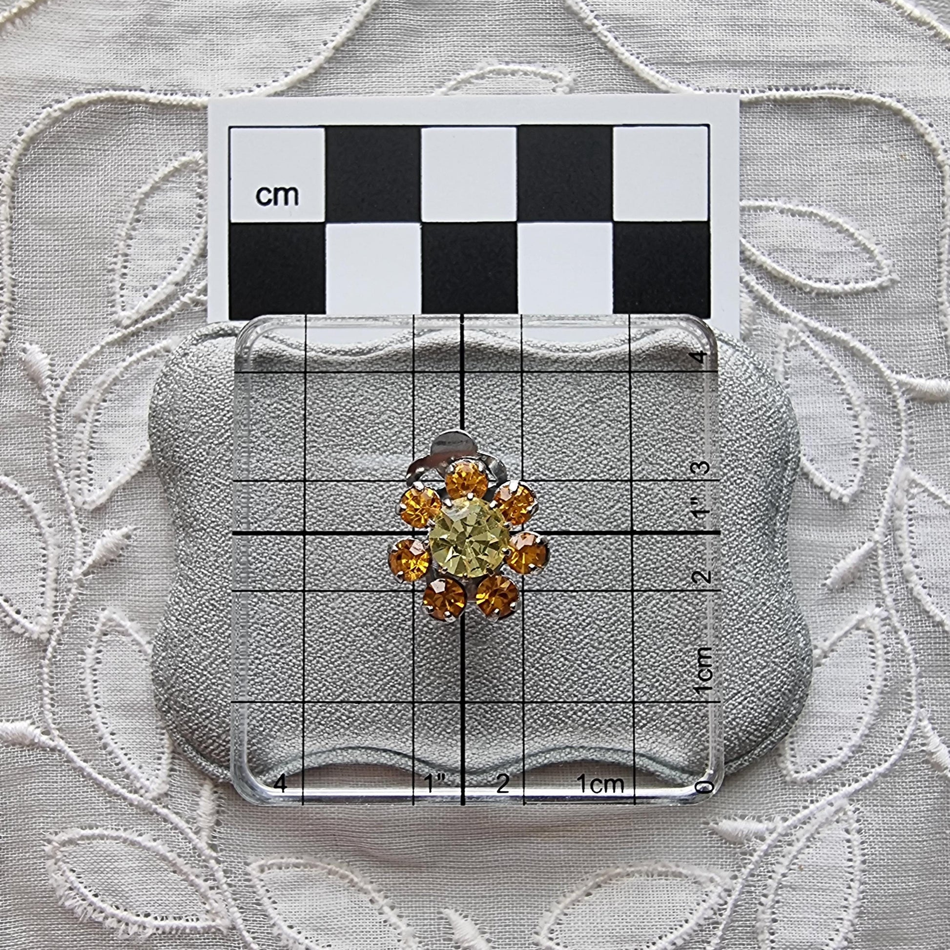 A lovely pair of small flower earrings with yellow crystal surrounded by orange crystals on white jewellery metal
