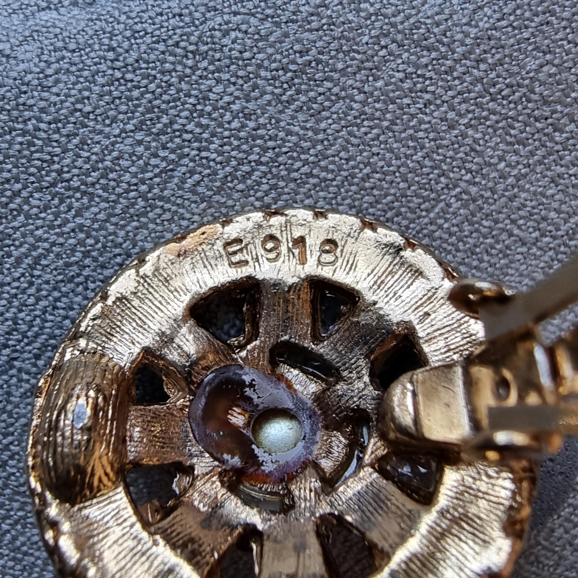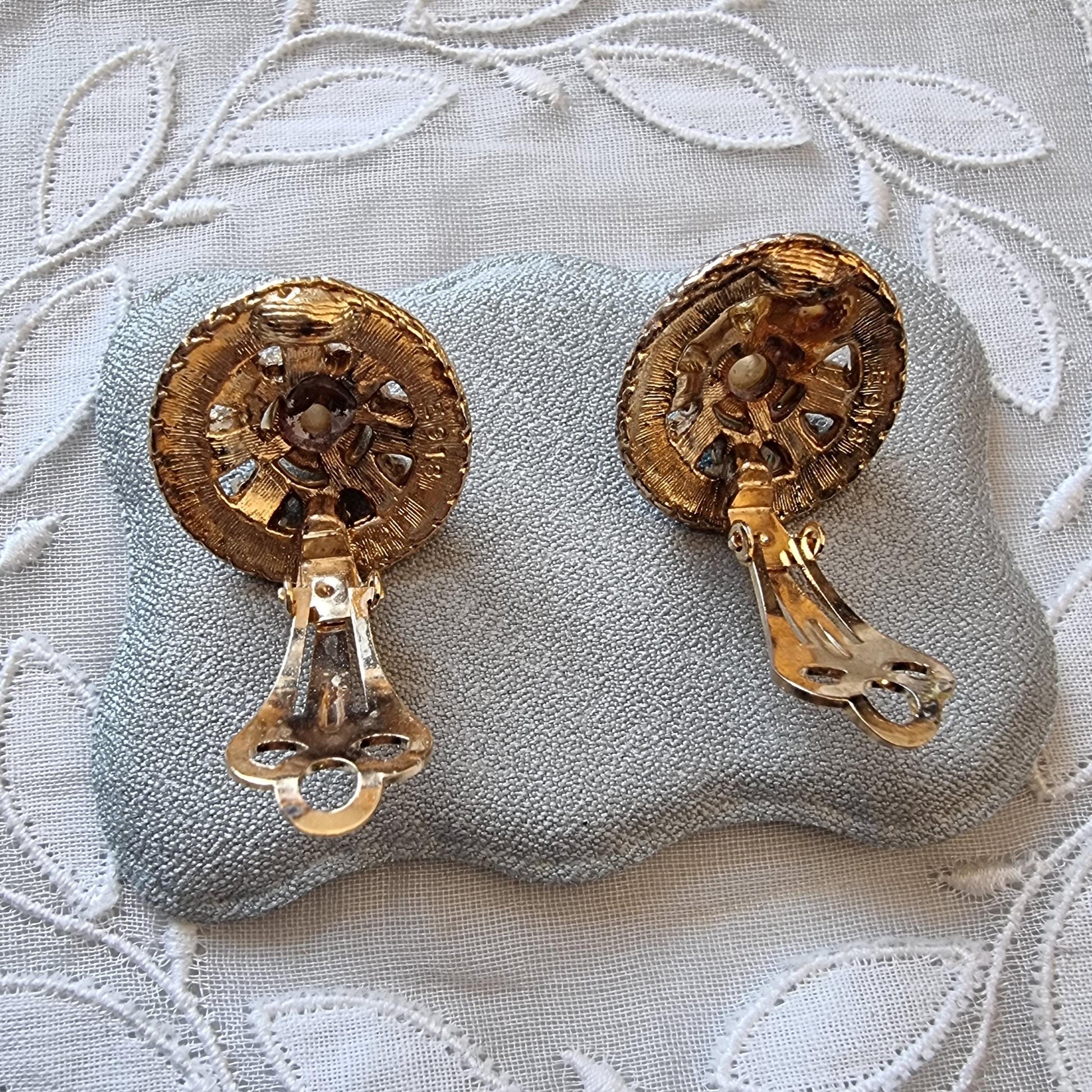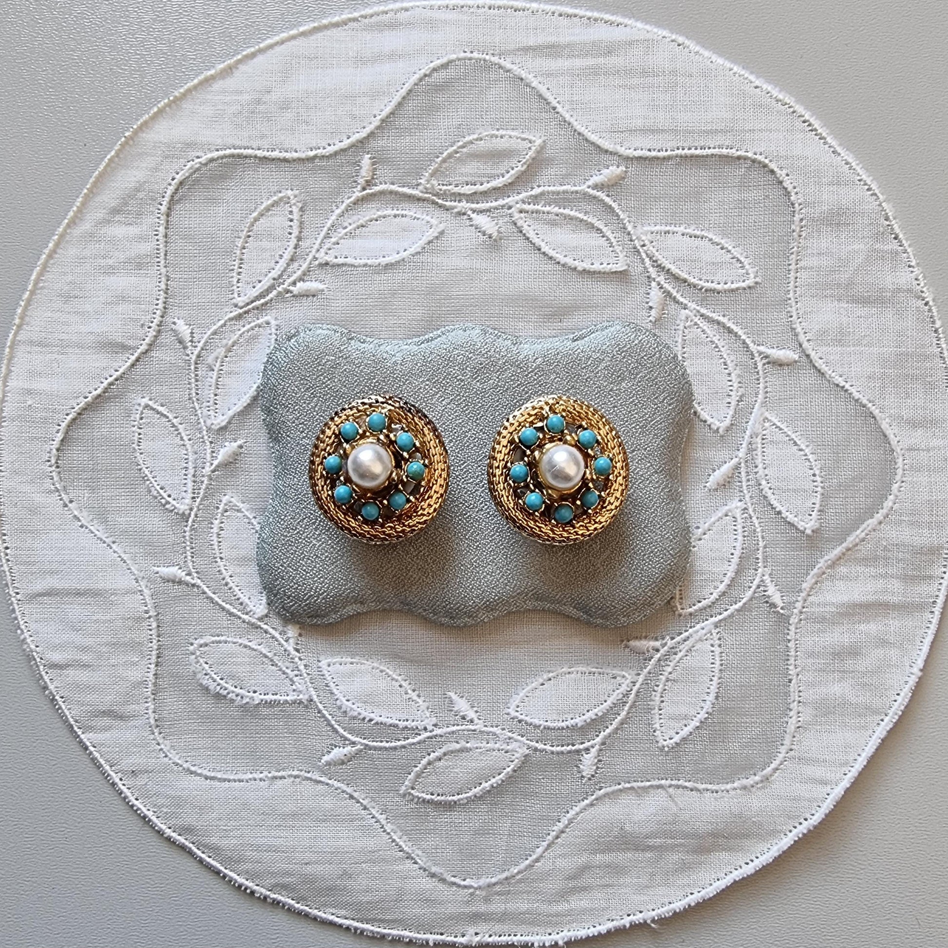 A stunning pair of round clip on earrings by Sphinx with faux pearls and small turquoise beads on gold plated metal