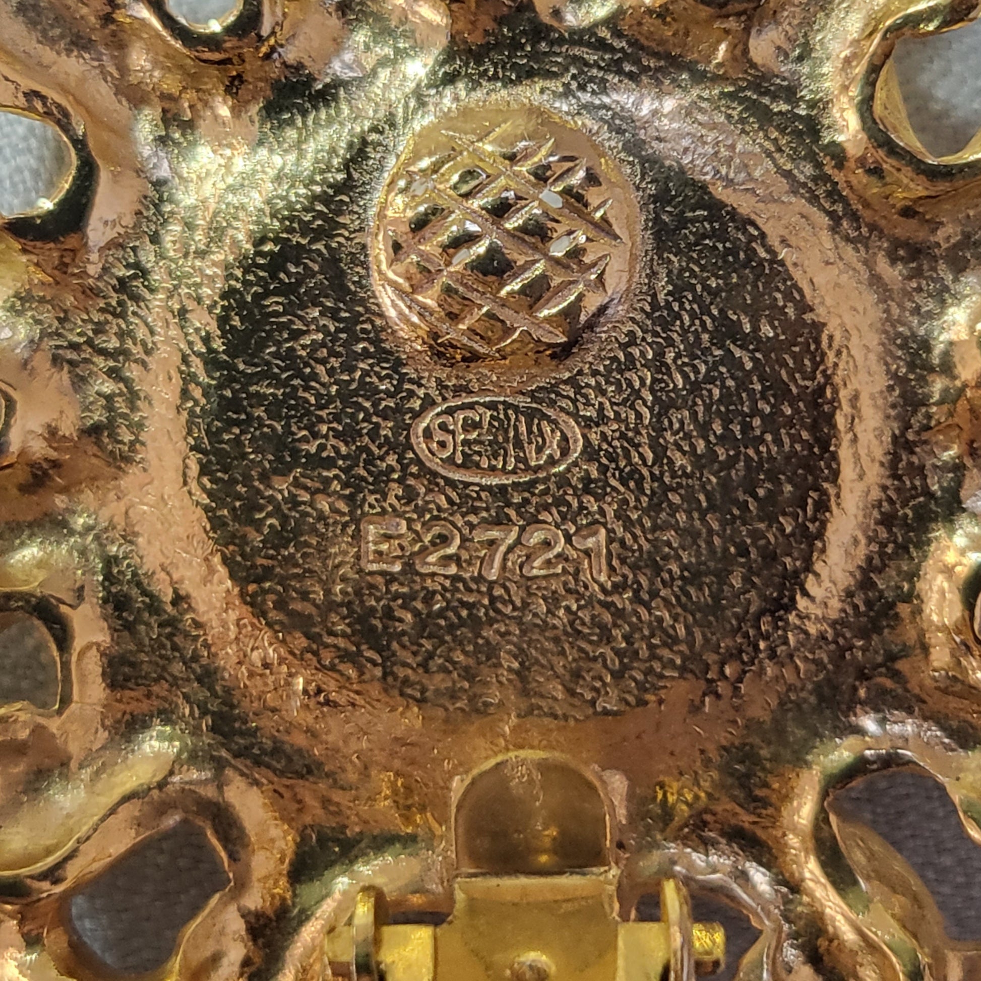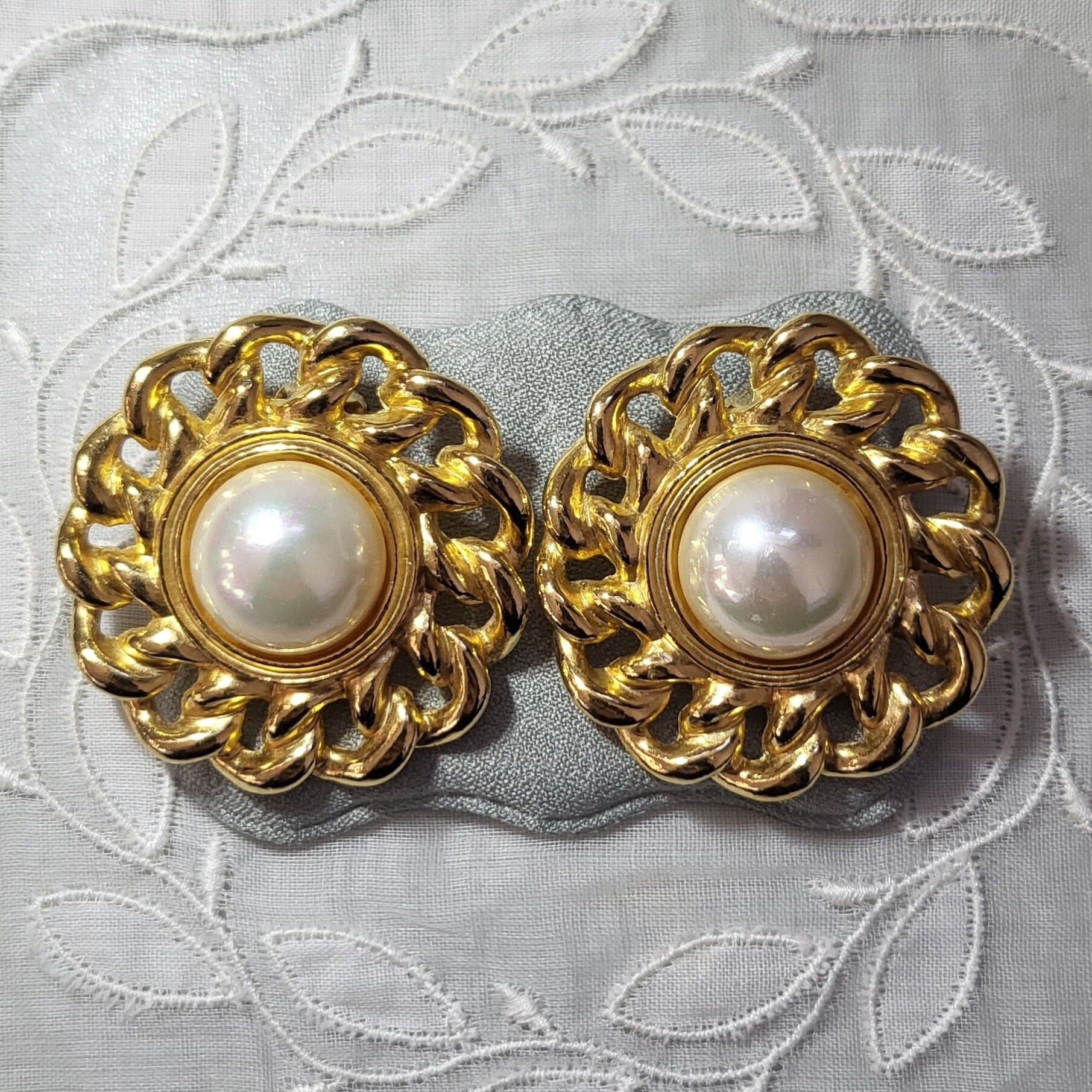 A beautiful pair of statement pearl clip on earrings by Sphinx of London with faux pearl cabochon on gold plated metal