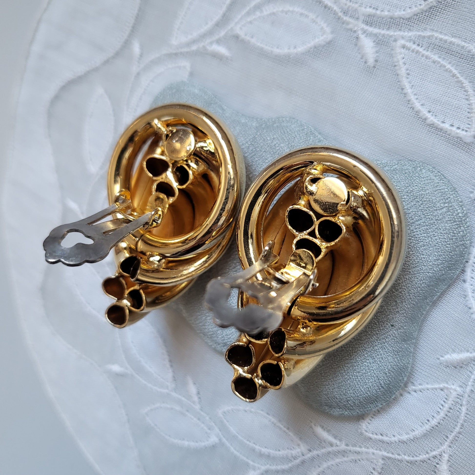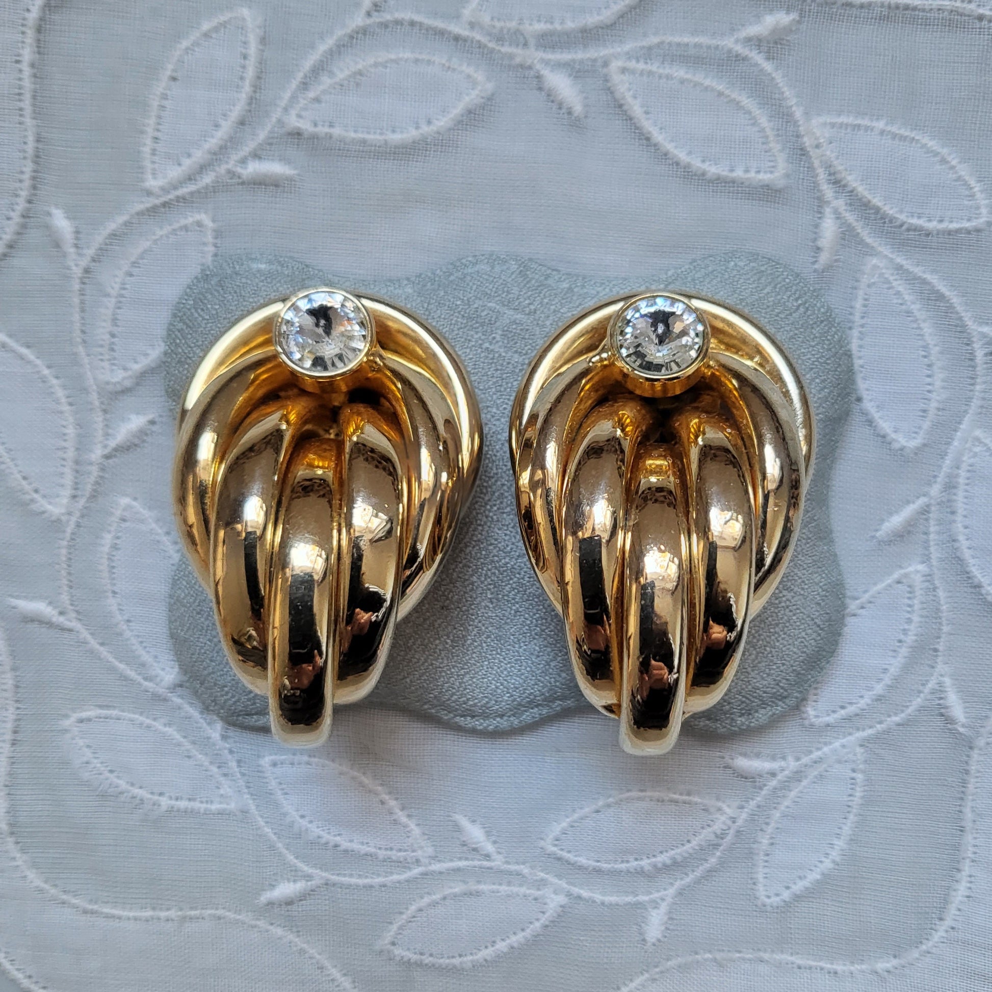 A stunning pair of bold statement clip on earrings with round clear crystal set on polished gold plated metal