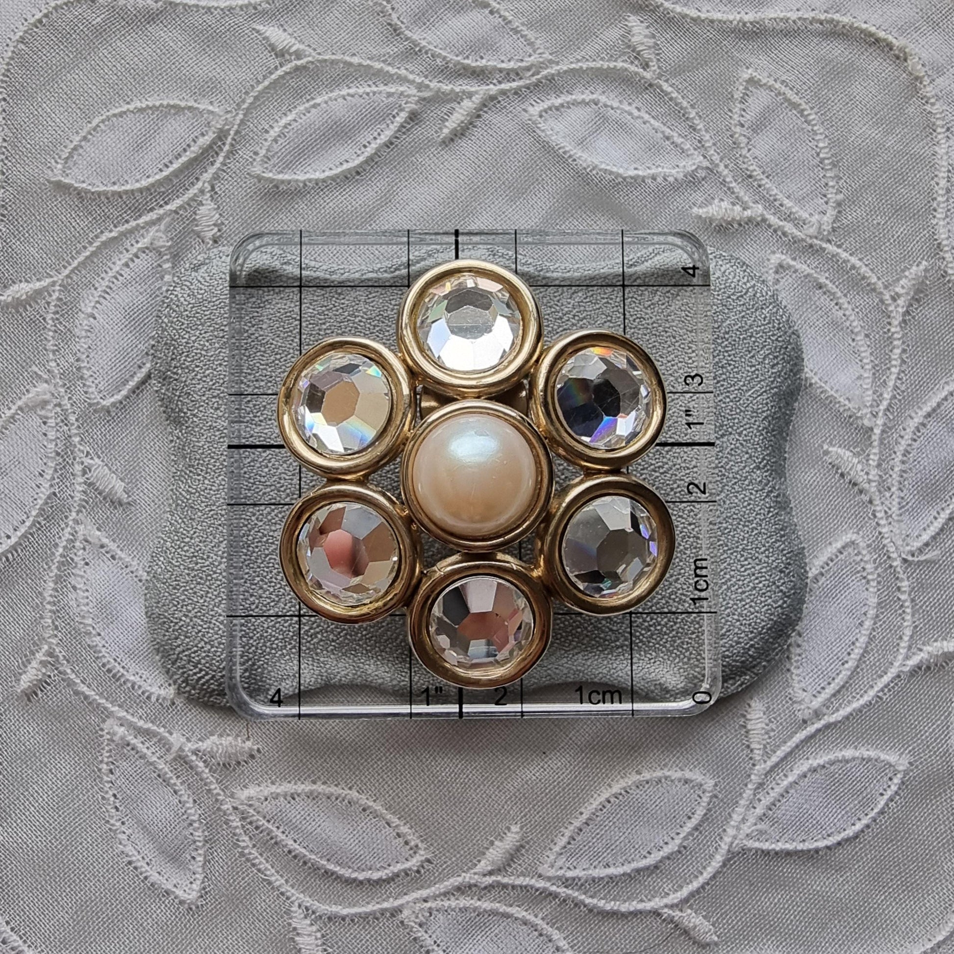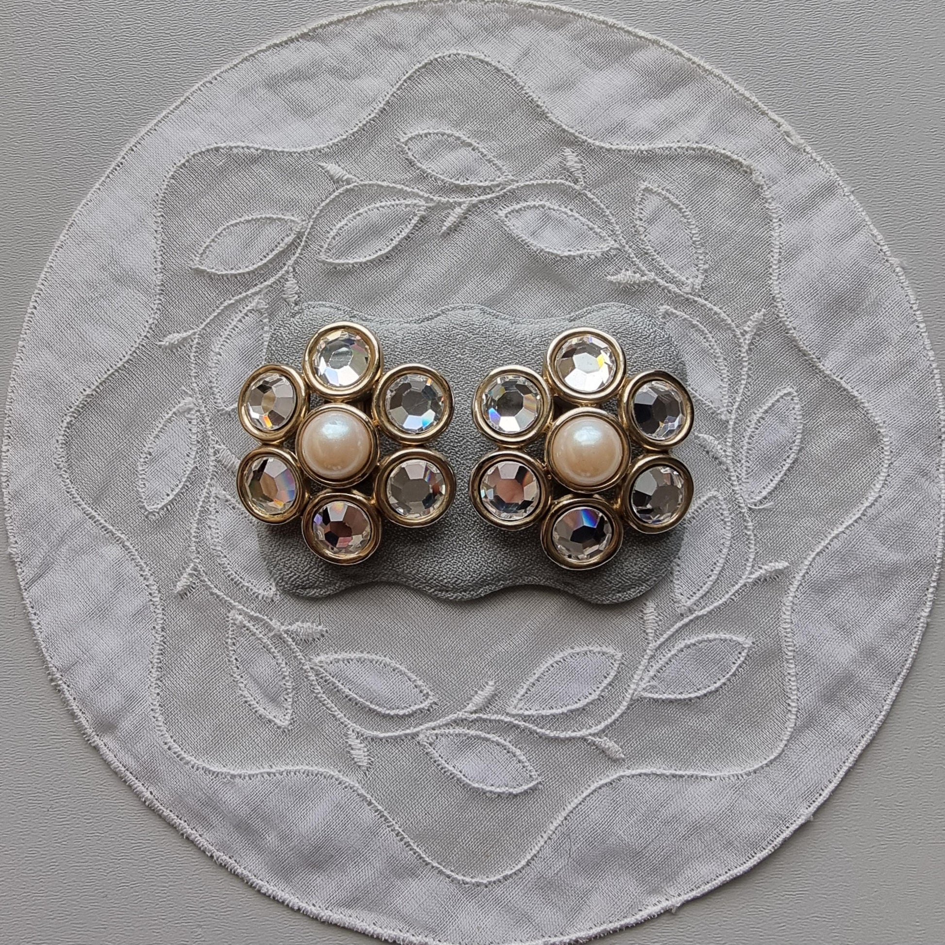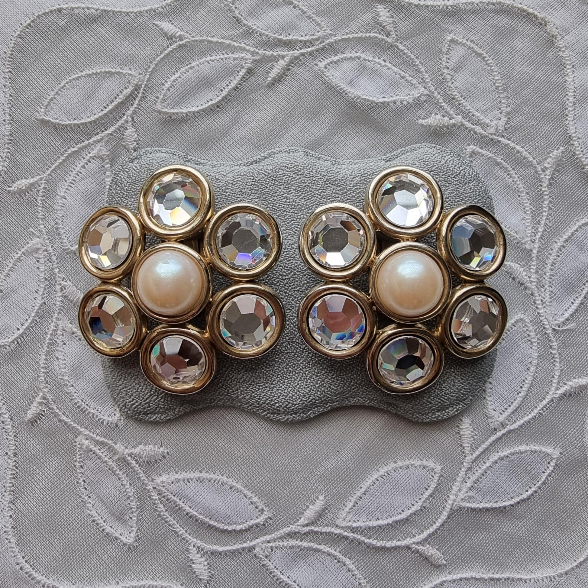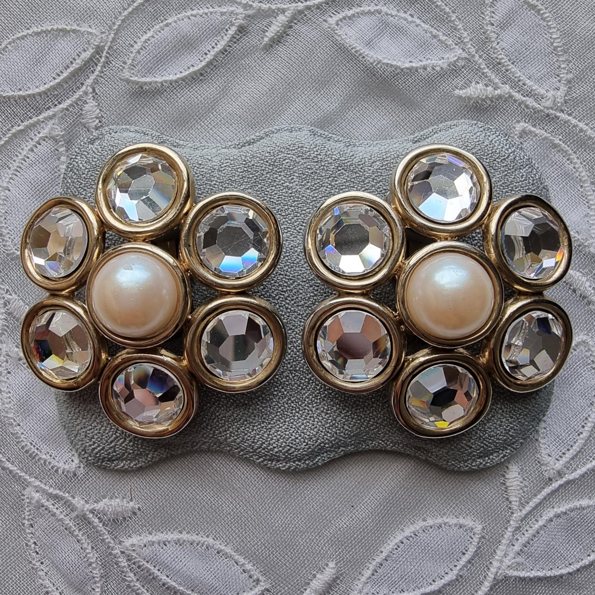 A stunning pair of statement flower clip on earrings with faux pearl and crystal cabochons on gold plated metal