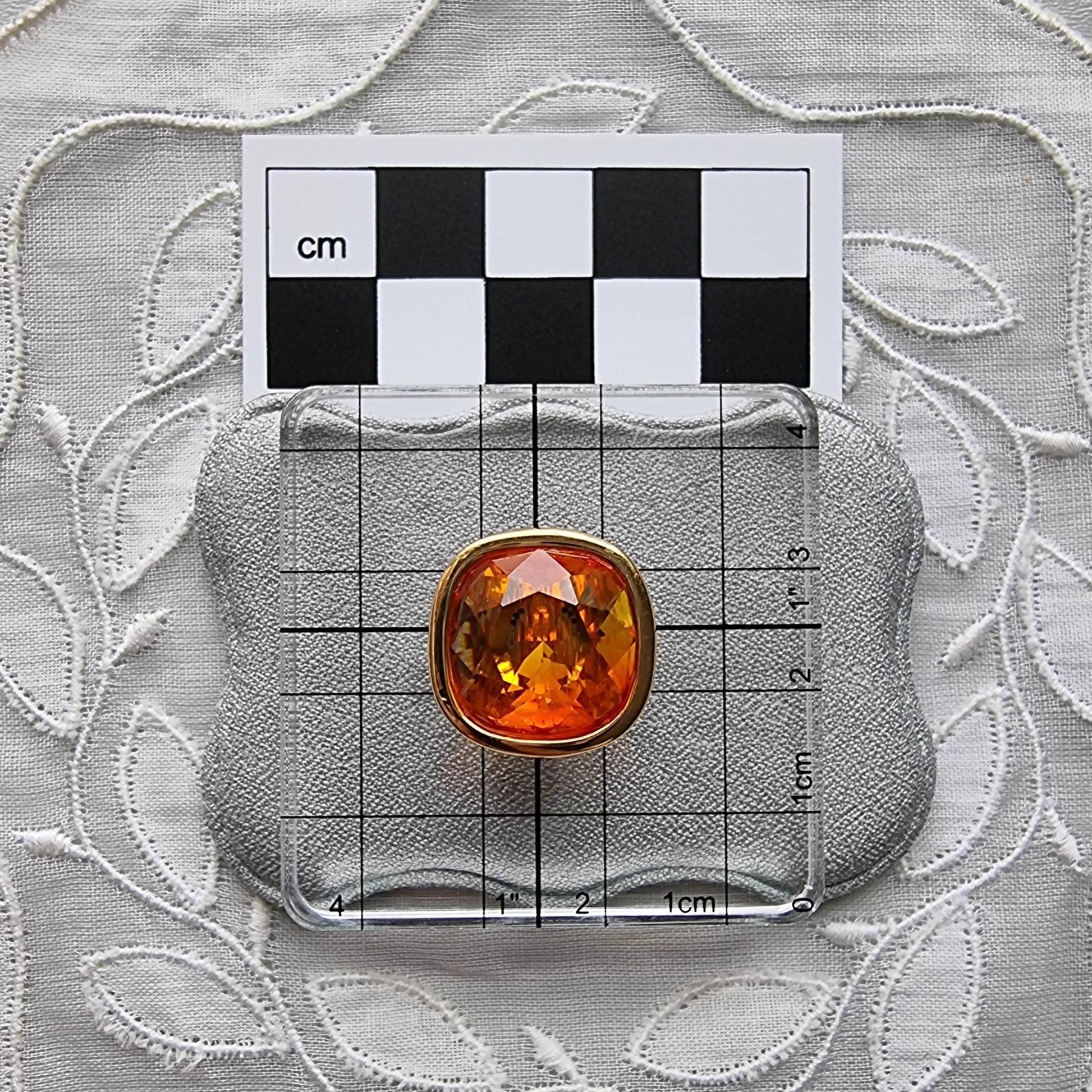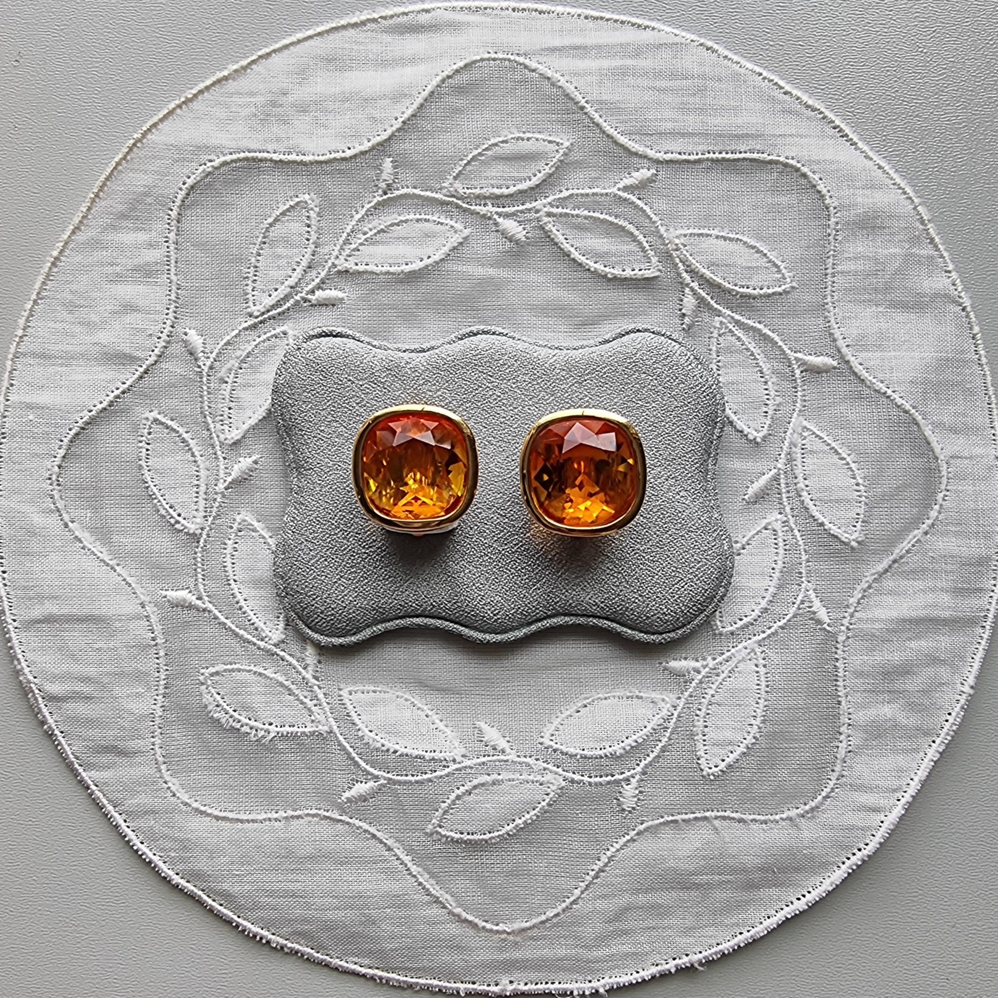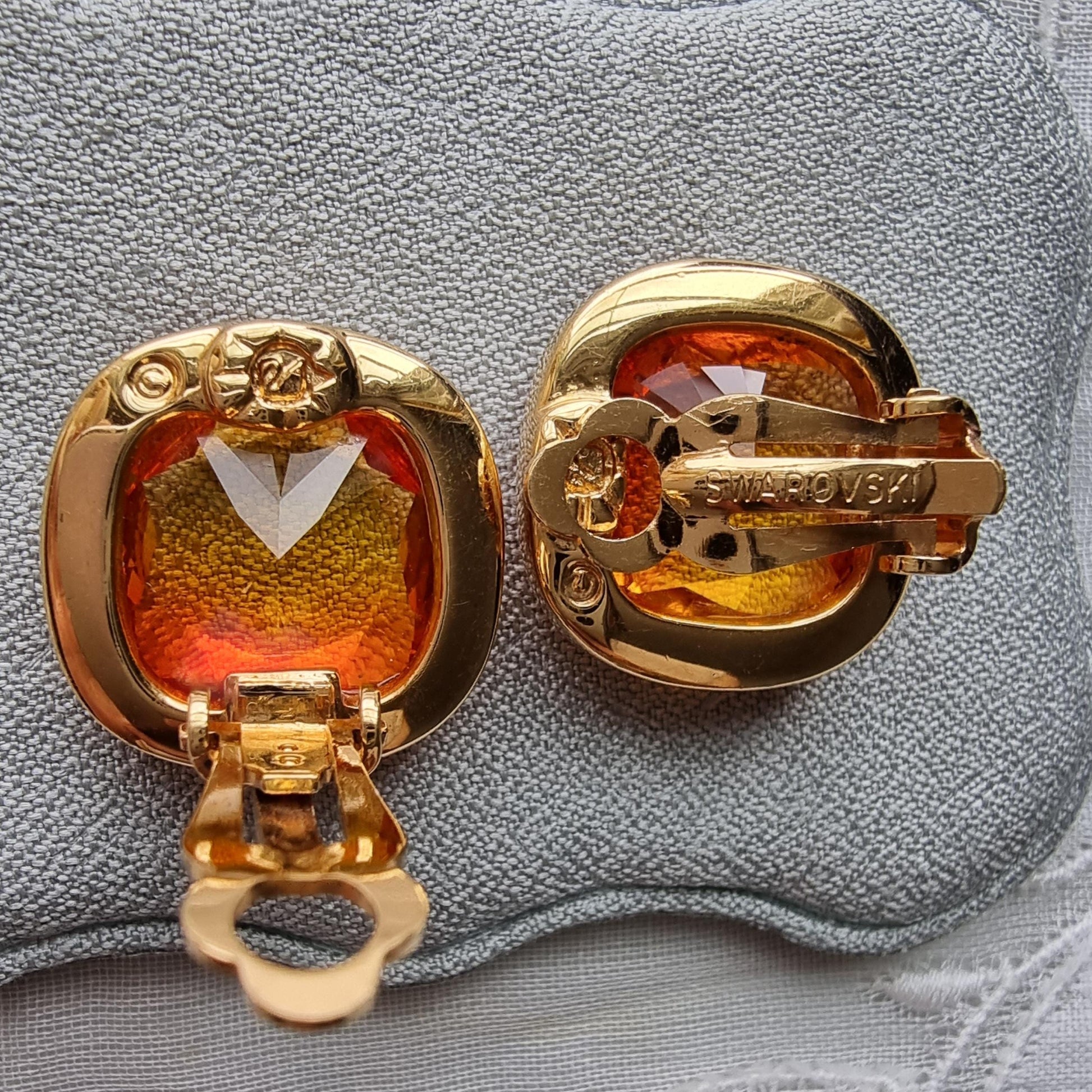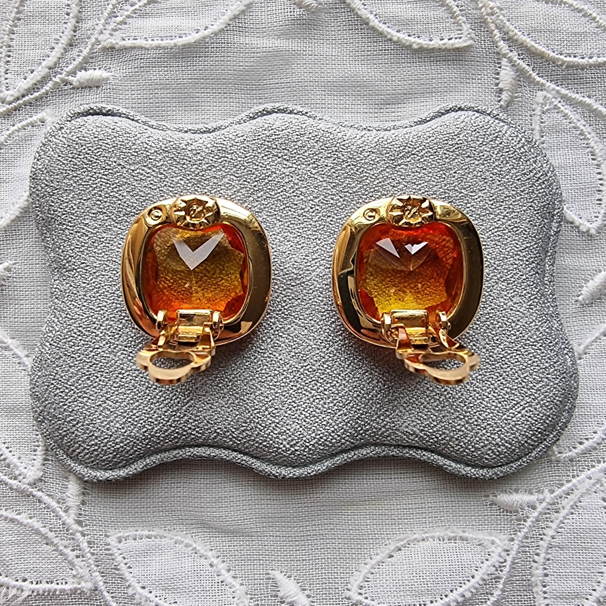 An gorgeous pair of clip on earrings by Swarovski with cushion cut orange crystals on gold plated metal