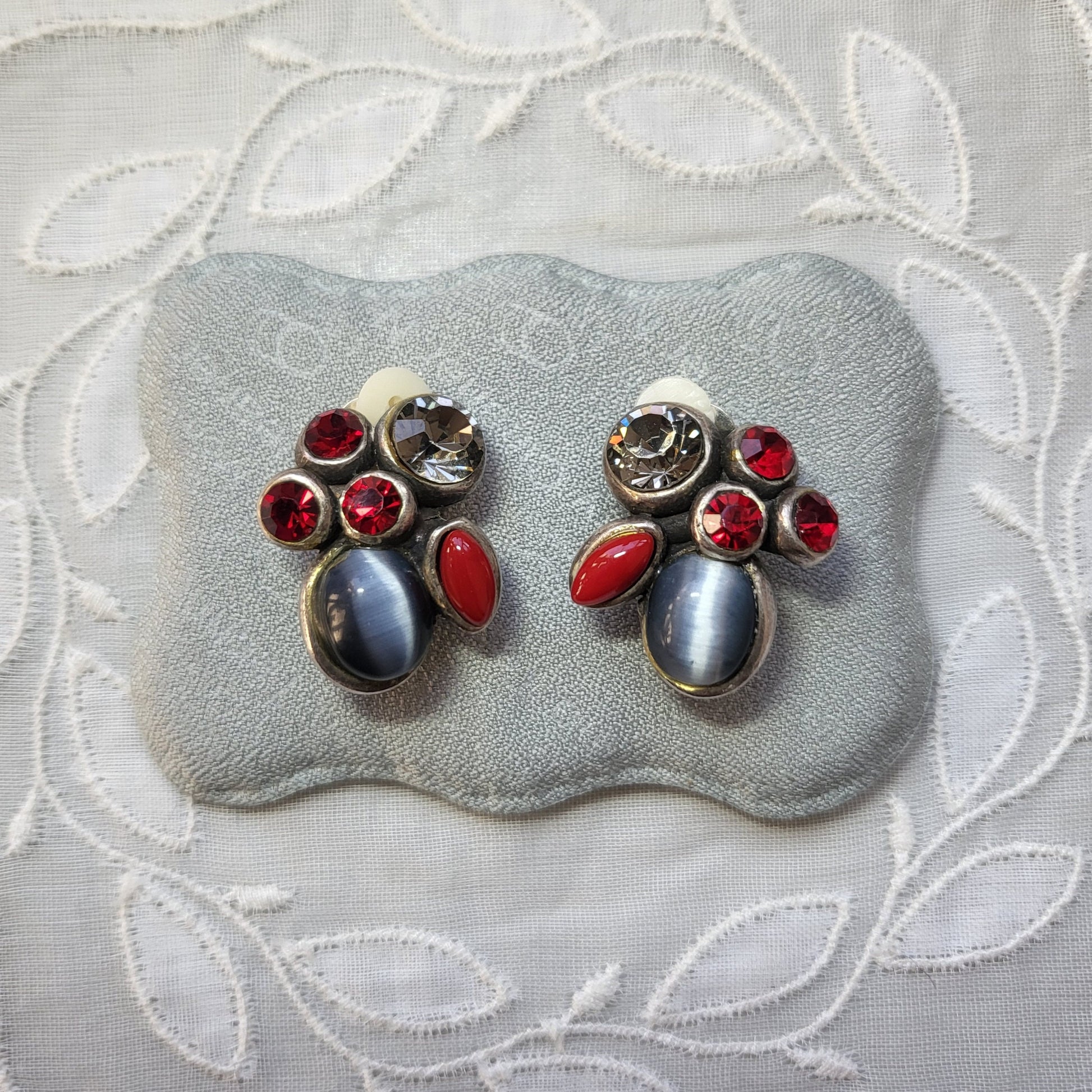 A stunning pair of rare Taratata clip on earrings with grey cat's eye cabochon, red marquis cabochon and round crystals set on silver tone jewellery metal alloy