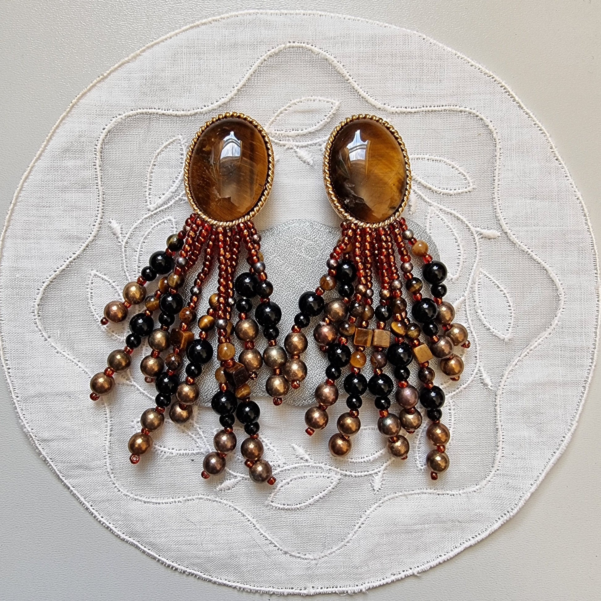 A stunning chandelier earrings with tiger eye cabochon tops and red aurora borealis, black and gold beads