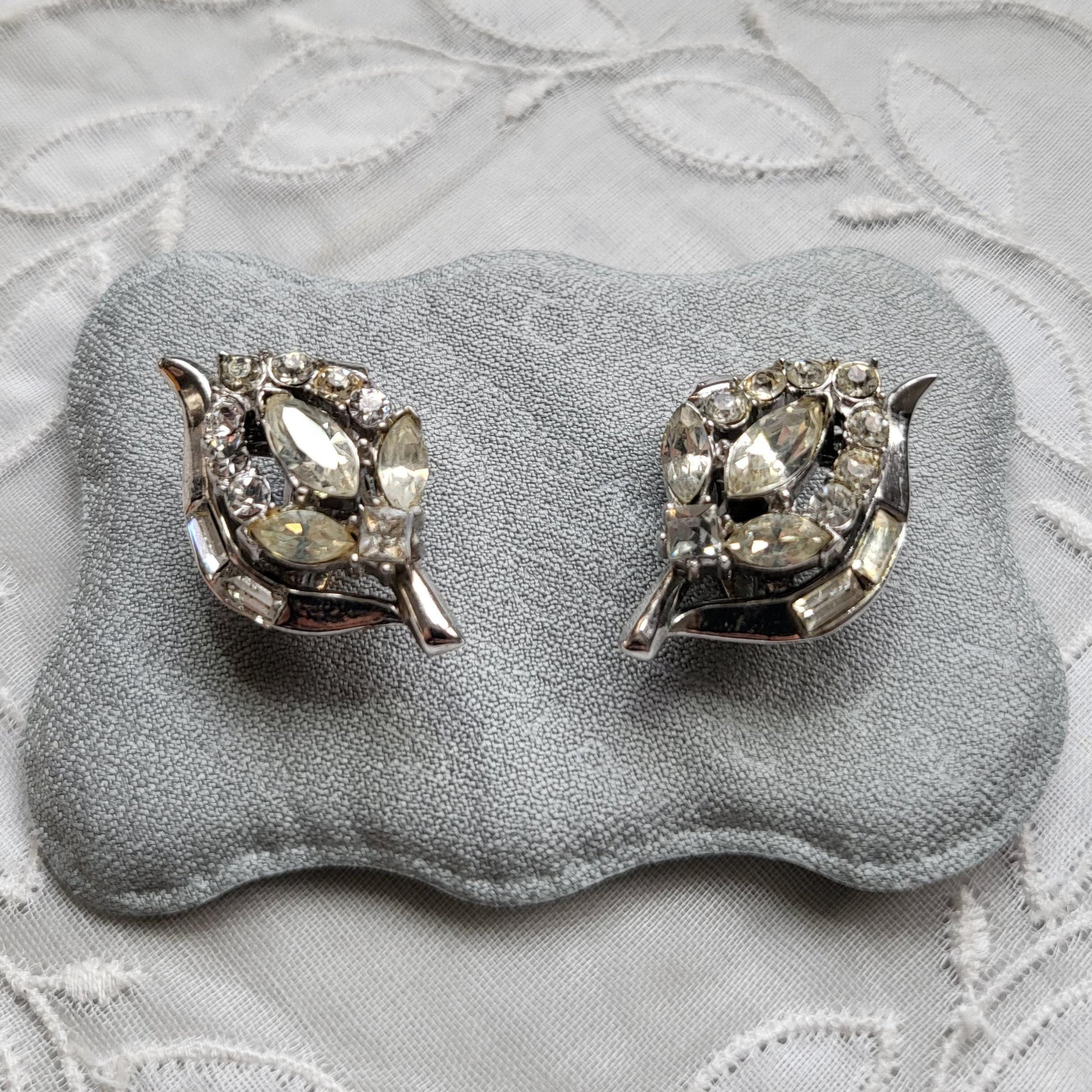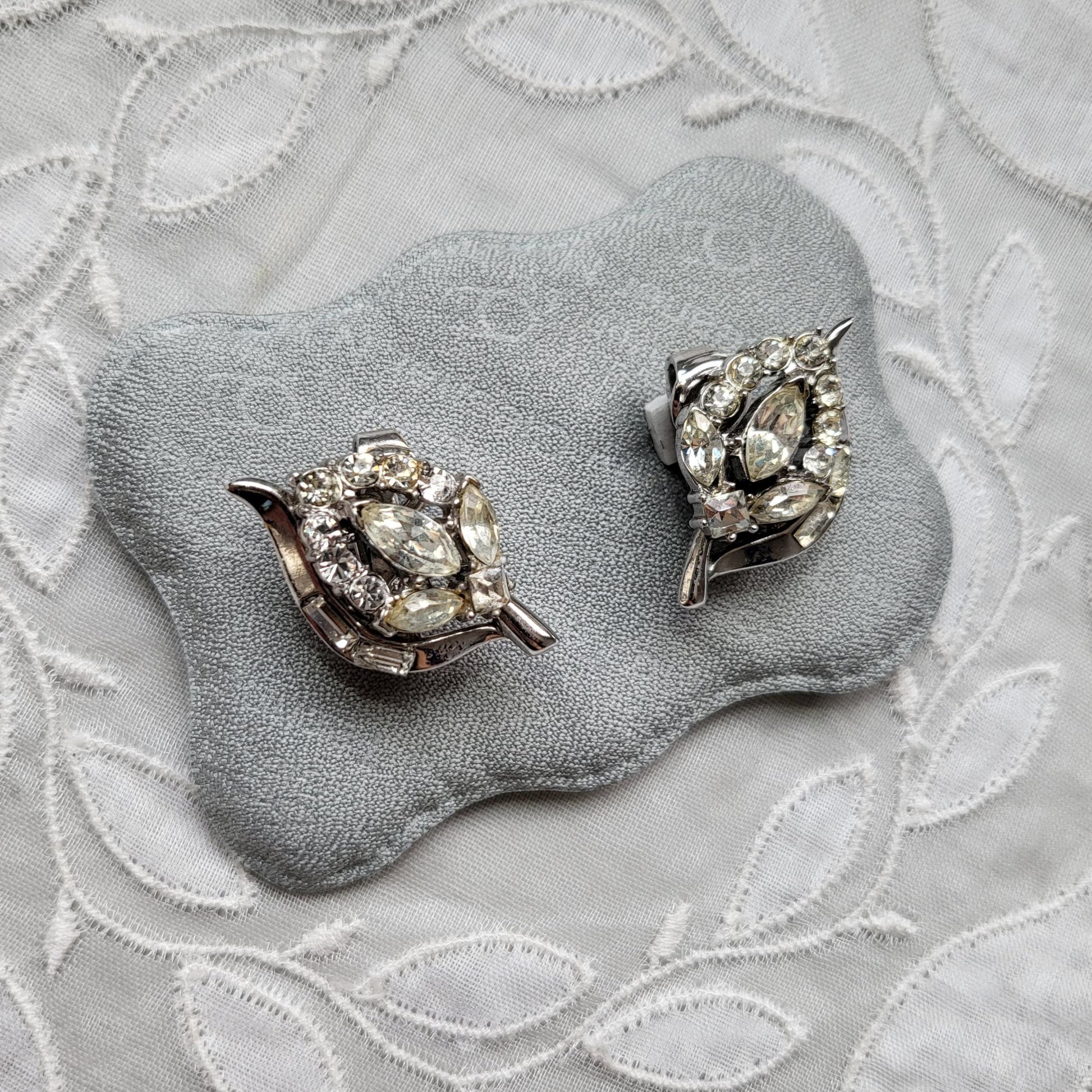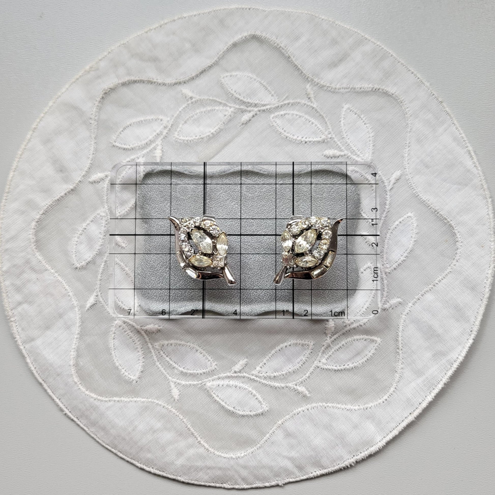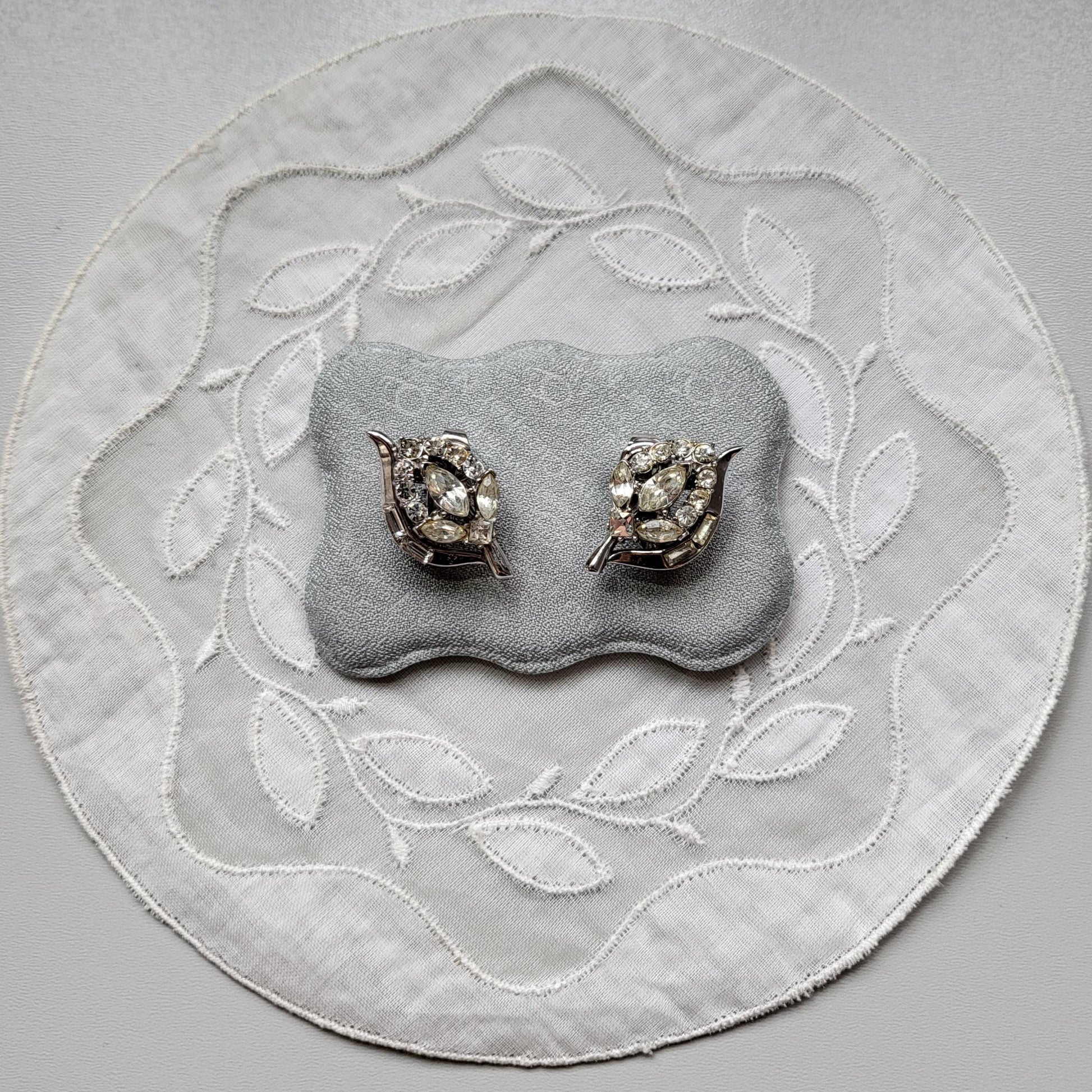 An elegant pair of small clip on earrings by Crown Trifari with clear crystals on rhodium plated metal