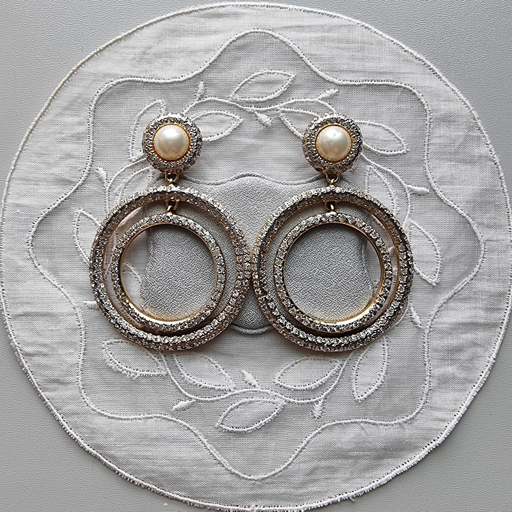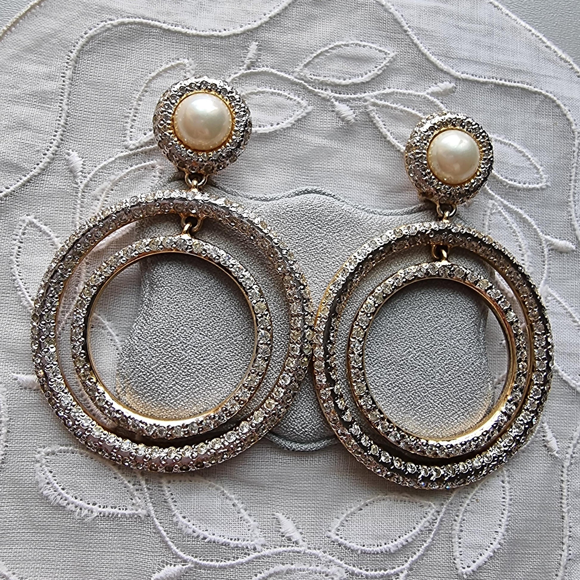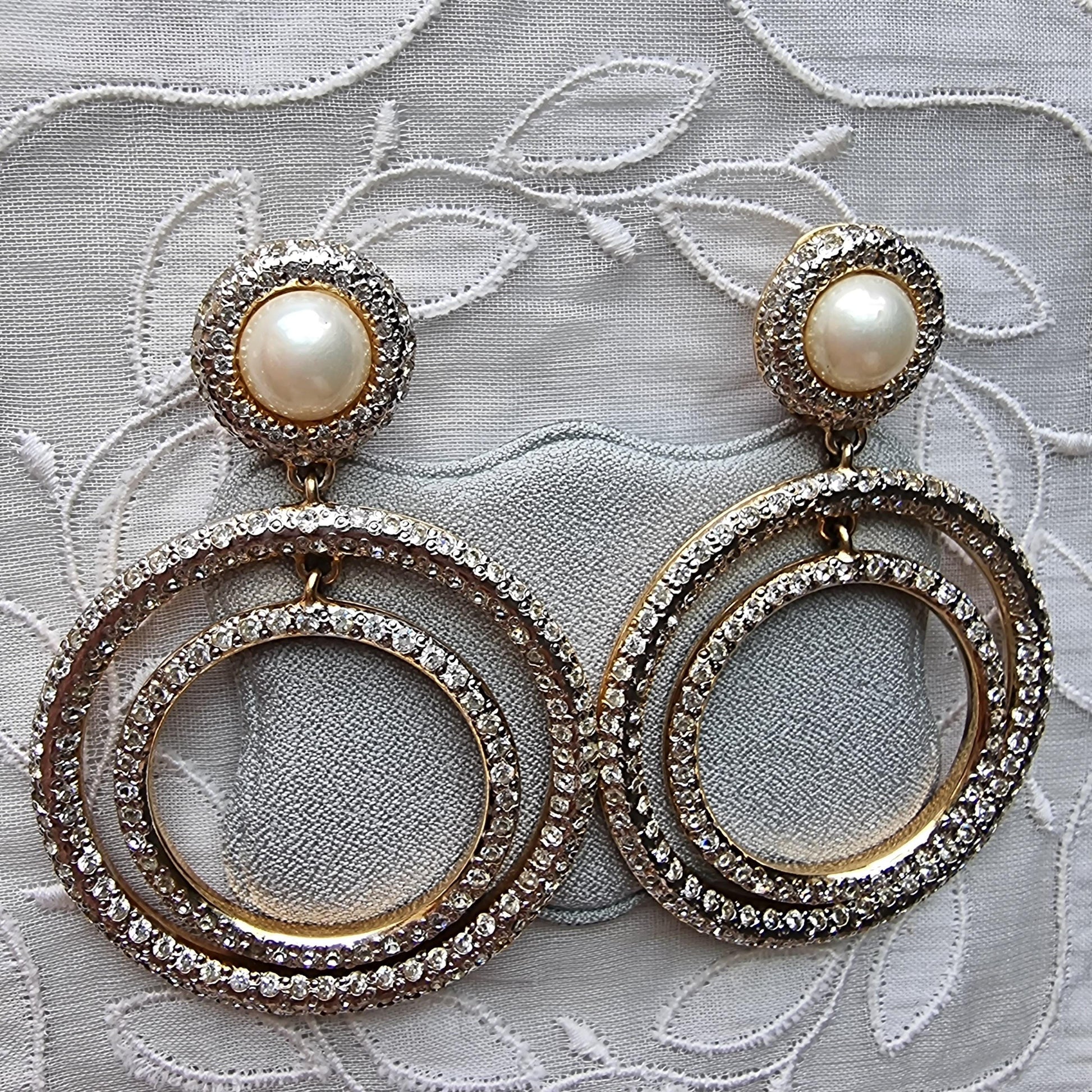 A stunning hoop drops statement clip on earrings by Vogue Bijoux with faux pearl cabochons and clear crystals set on rhodium and gold plated metal