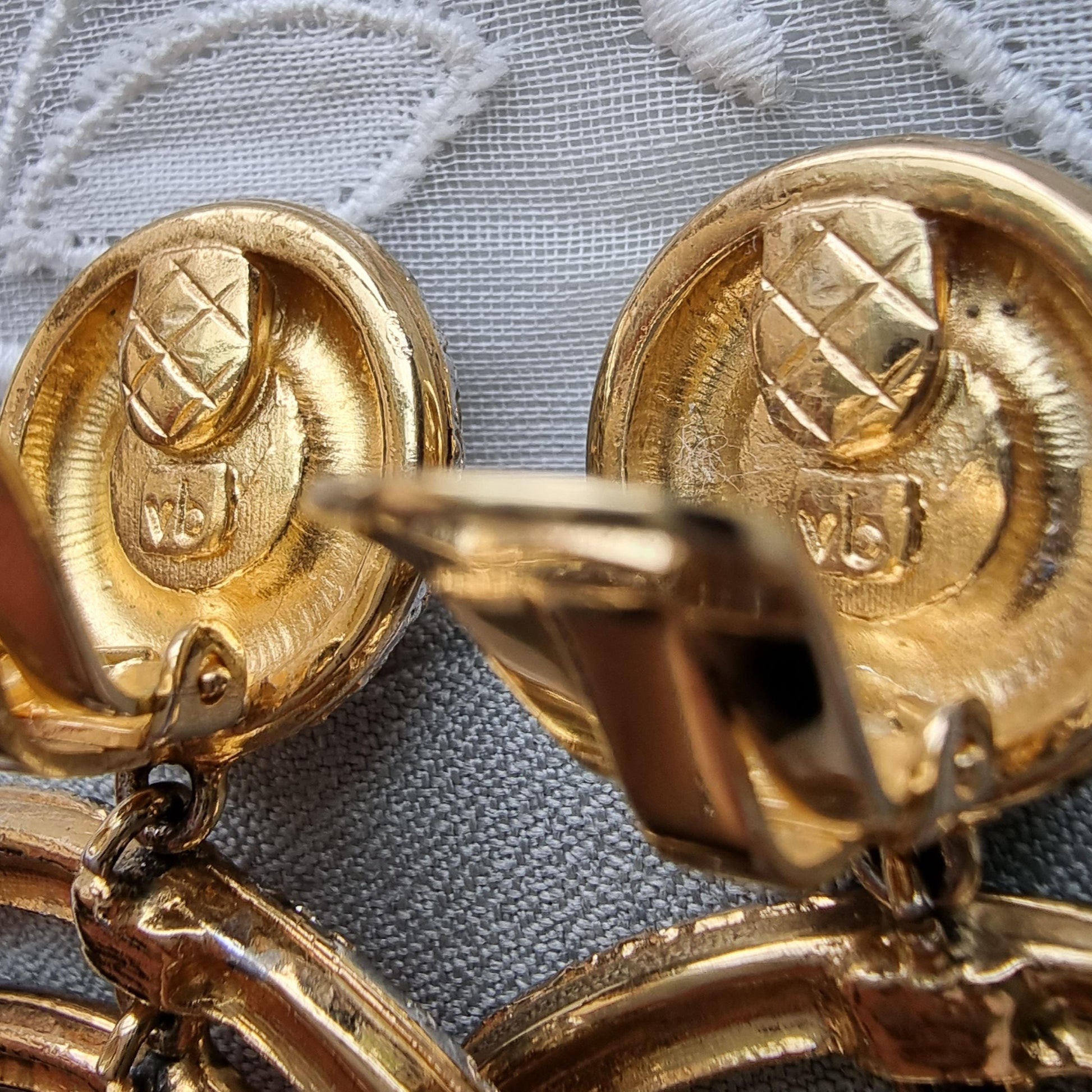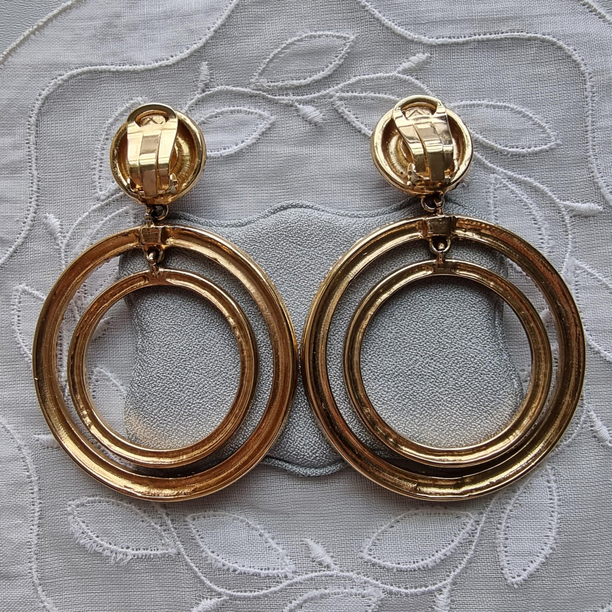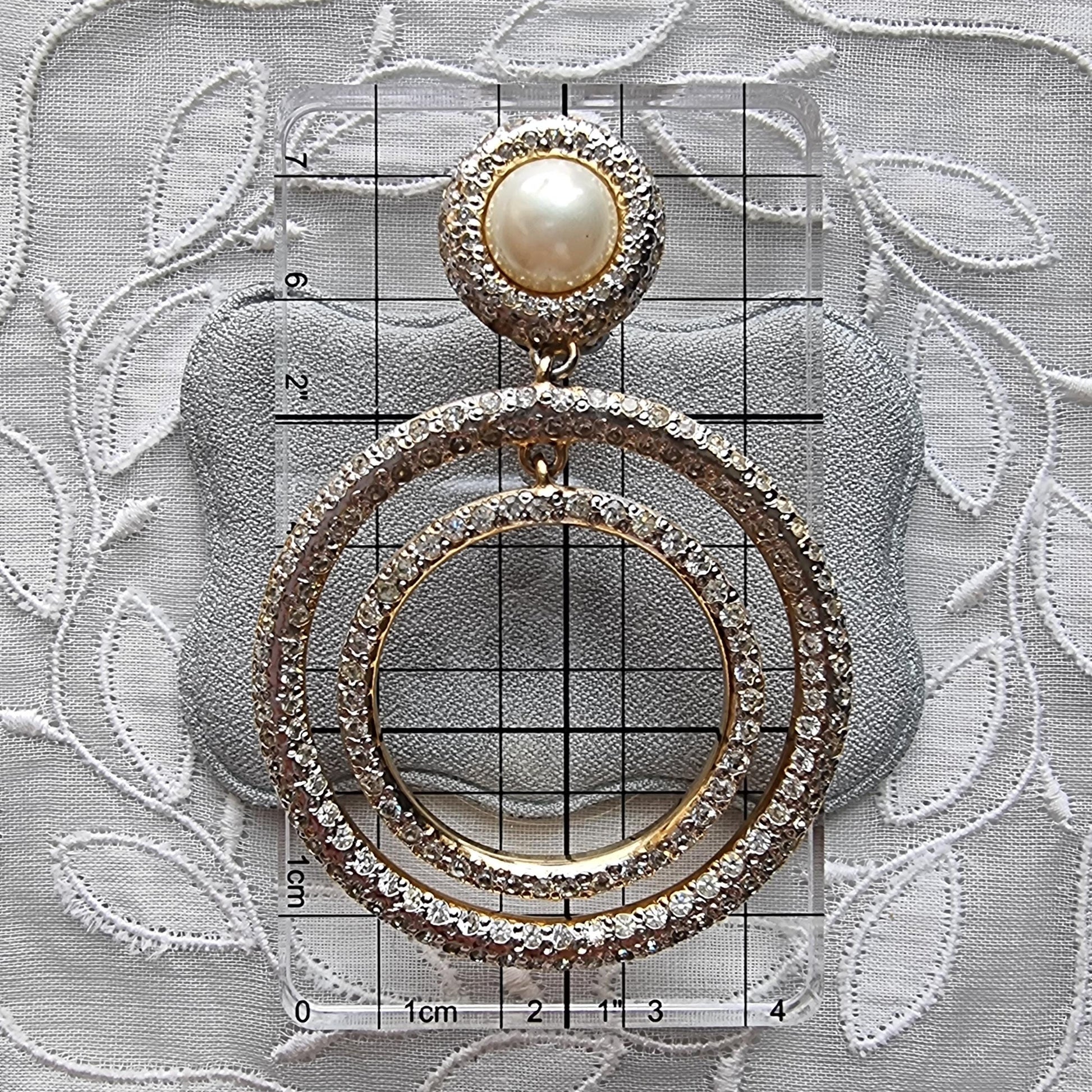 A stunning hoop drops statement clip on earrings by Vogue Bijoux with faux pearl cabochons and clear crystals set on rhodium and gold plated metal