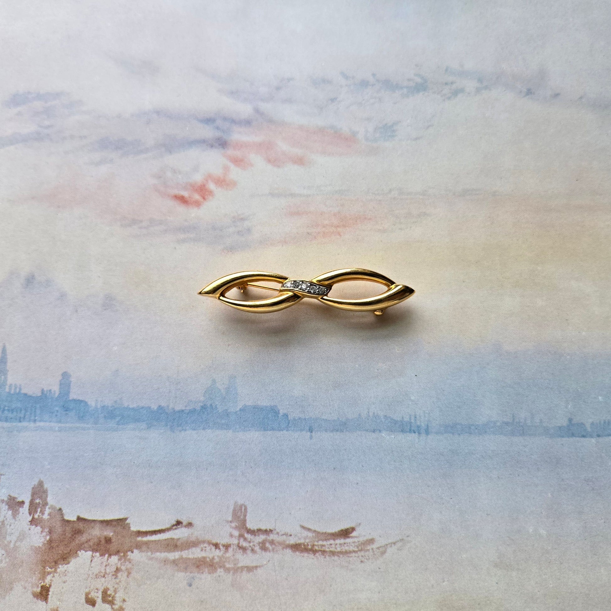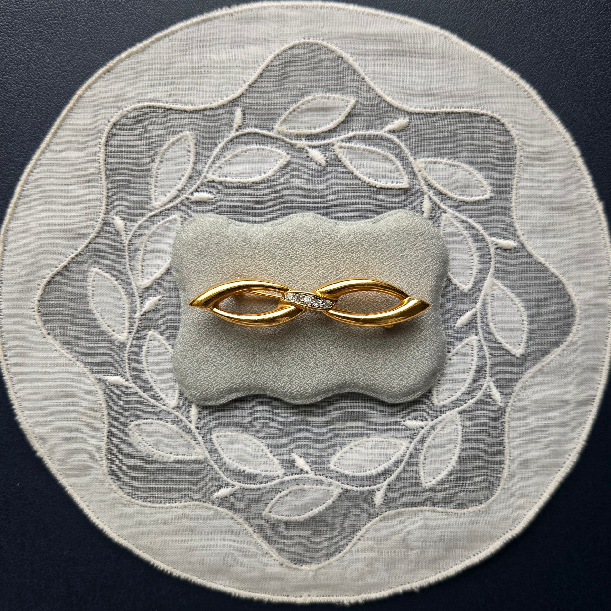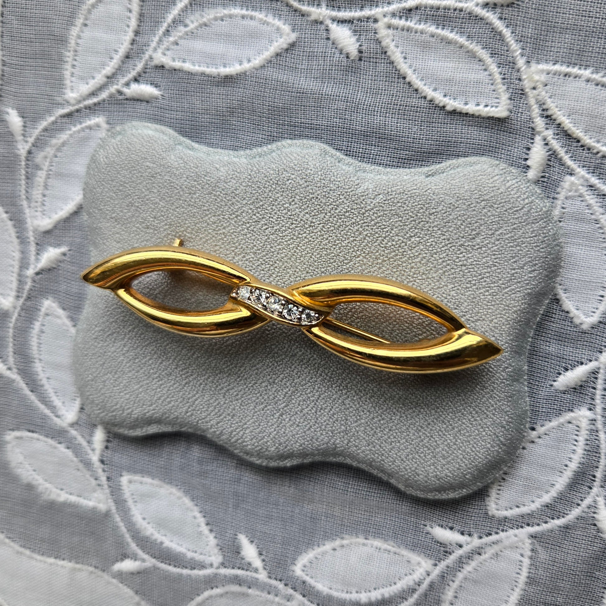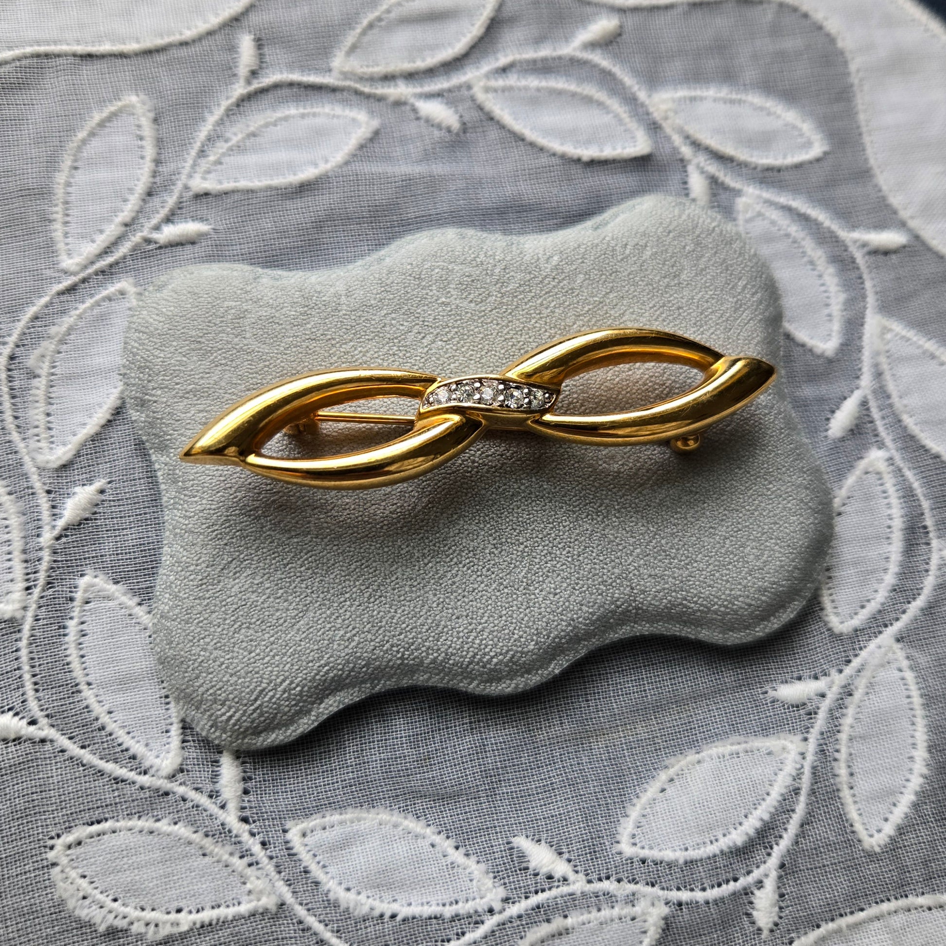 Add a touch of timeless elegance to your outfit with this vintage Cristalina gold-tone bow brooch, signed with the brand’s signature mark. Crafted in the 1980s, this classic piece features a sleek, stylised bow design with sparkling clear rhinestone accents at the centre—perfect for adding vintage charm to jackets, scarves, blouses or hats.