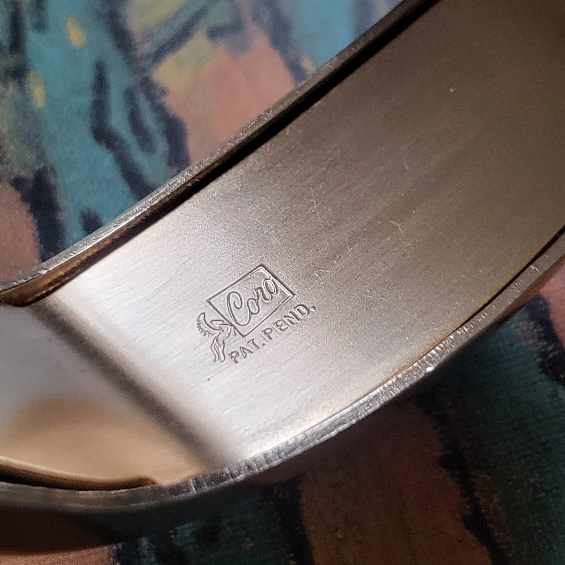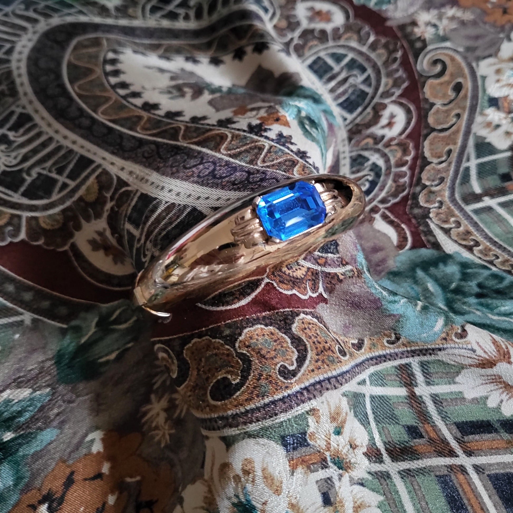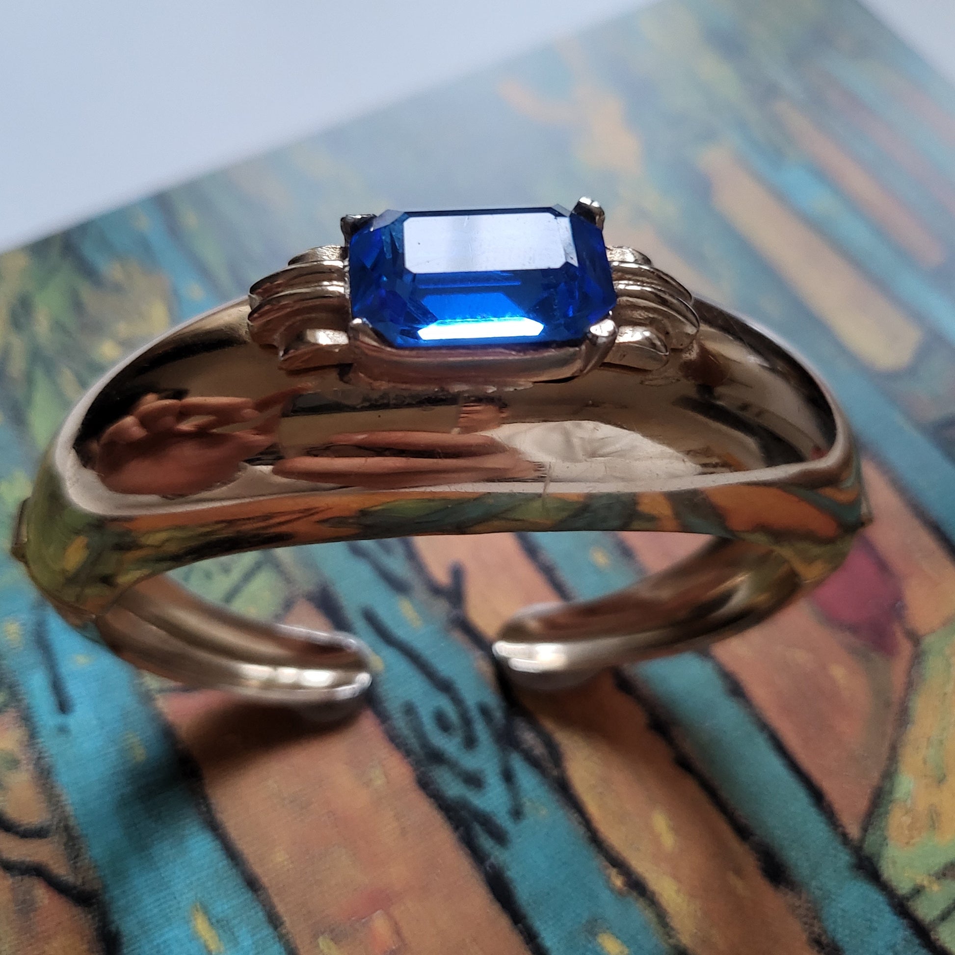 Amazing condition art deco style cuff bracelet by Coro with an emerald cut blue stone set on gold plated metal