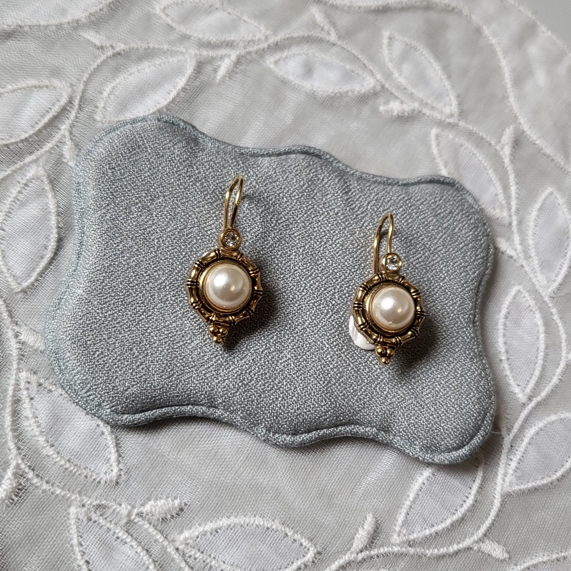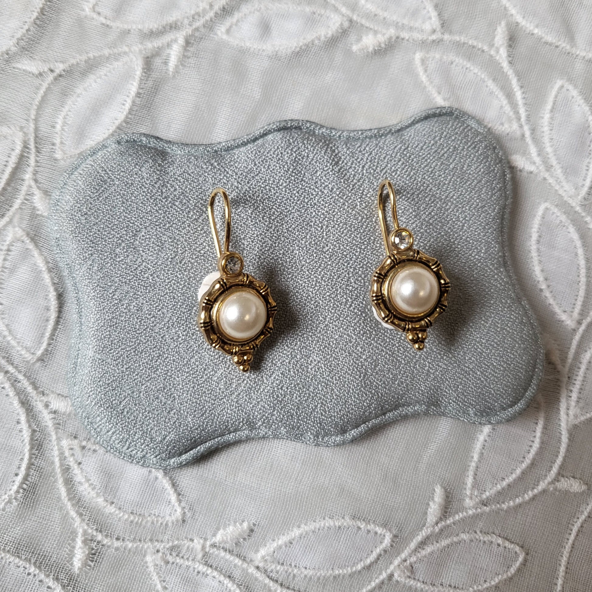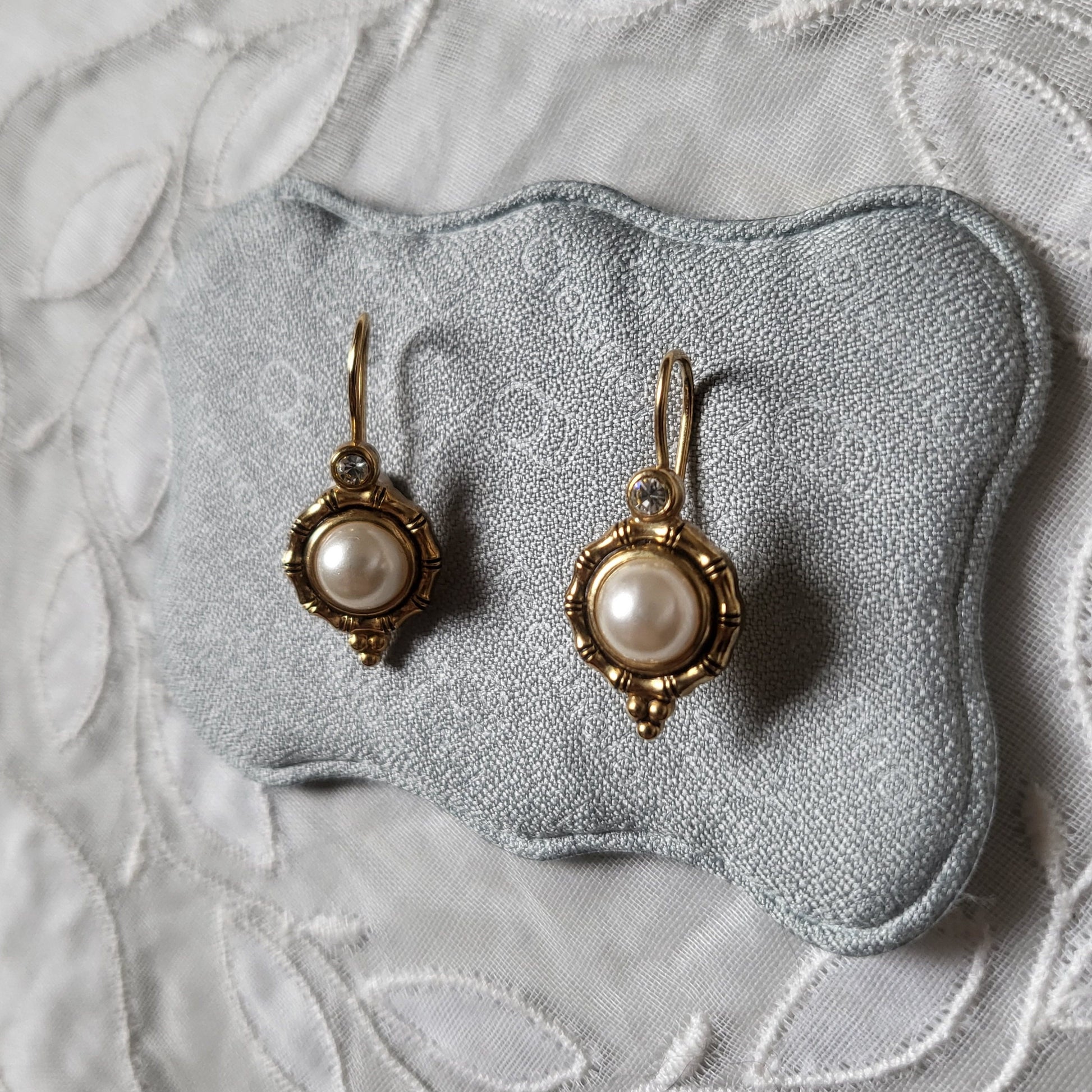 A dainty pair of bamboo bezel design hook earrings with crytal and faux pearl cabochon on gold plated metal