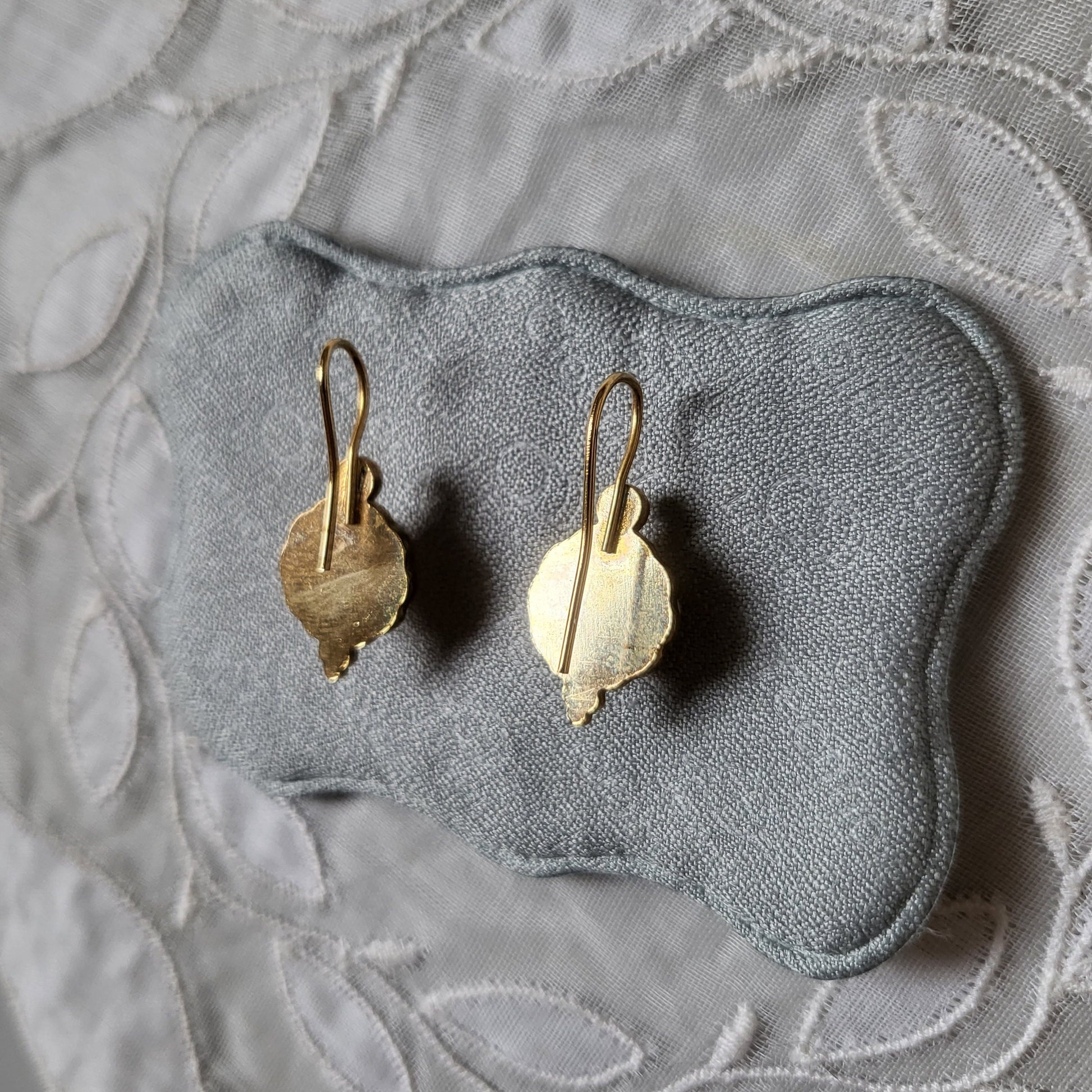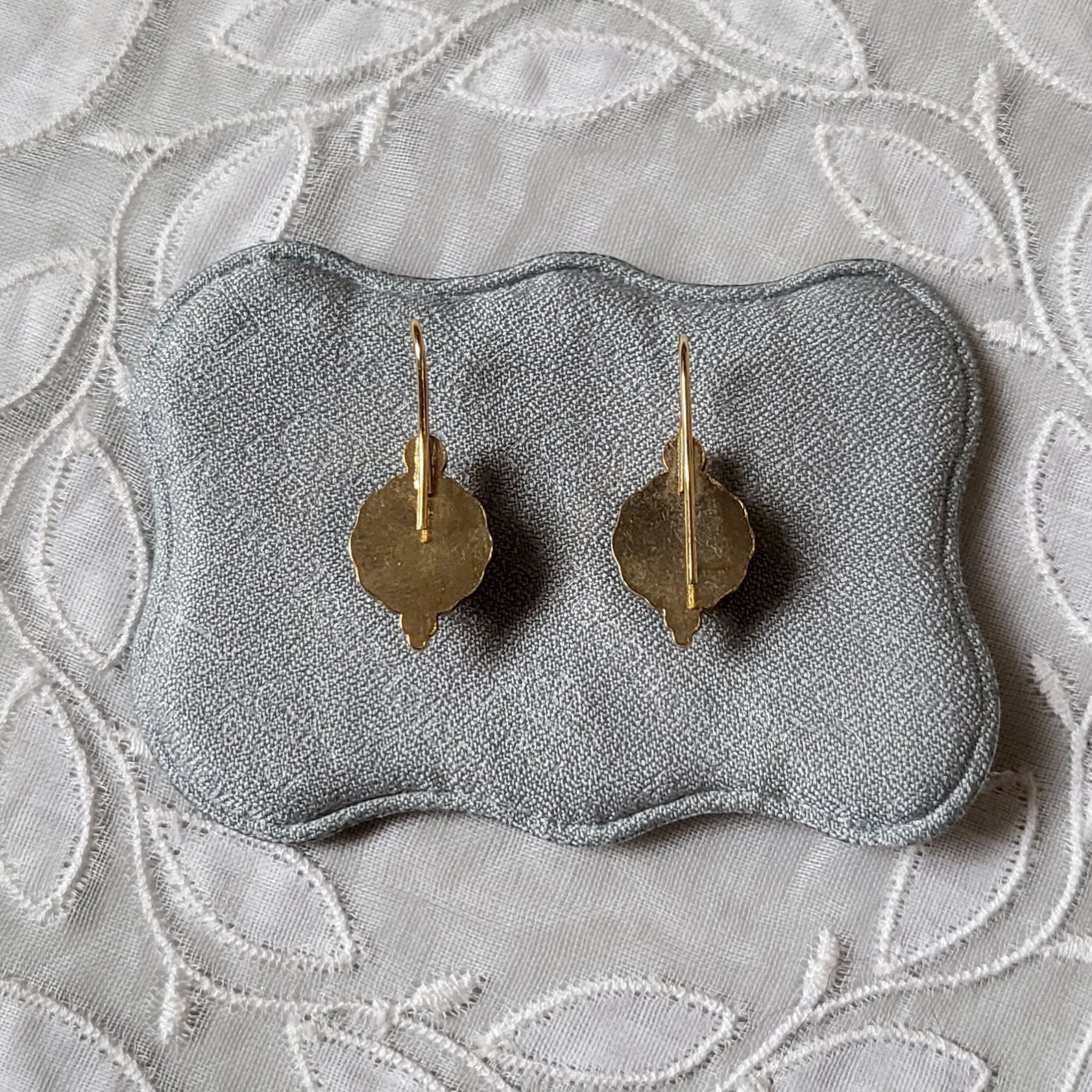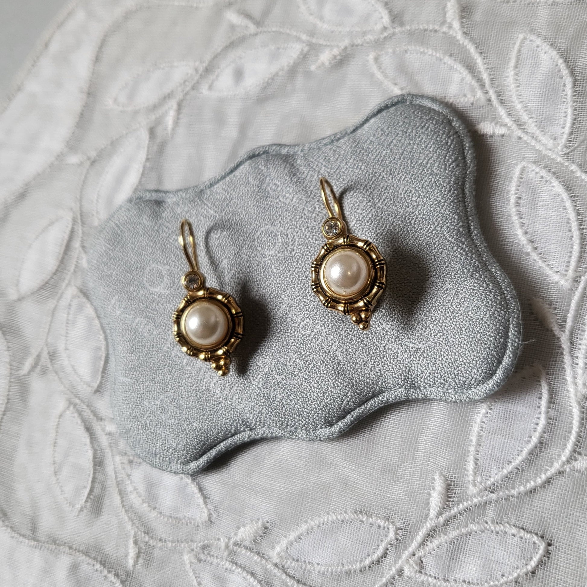 A dainty pair of bamboo bezel design hook earrings with crytal and faux pearl cabochon on gold plated metal