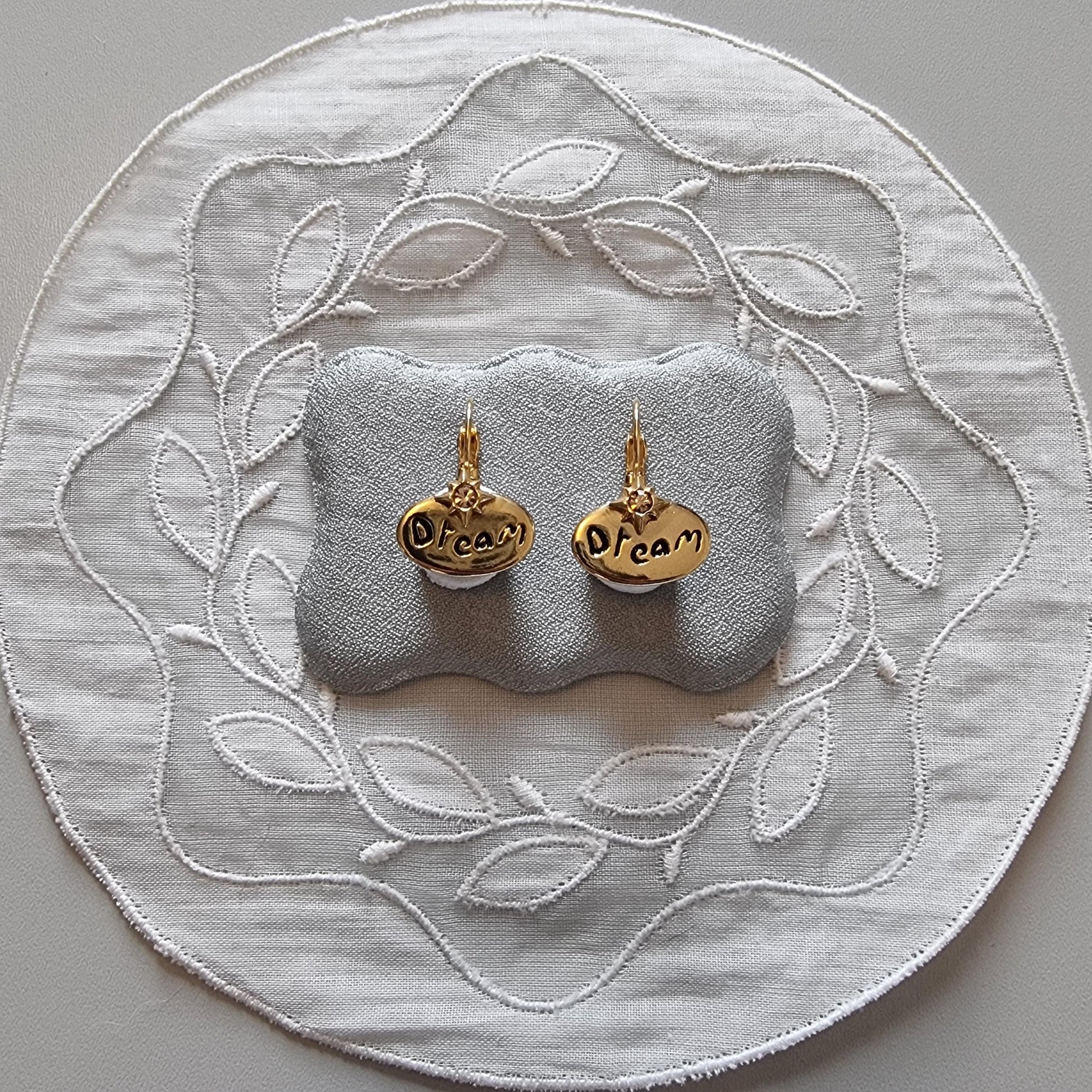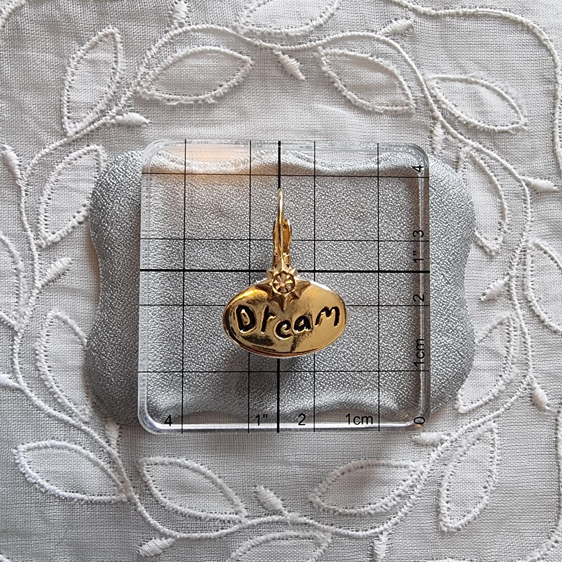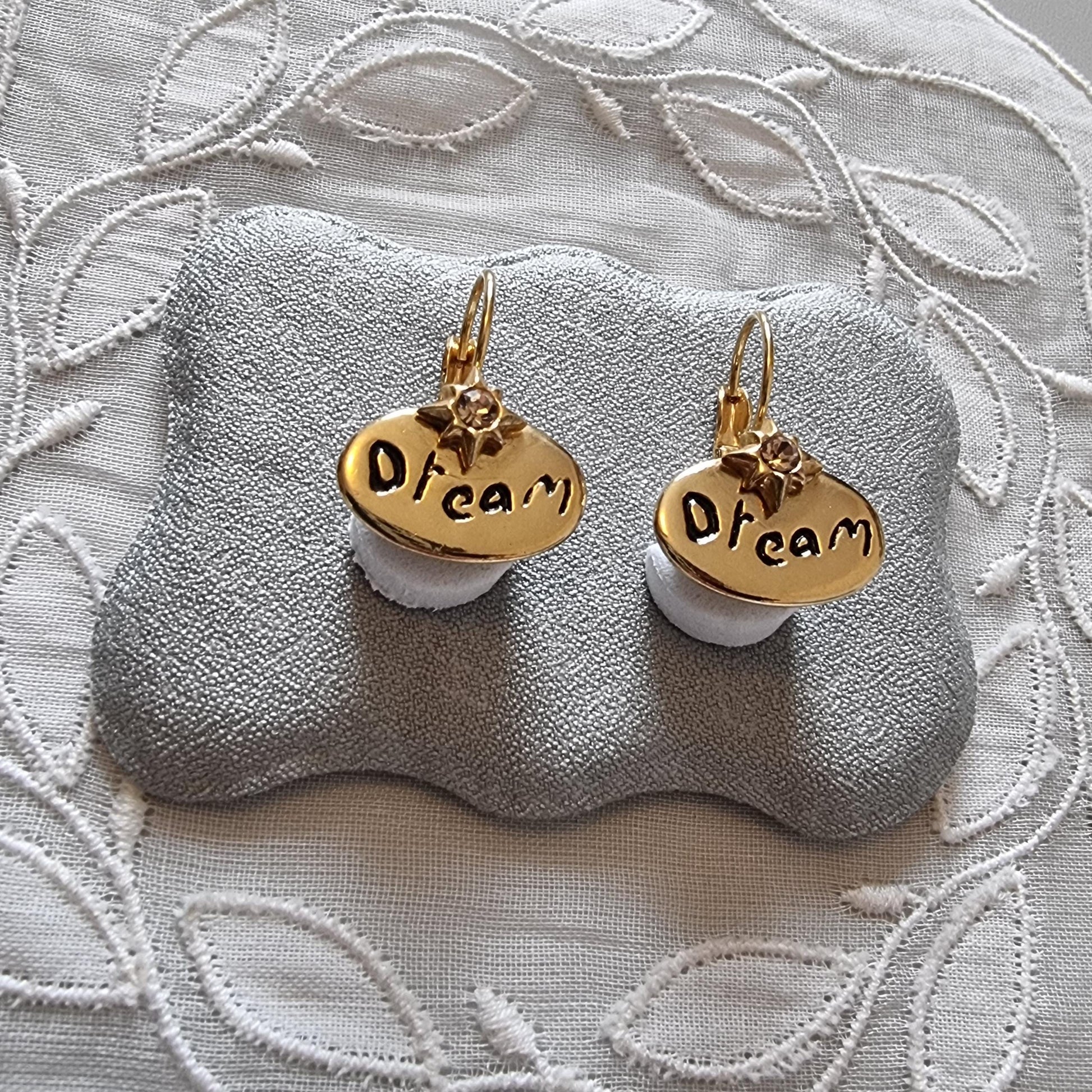 A sweet pair of earrings by Kirks Folly with a word 'Dream' accented with aurora borealis crystal on gold plated metal