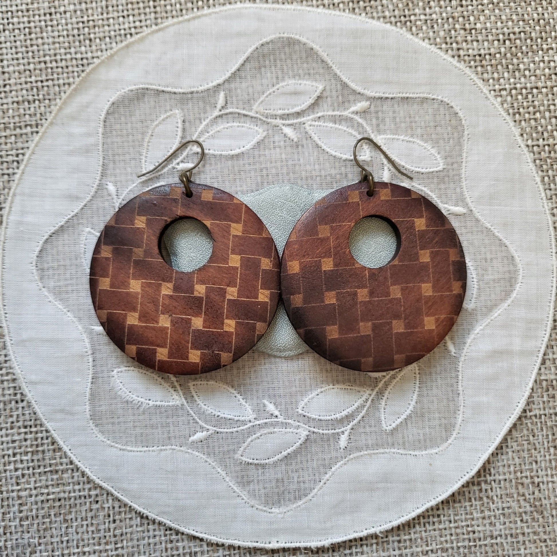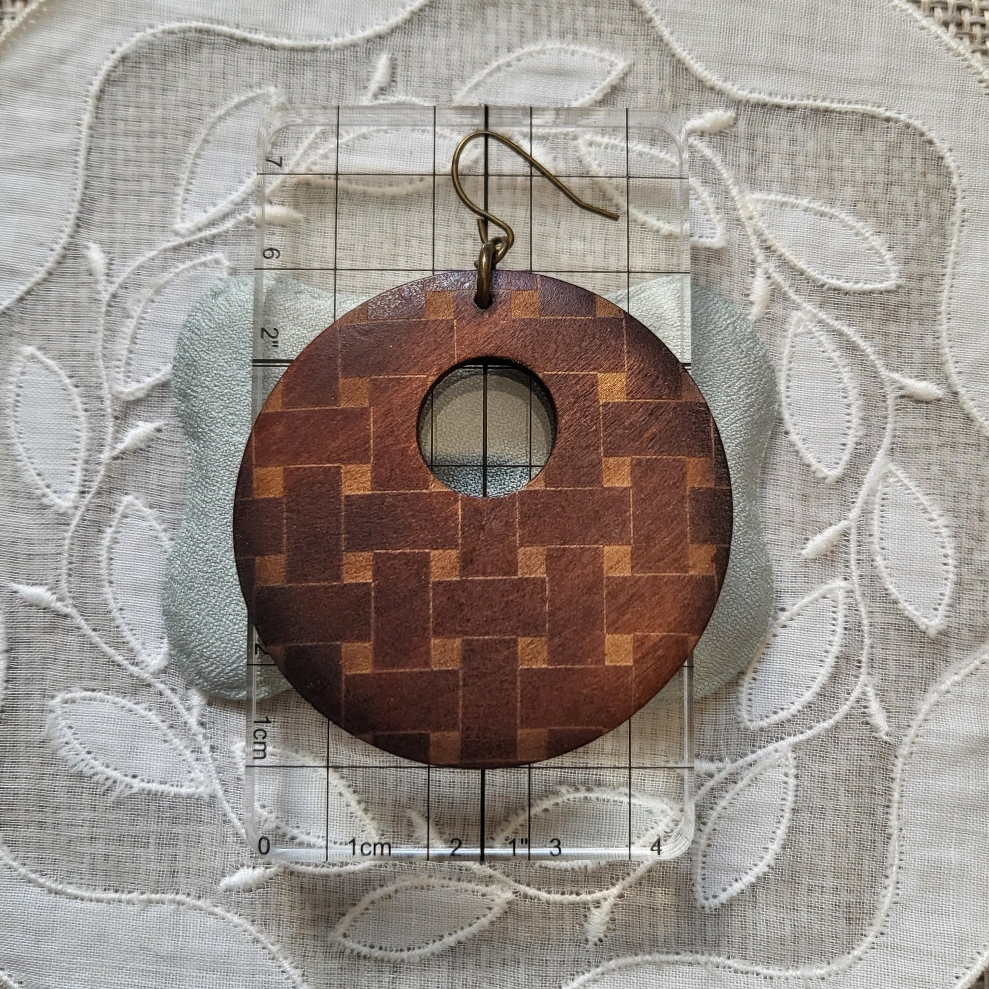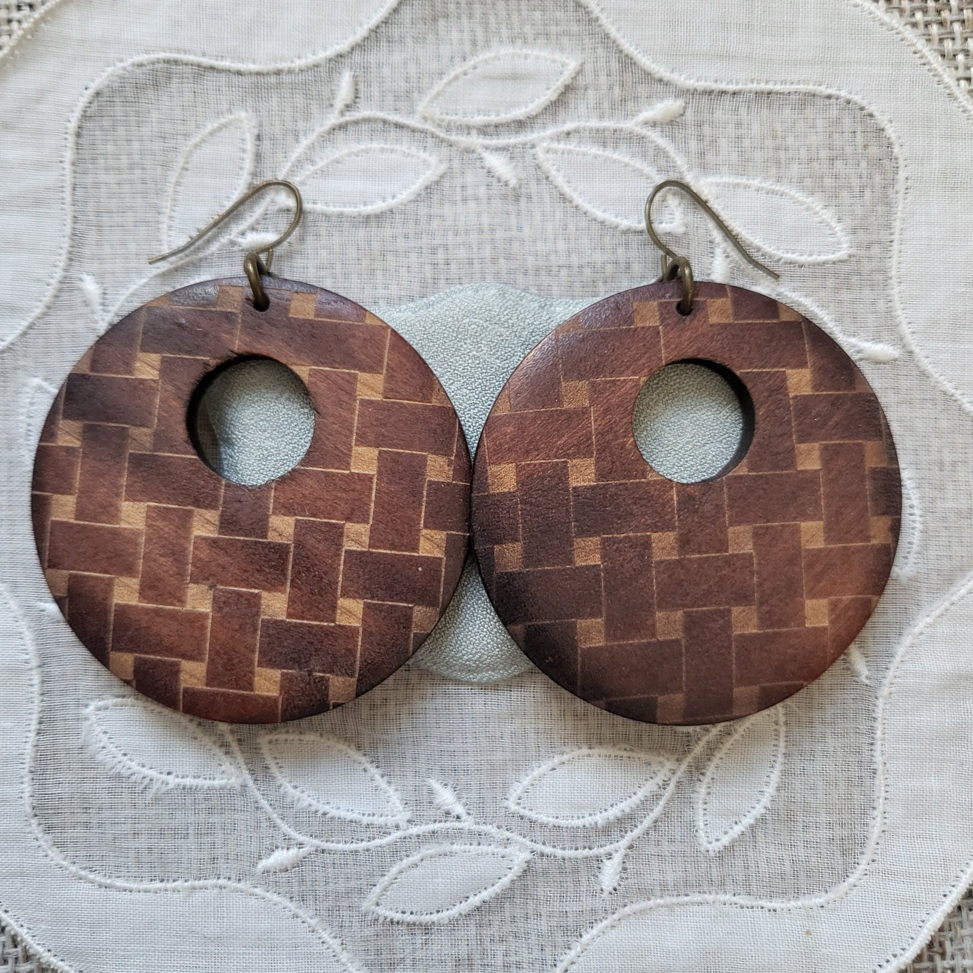 A cool pair of hook earrings with laser ingraved textured wood disks on brass jewellery metal