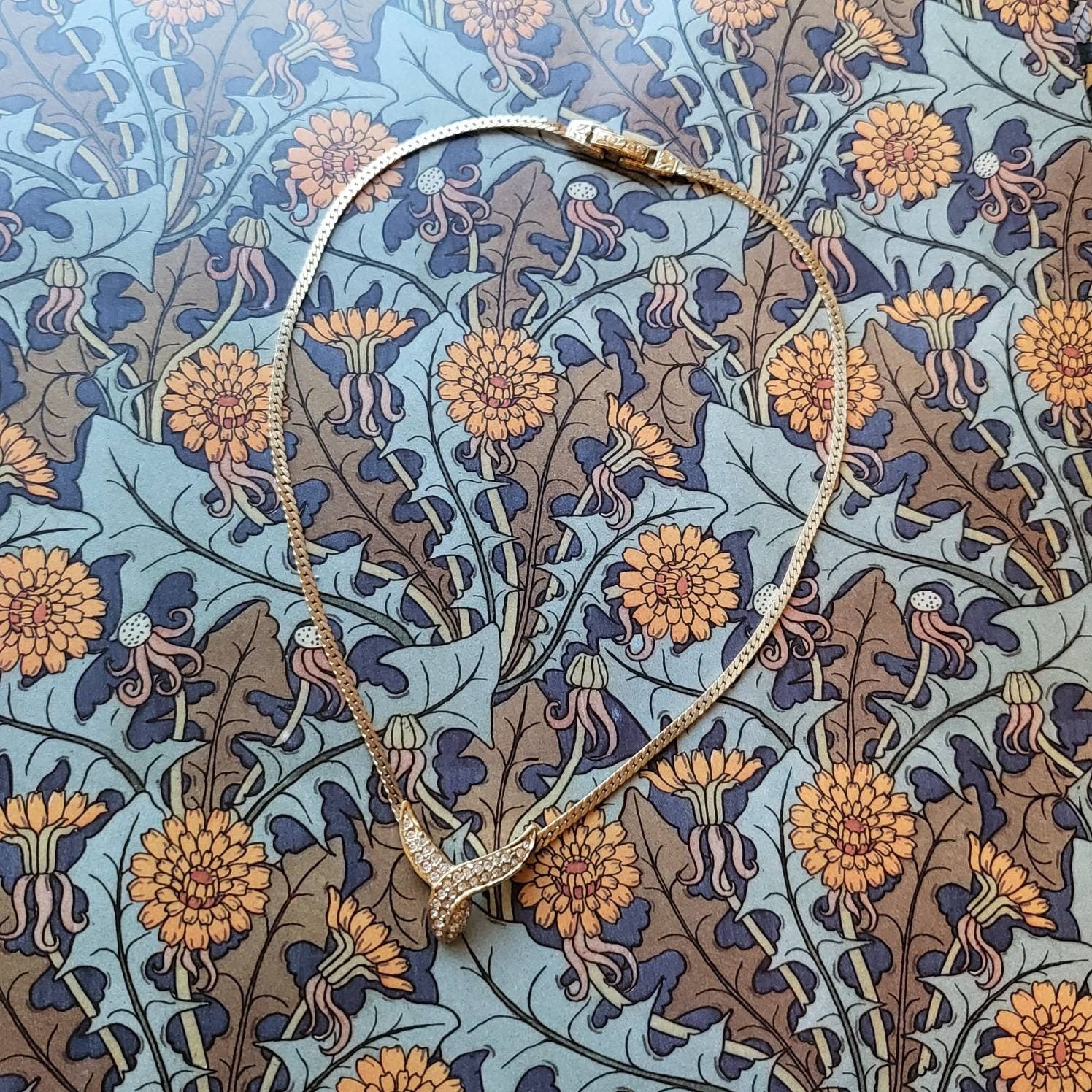 An elegant gold necklace by Attwood and Sawyer with crystal encrusted ribbon centre in 22ct gold plated metal