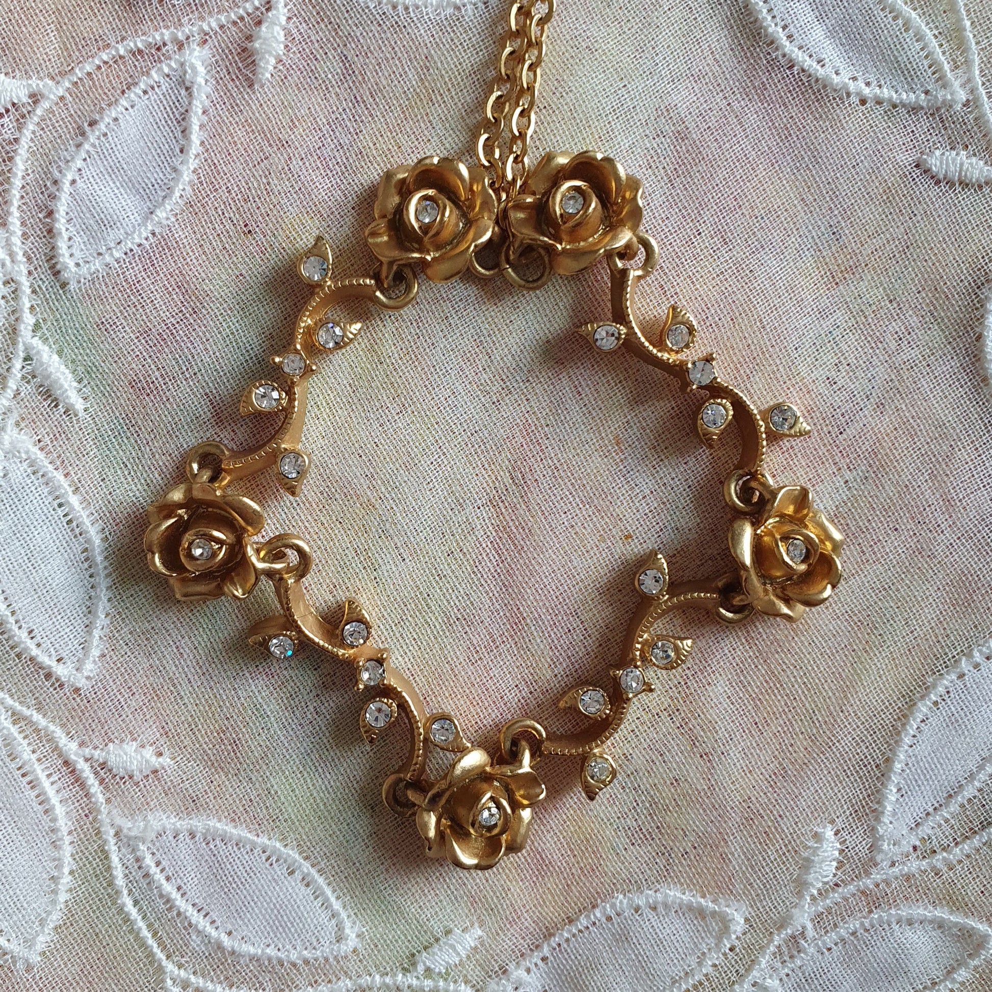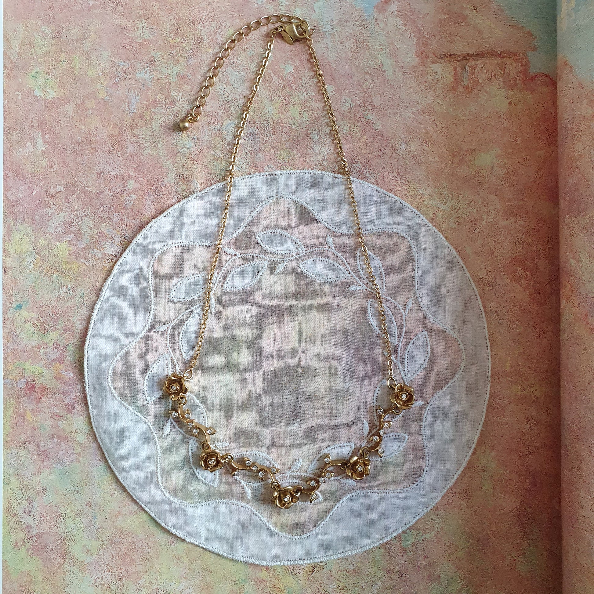 A very sweet rose vine necklace with clear crystal accented matte gold plated base metal
