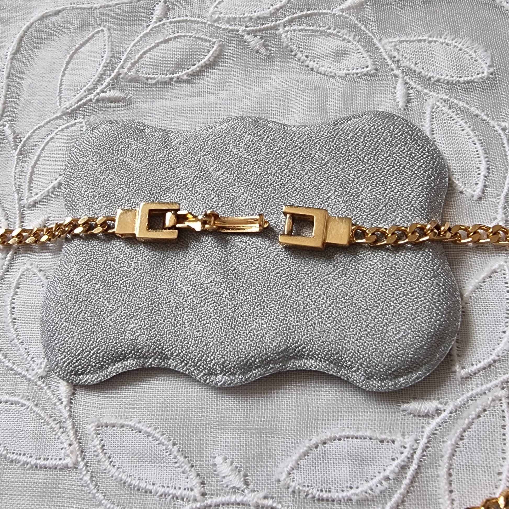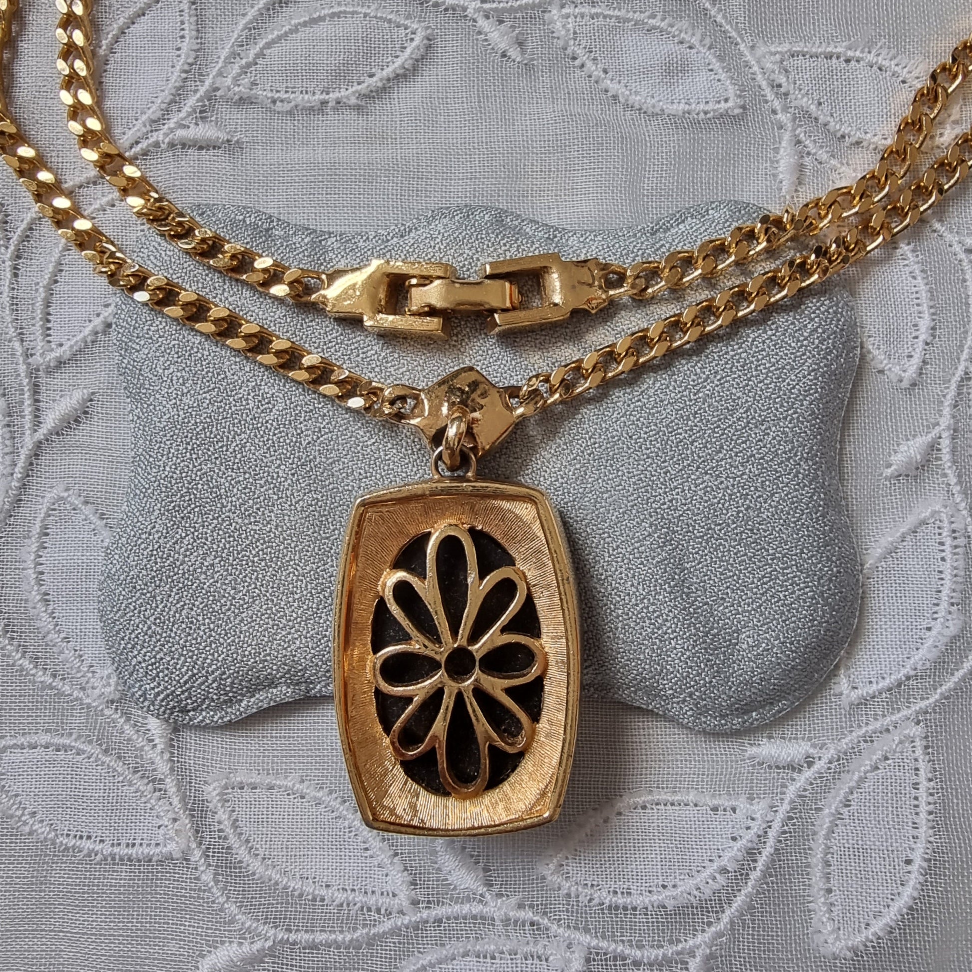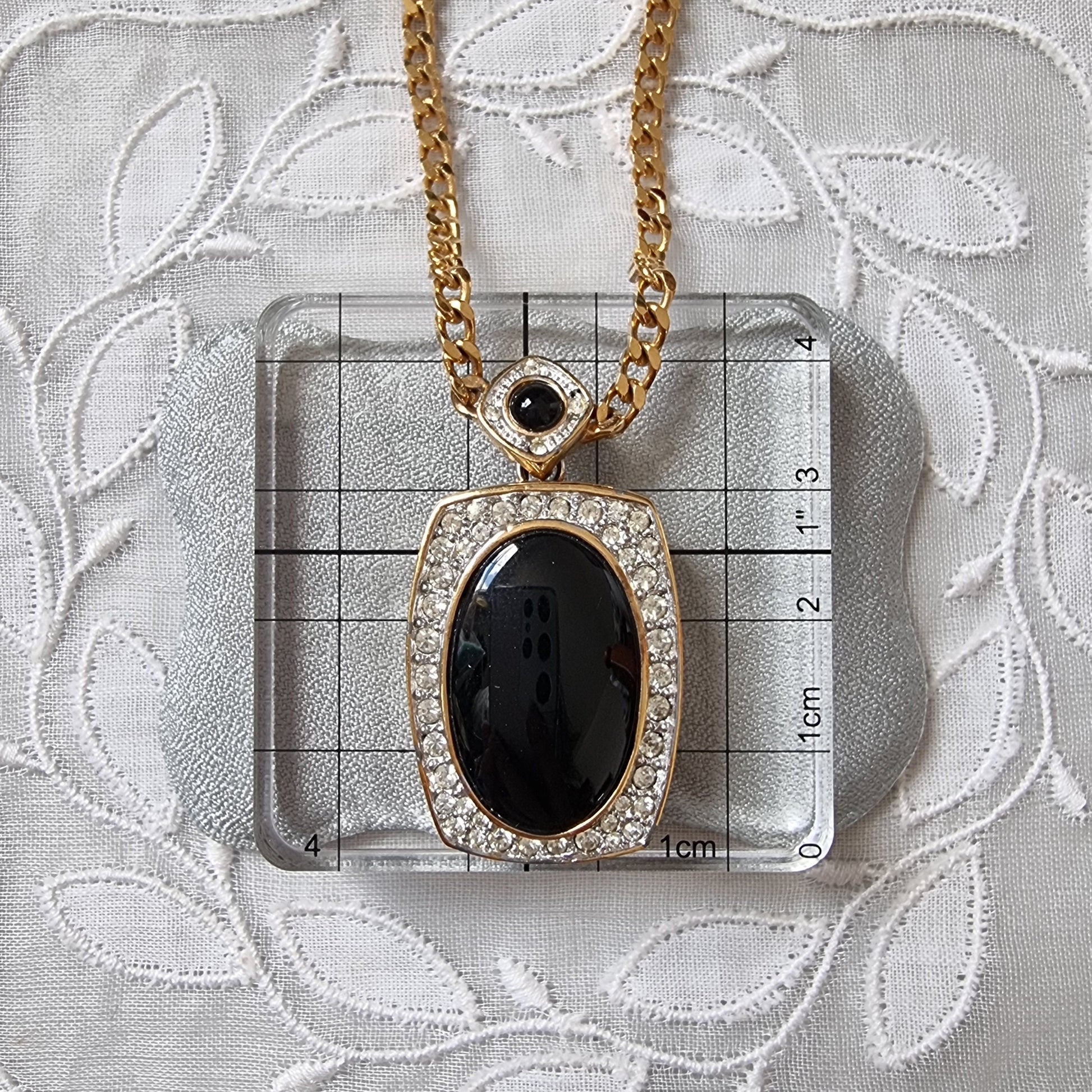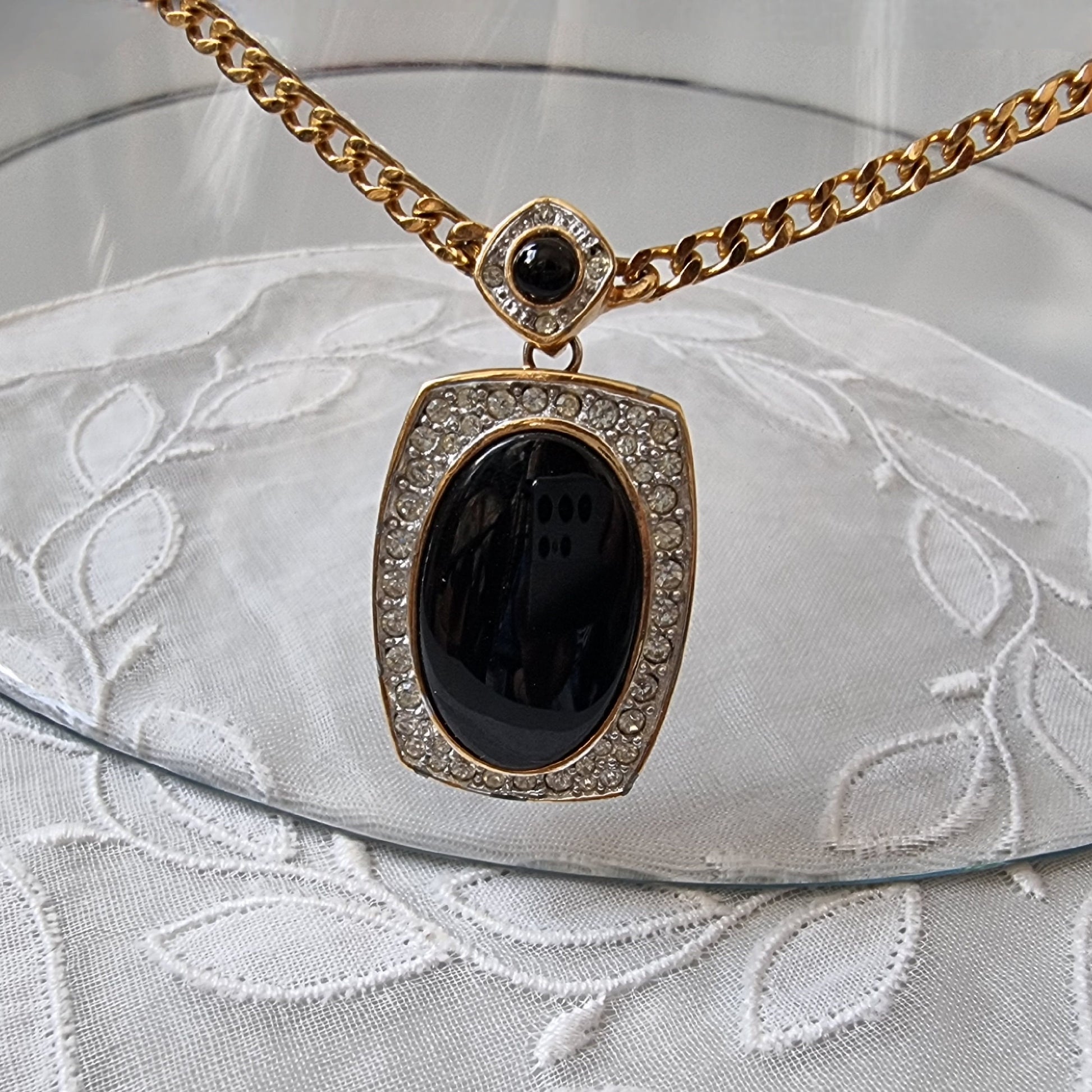 A stunning pendant necklace with black cabochon stones surrounded by small clear crystals on gold plated metal
