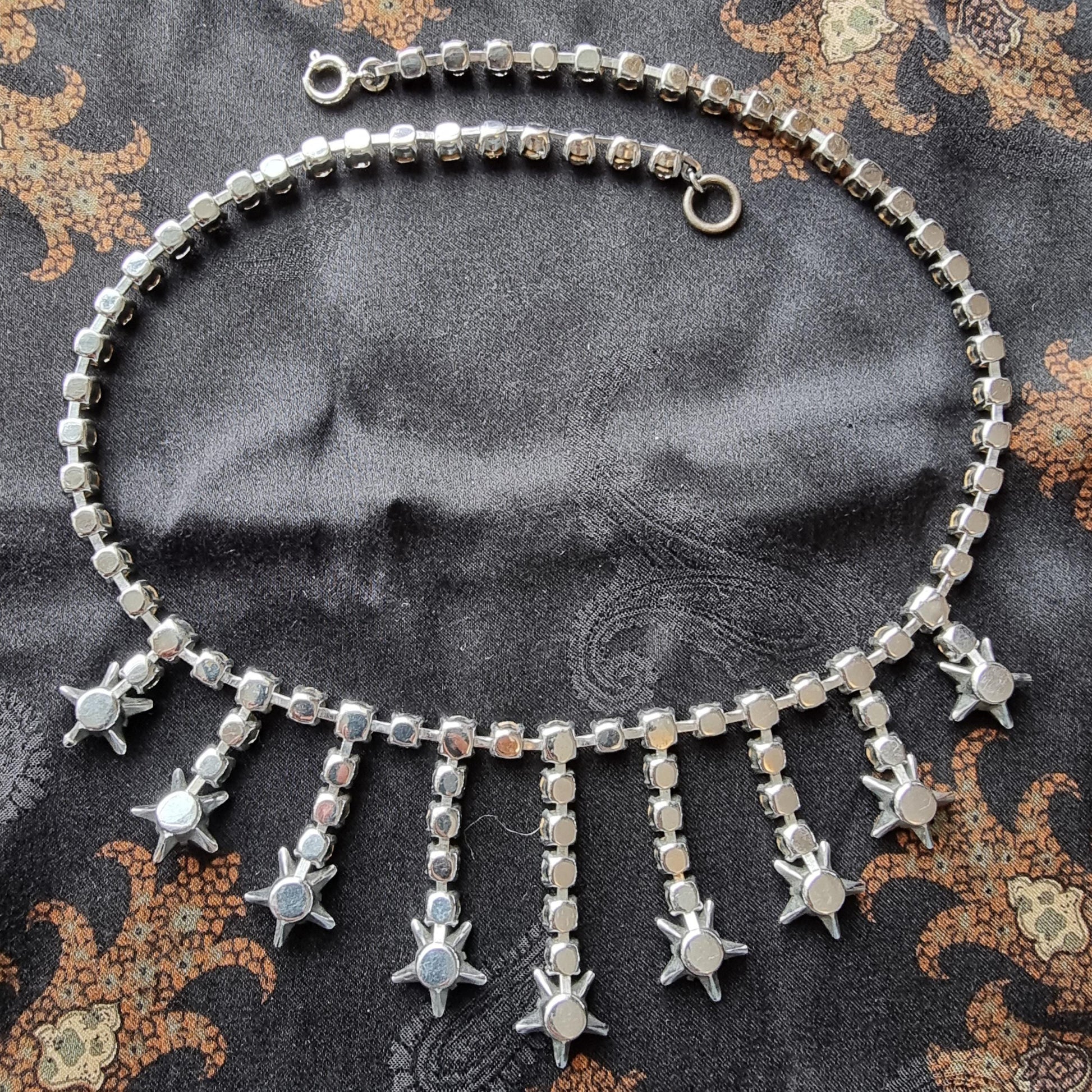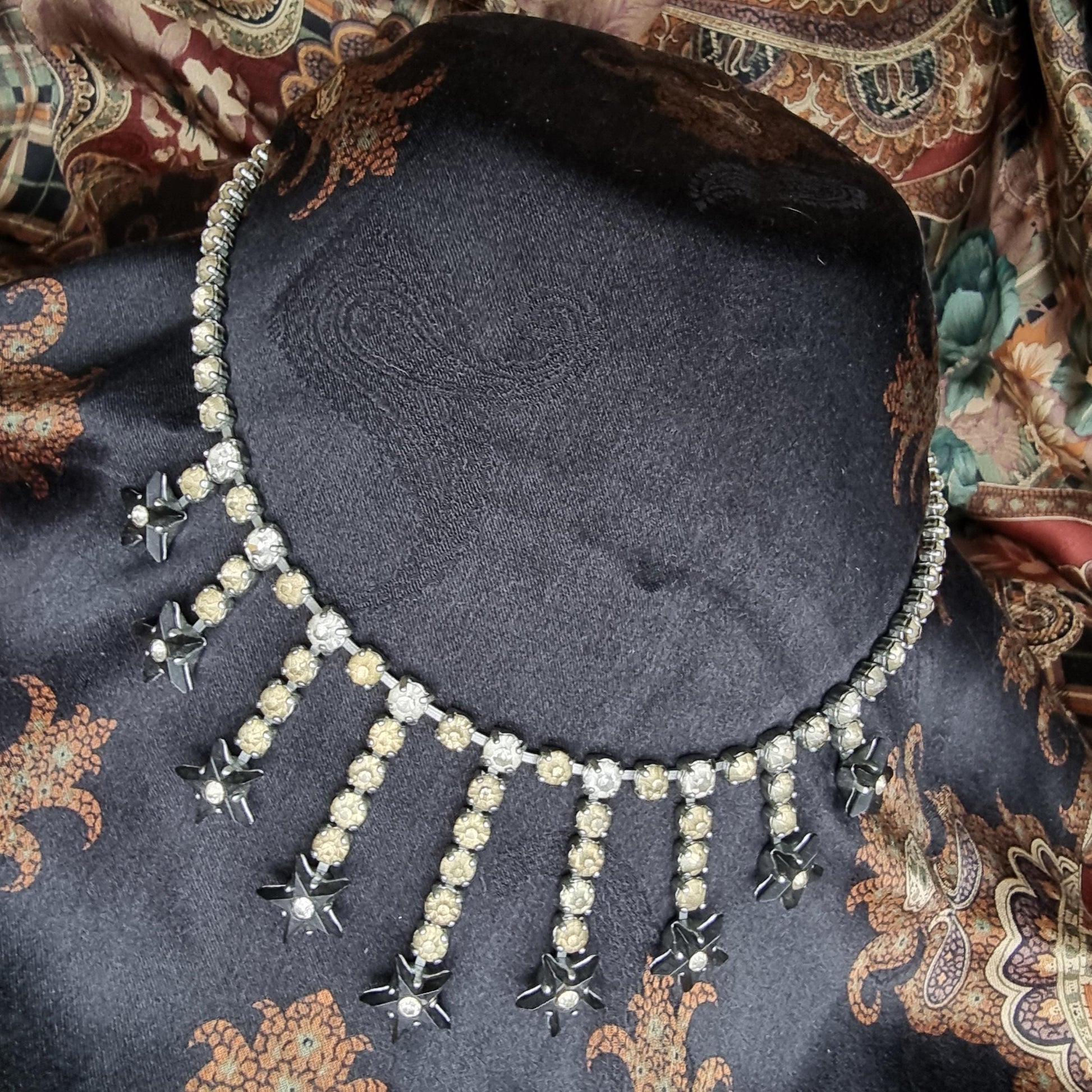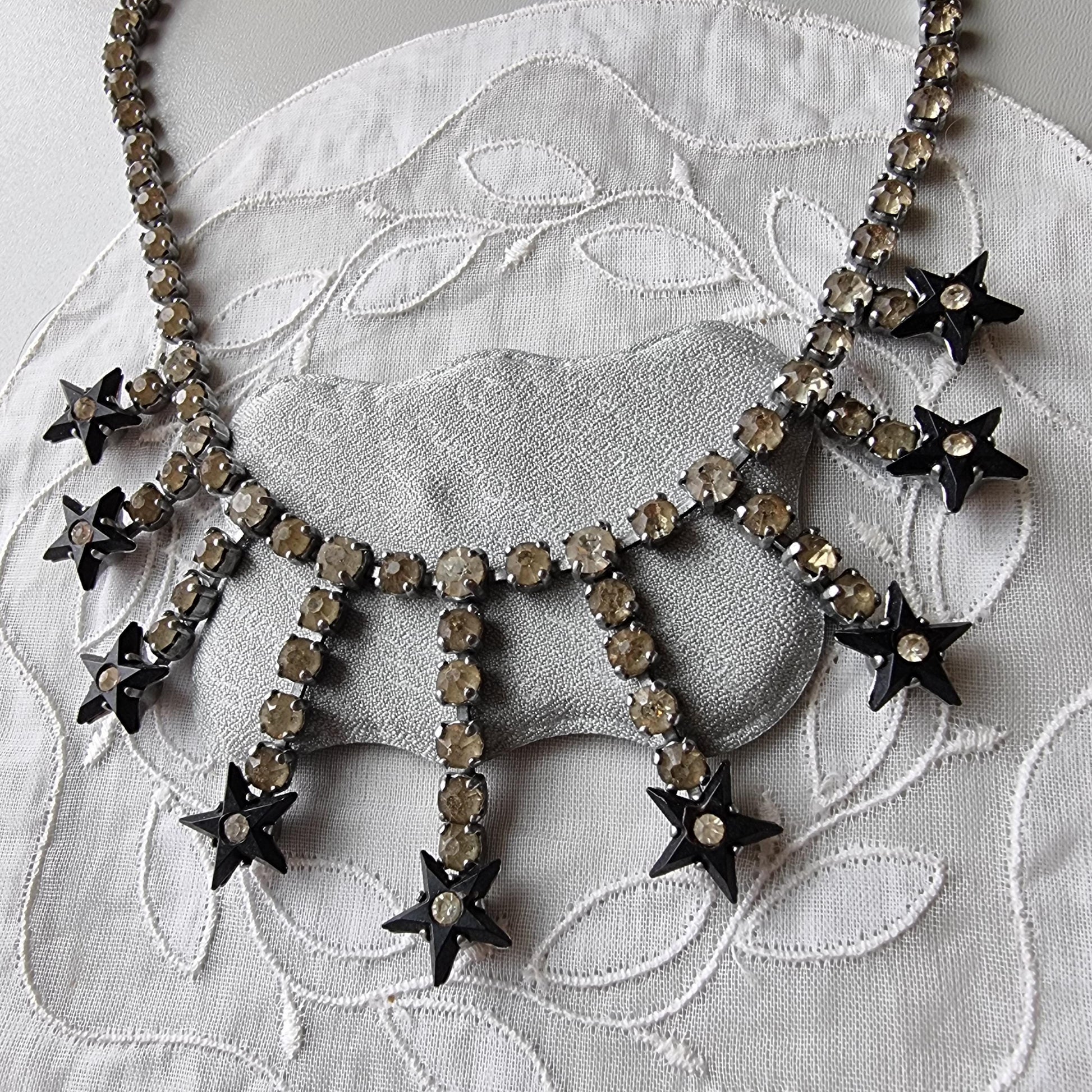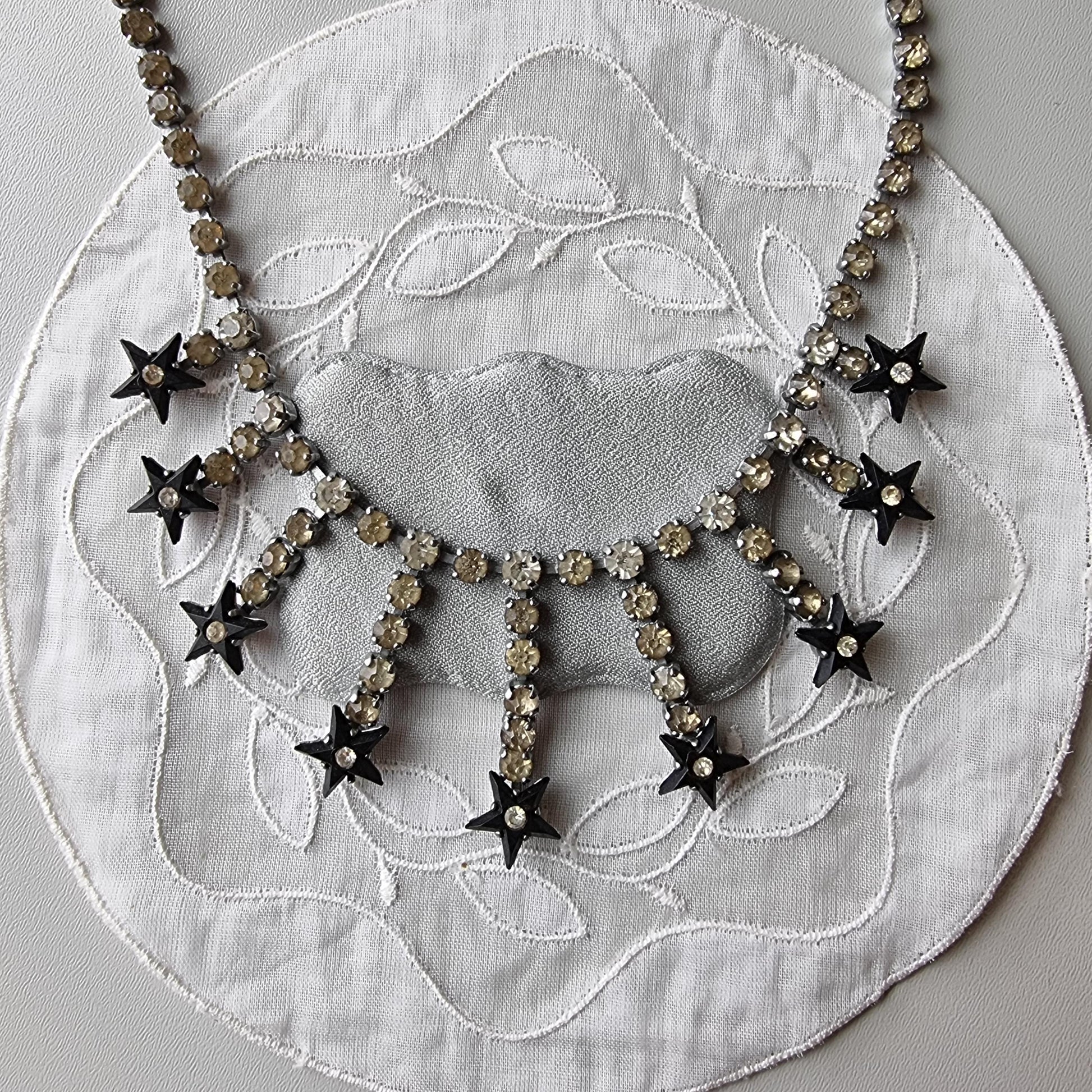 A gorgeous star drops necklace with black star crystals and clear crystals set on rhodium plated metal