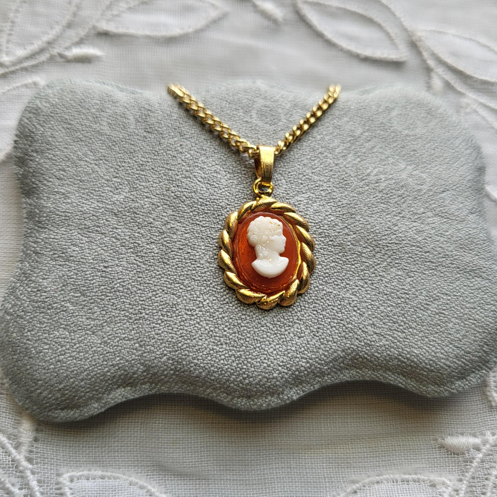 A beautiful small sized pendant necklace with a white and brown and white acrylic side face cameo on gold plated metal