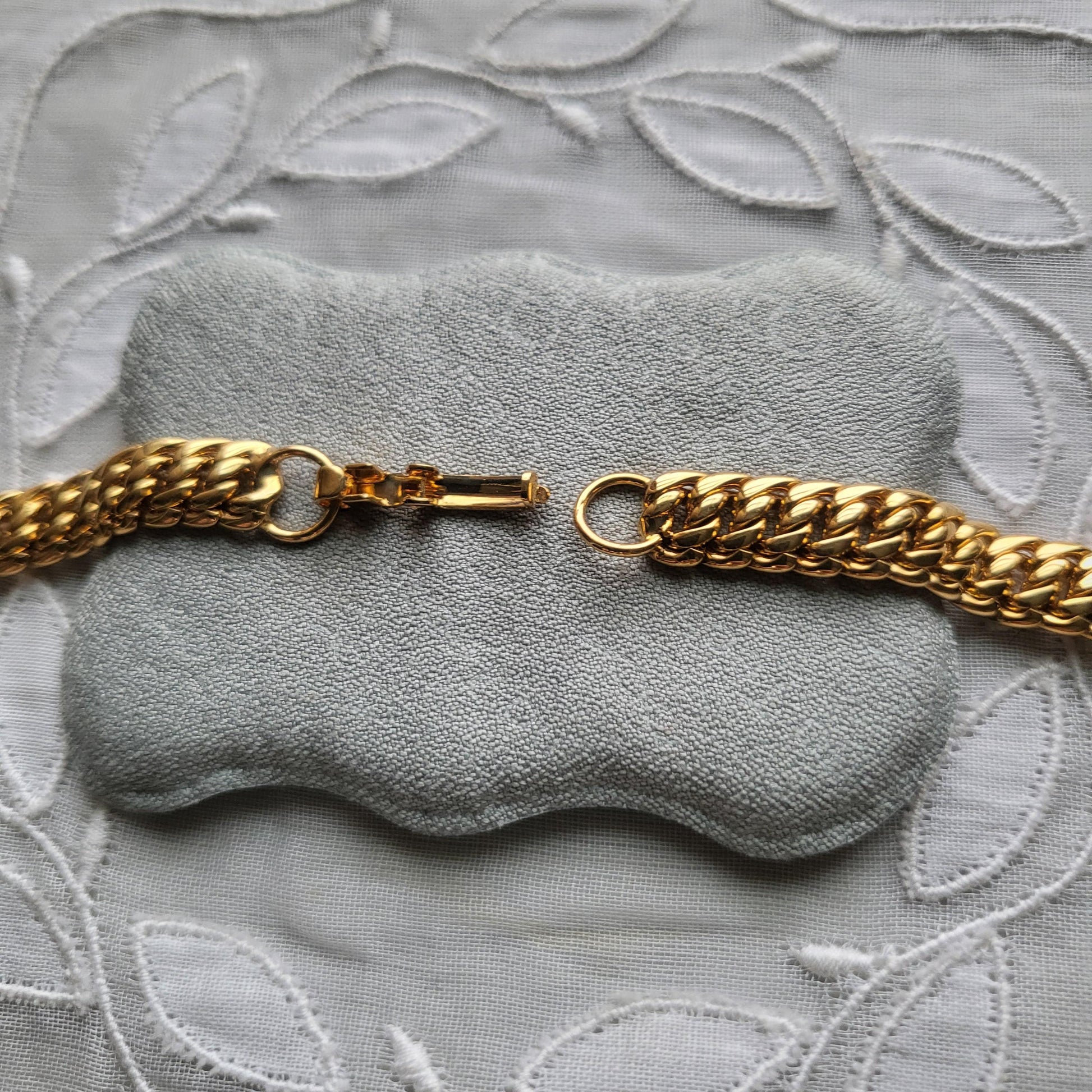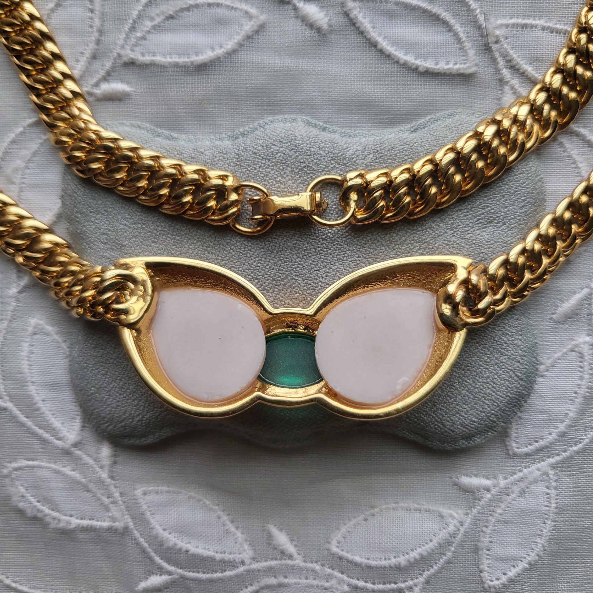 A gorgeous statement necklace with a green and white cabochons on gold plated metal chain