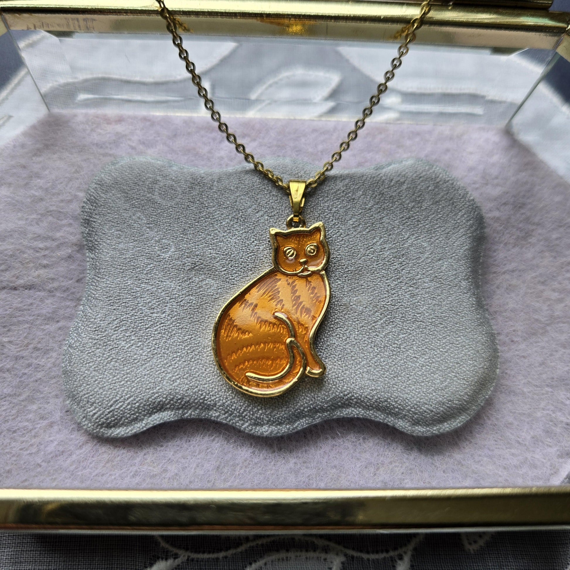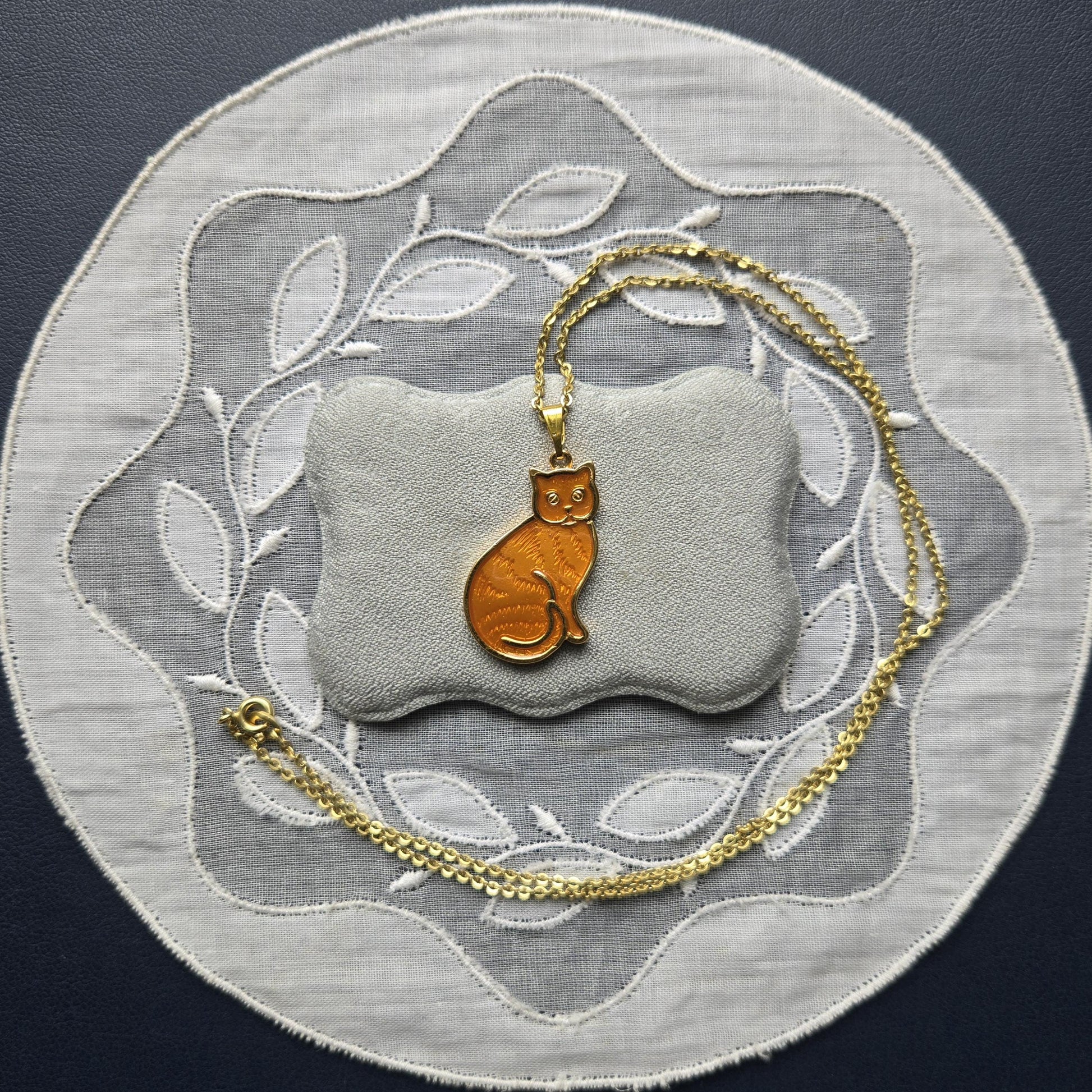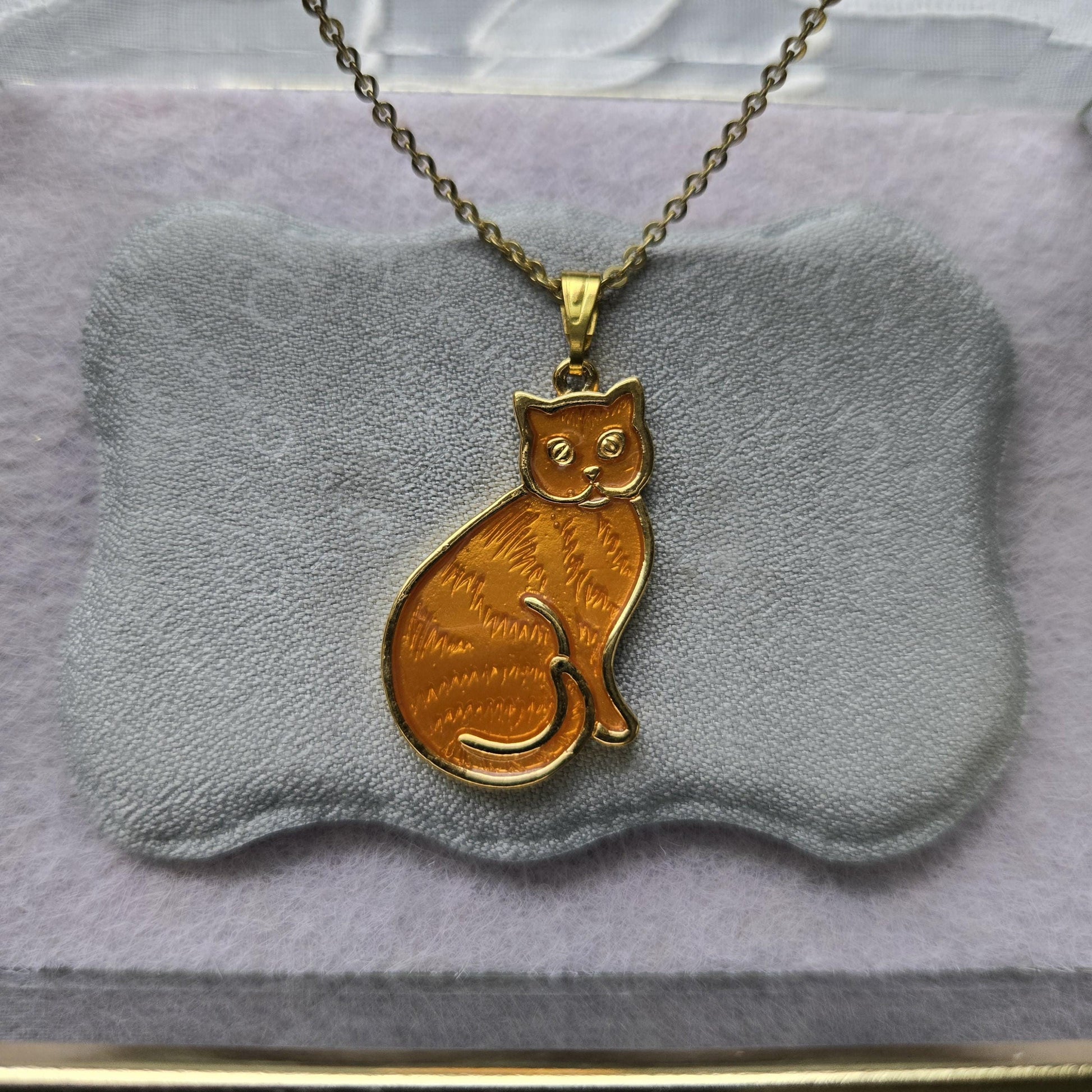 A sweet cat pendant necklace with orange enamel on gold plated metal chain