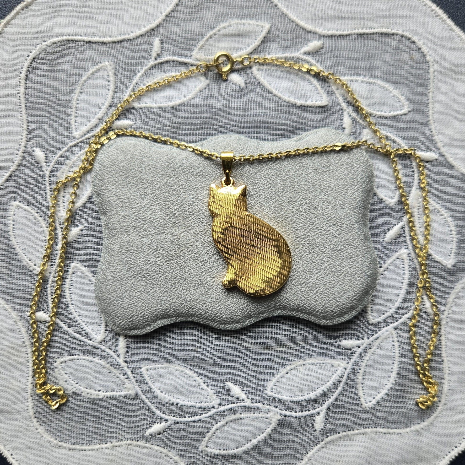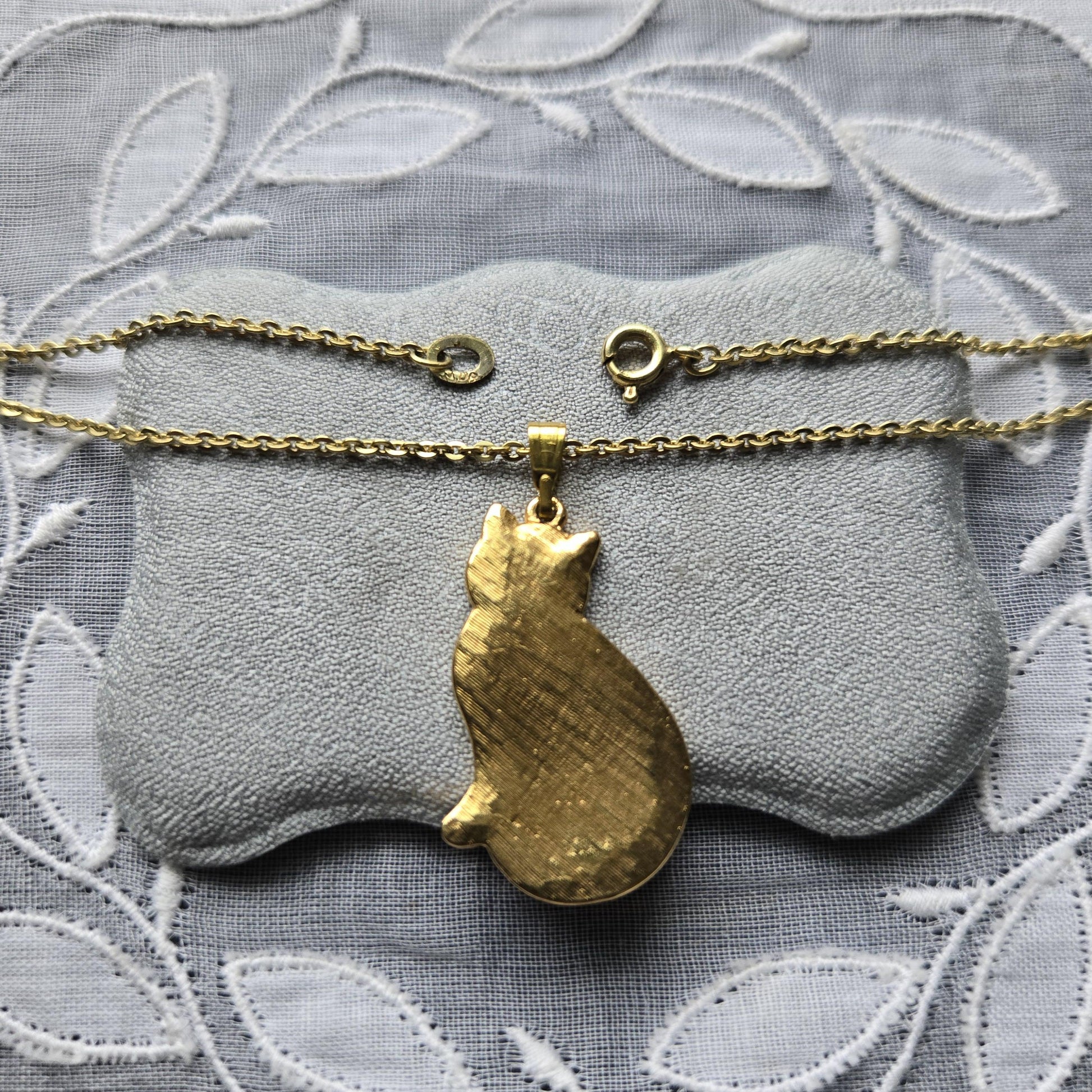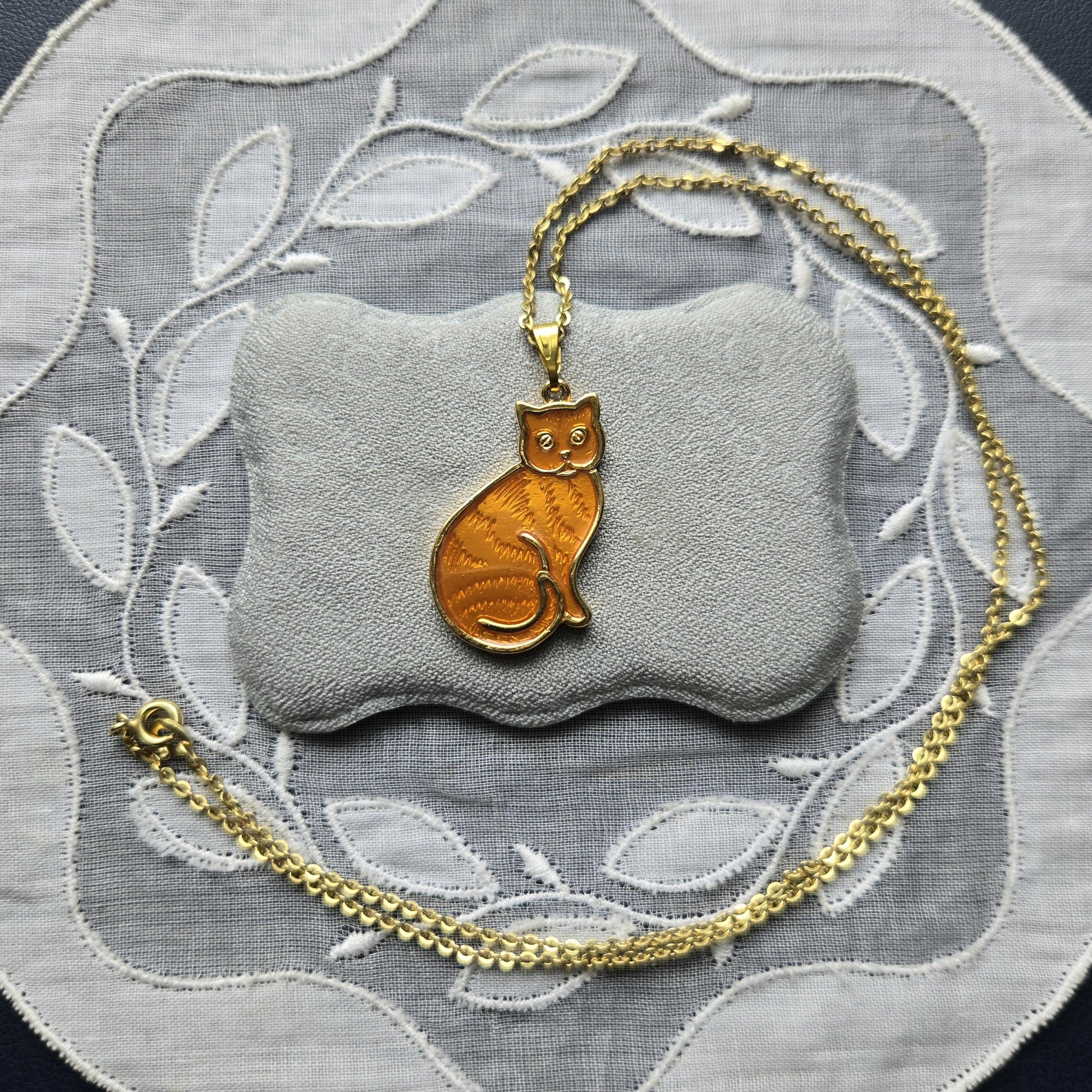 A sweet cat pendant necklace with orange enamel on gold plated metal chain