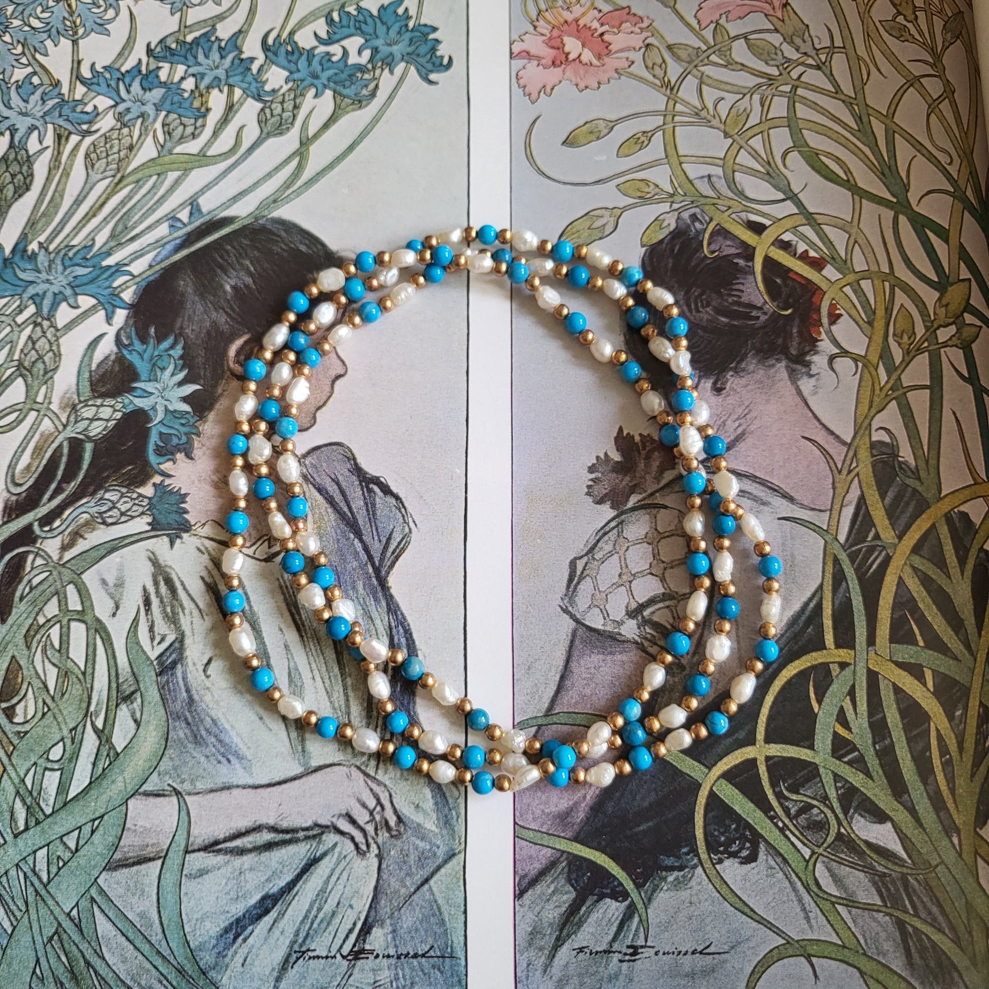 A simple but colourful long beads necklace with alternating rice pearls, turquoise and gold plated metal beads. Can be worn wrapped around more than once