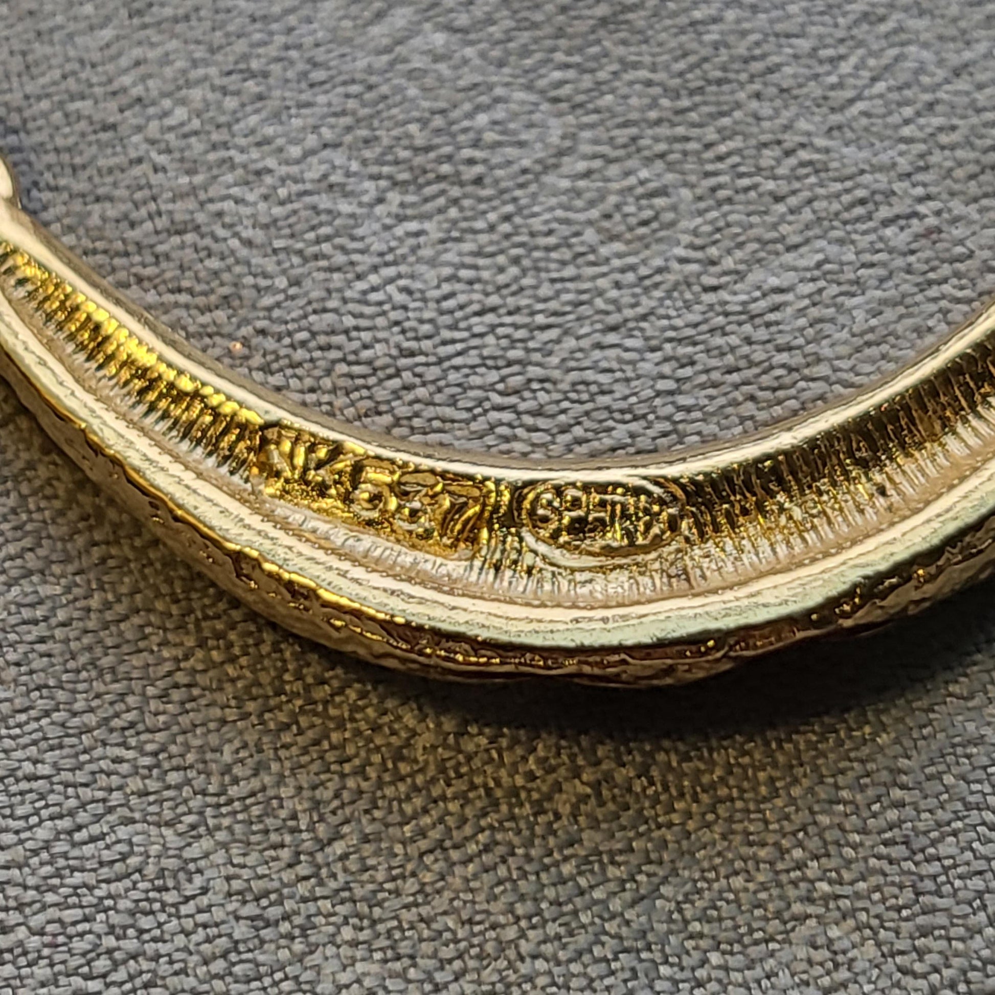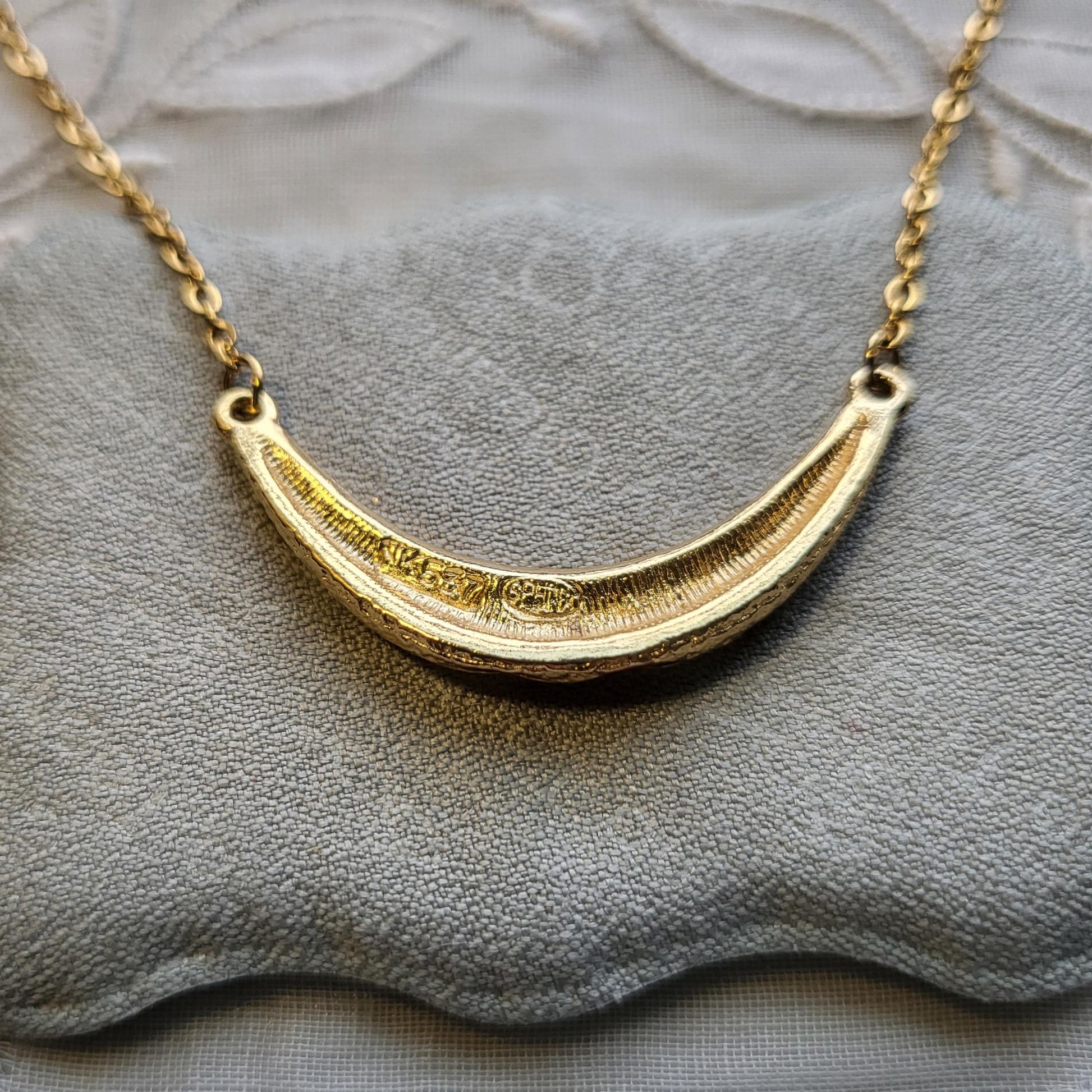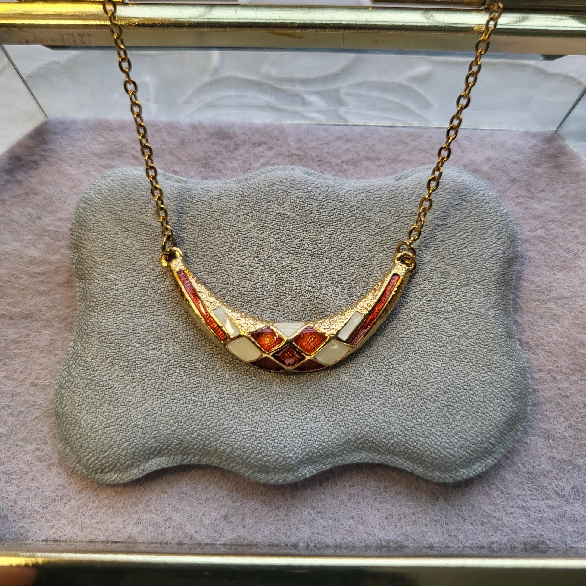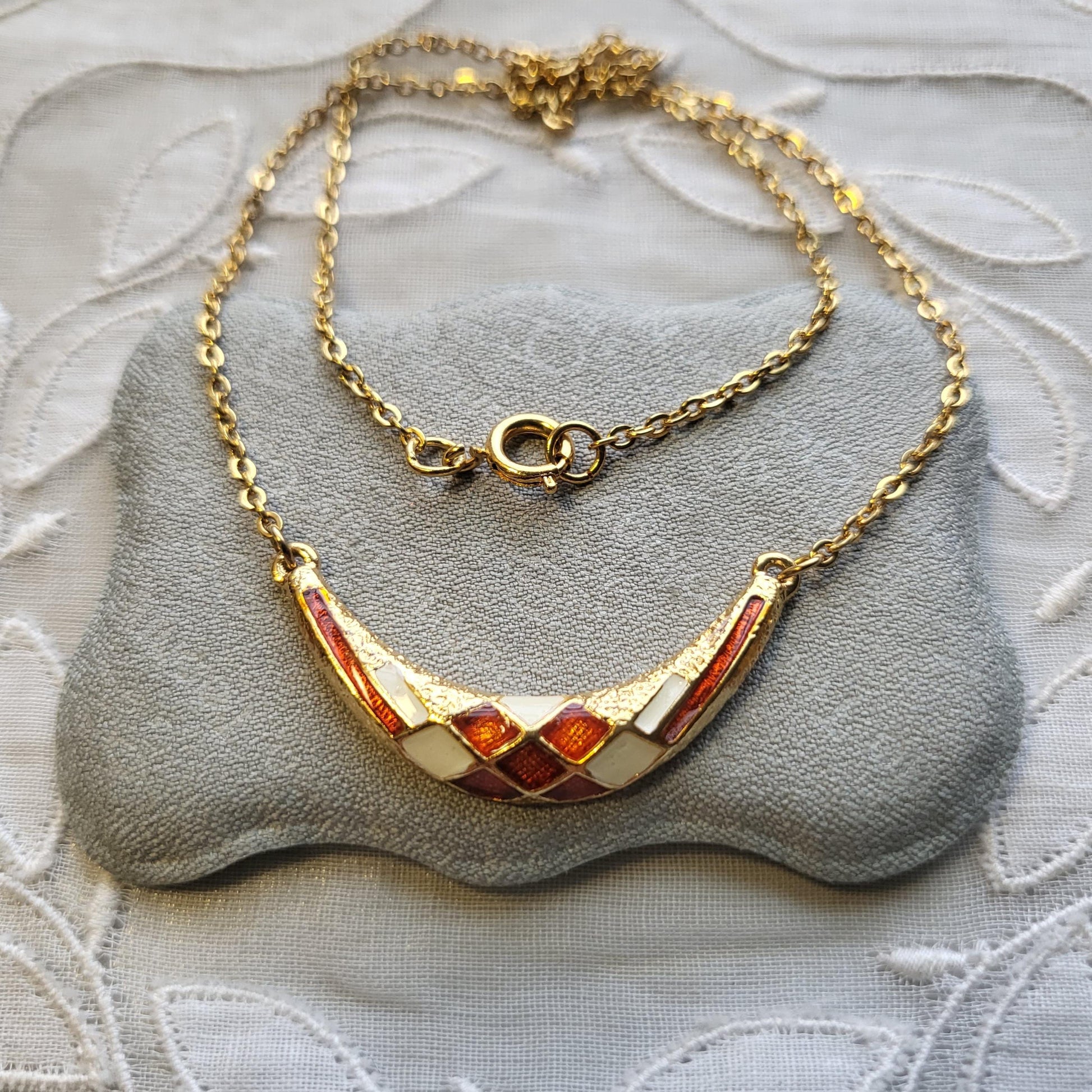 A beaufitul small bib pendant necklace by Sphinx of London with orange red and white enamel in diamond pattern on gold plated metal