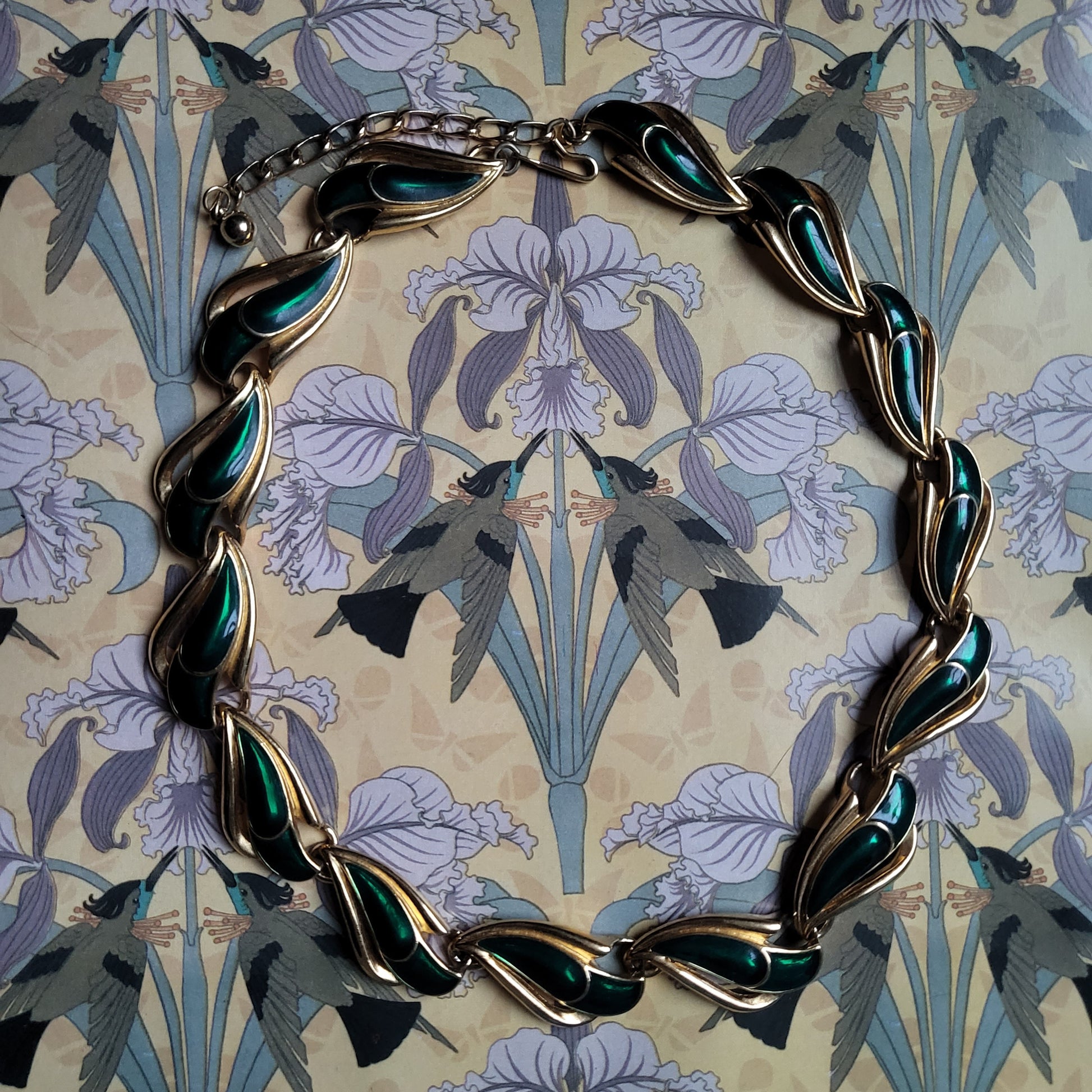 A lovely peacock green enamel link necklace in gold plated metal with adjustable length
