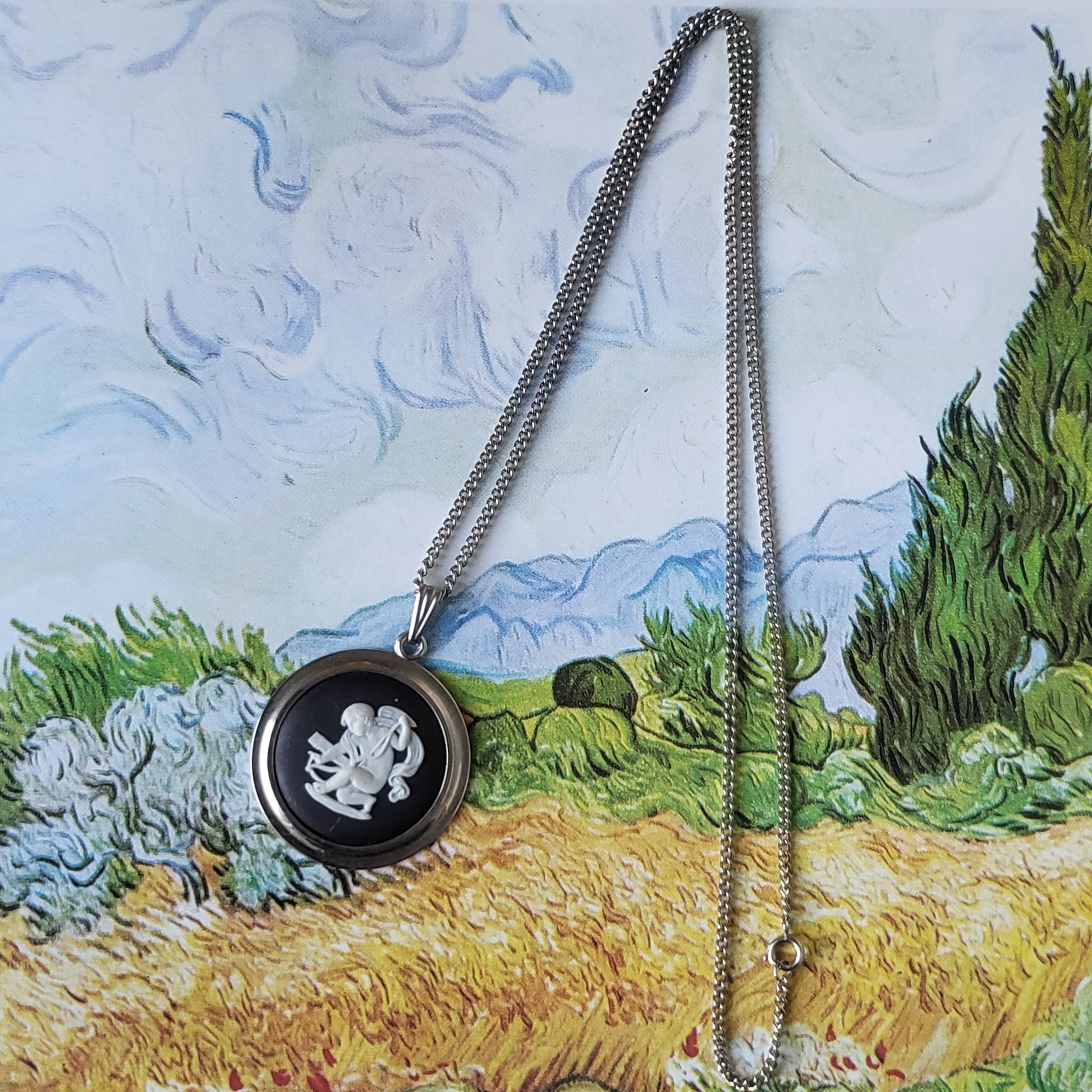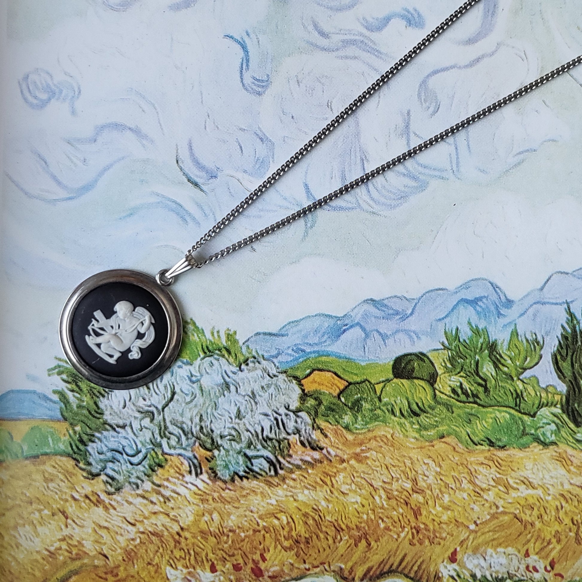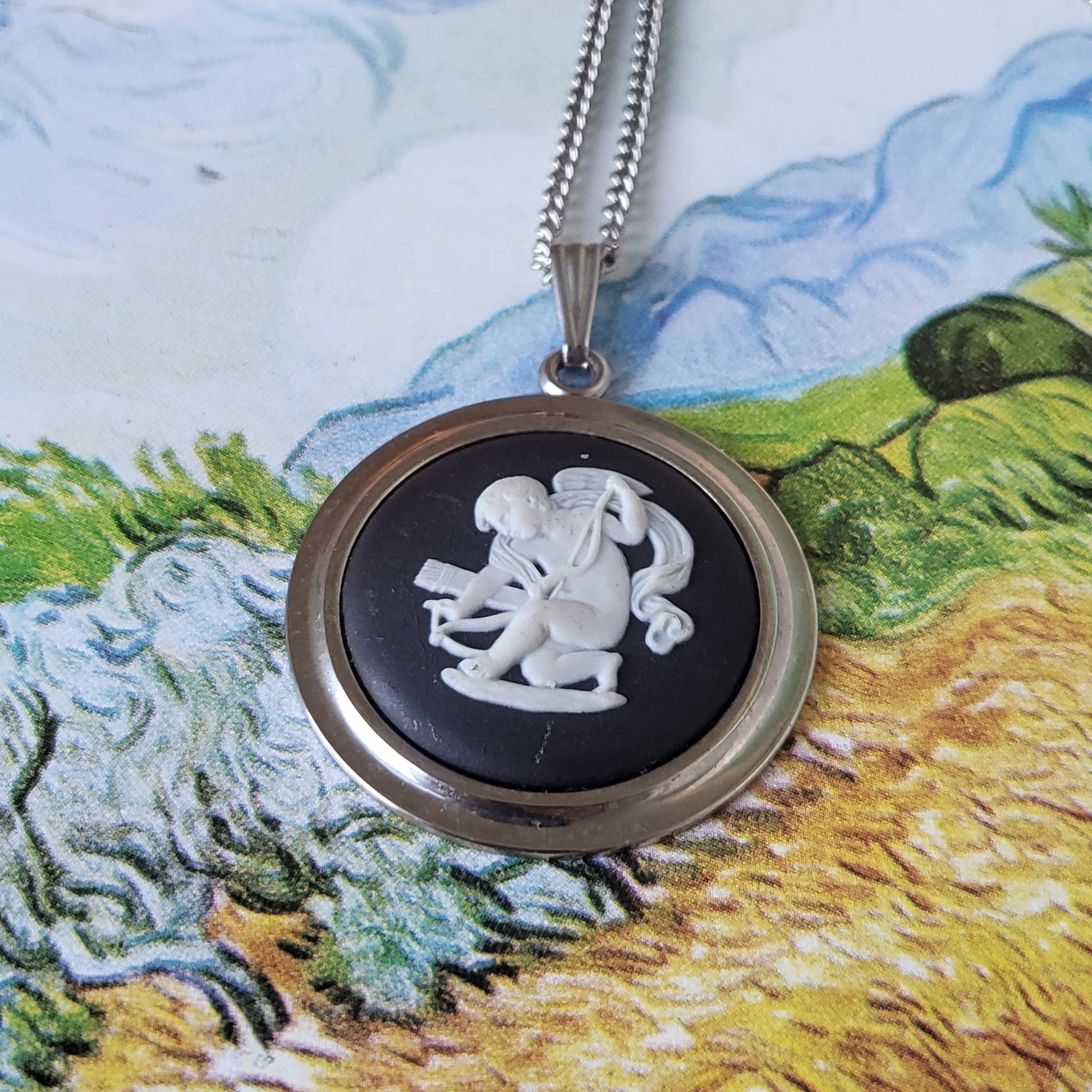 A beautiful necklace with a Wedgwood England black jasperware cherub cameo mounted on rhodium plated metal
