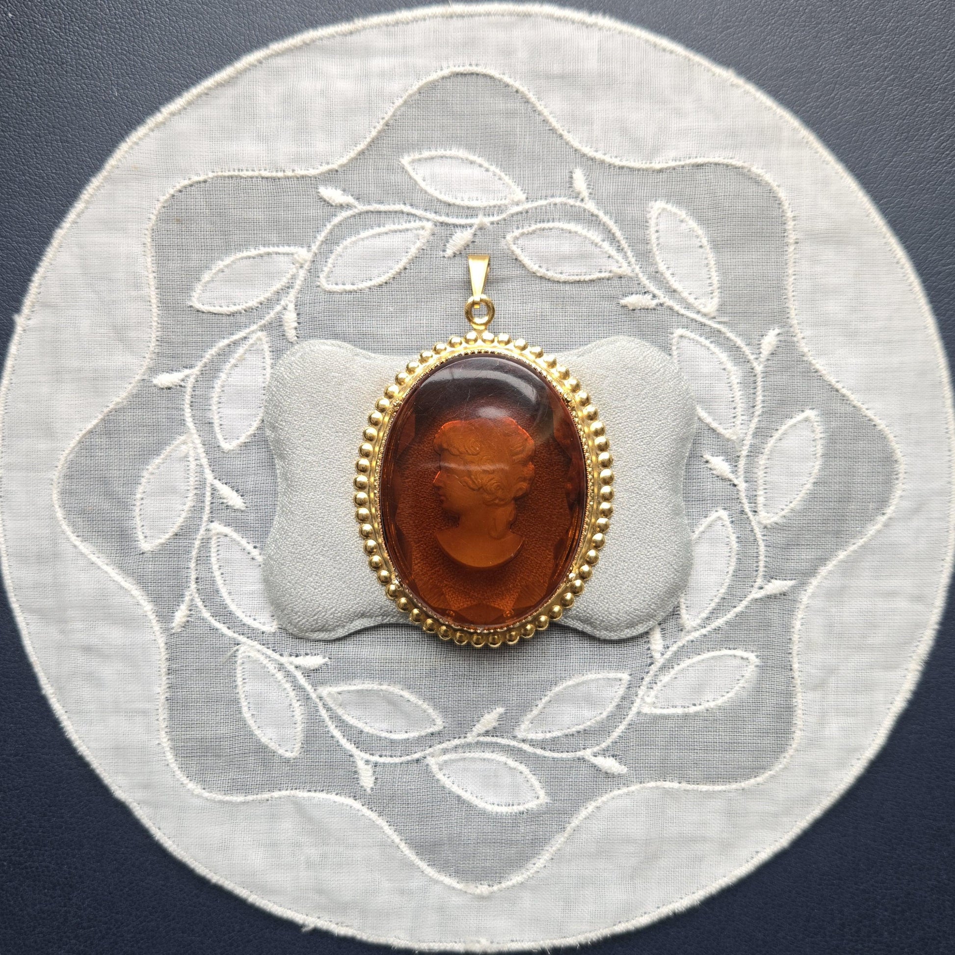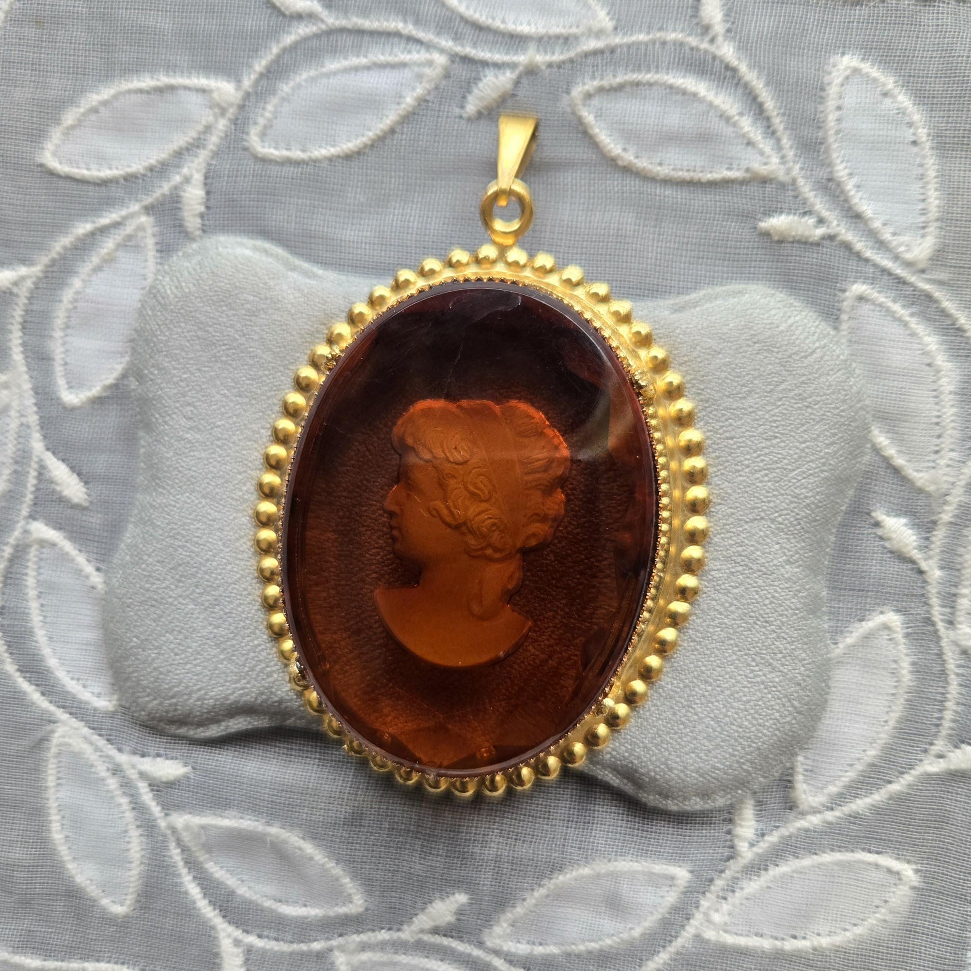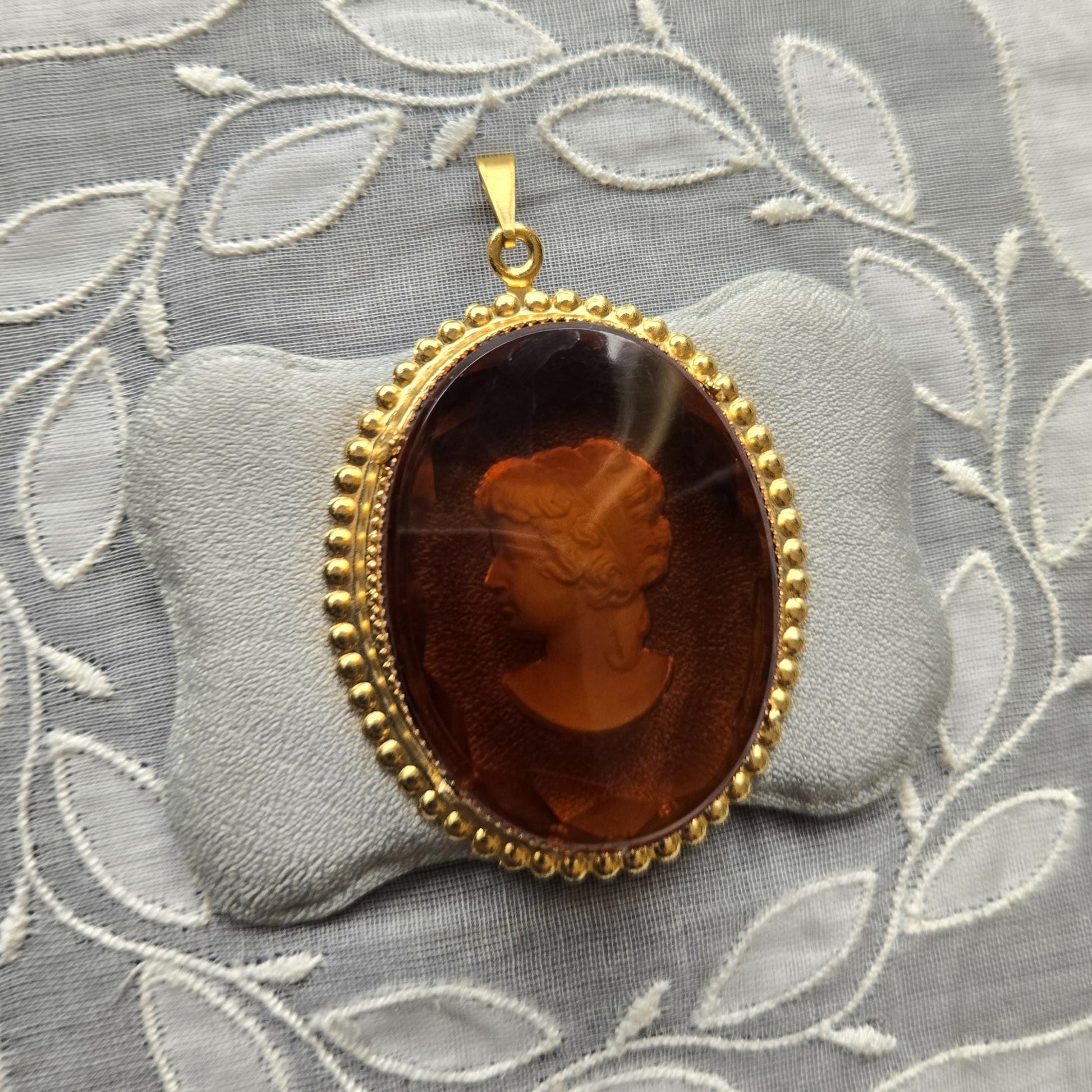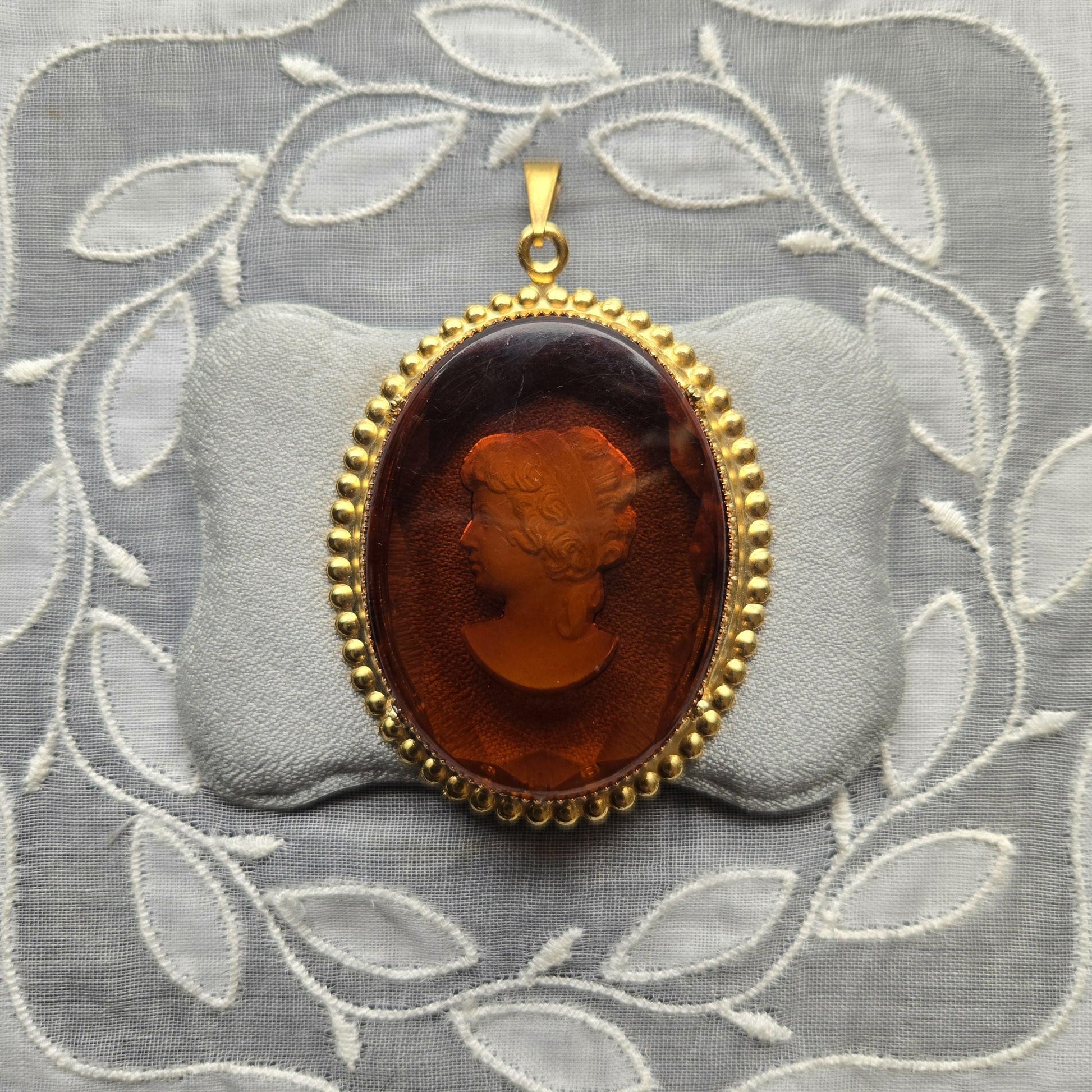A gorgeous cameo pendant with a transparent brown acrylic reverse intaglio cameo on gold plated metal