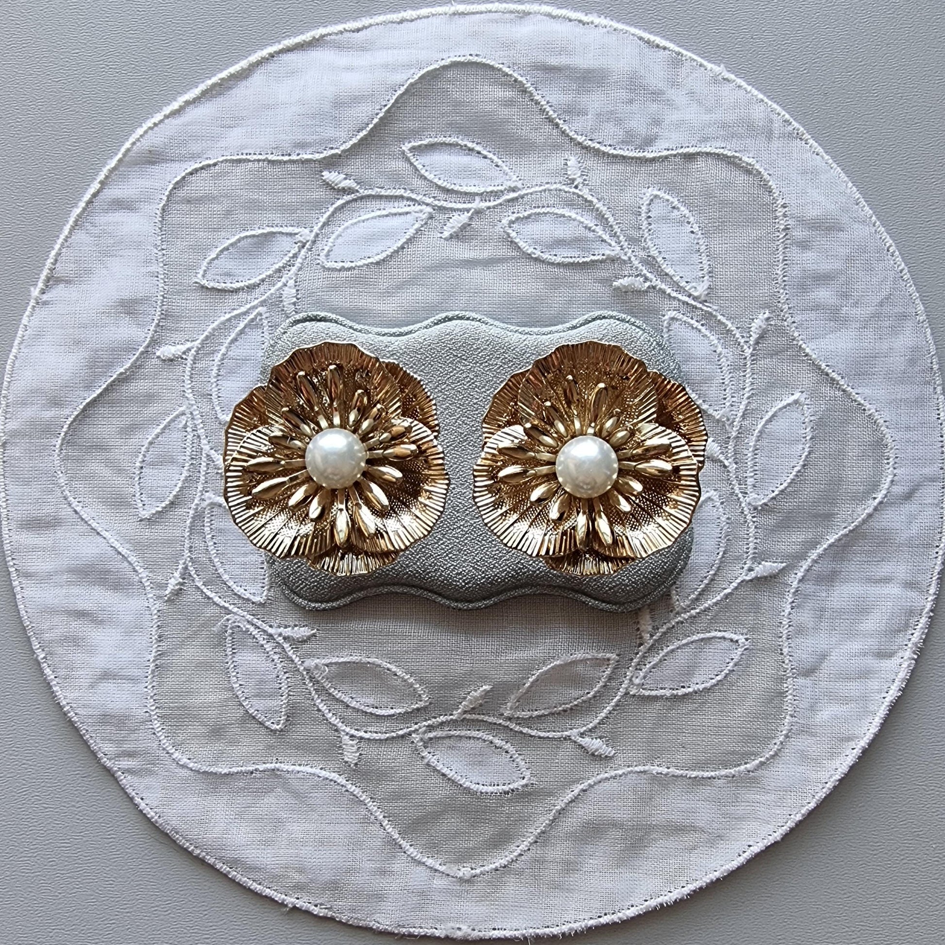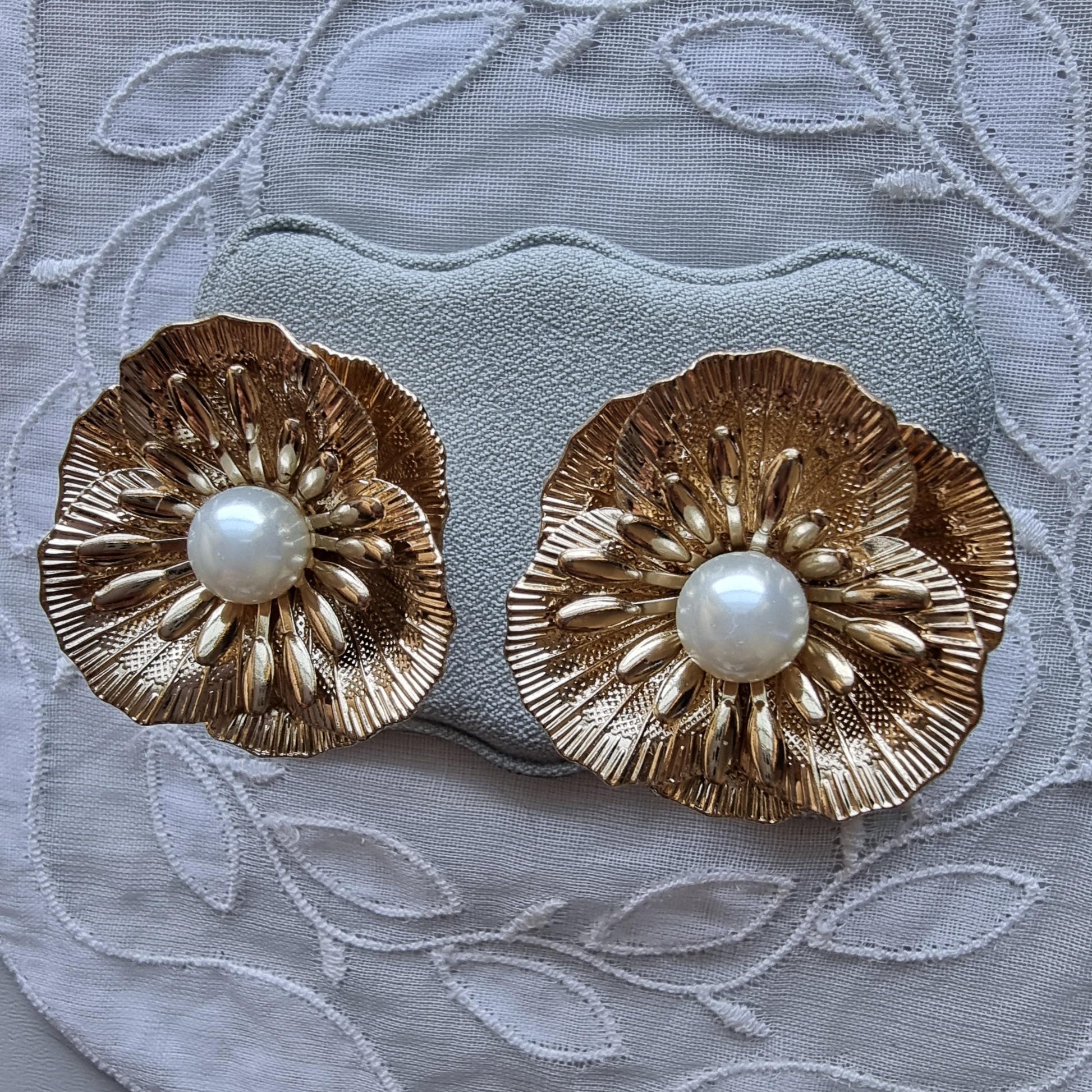 A beautiful pair of big flower stud earrings with faux pearls on gold plated metal