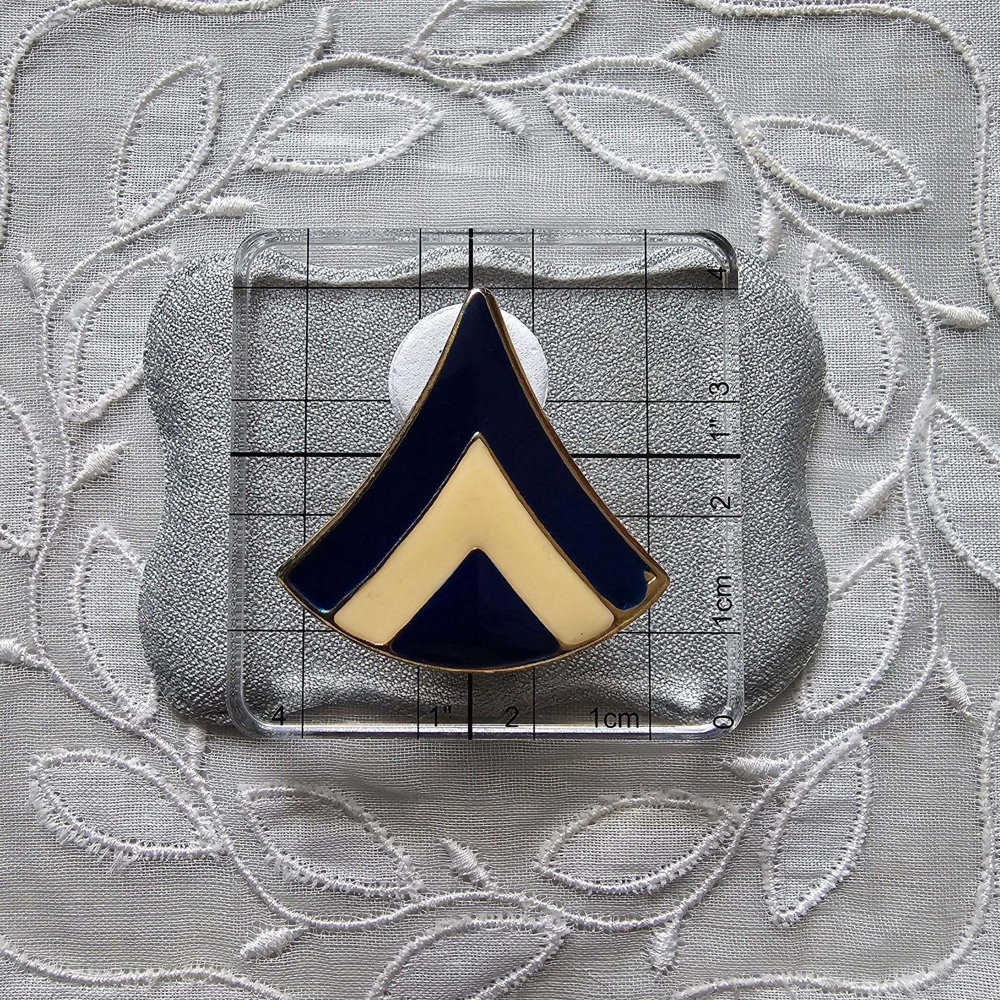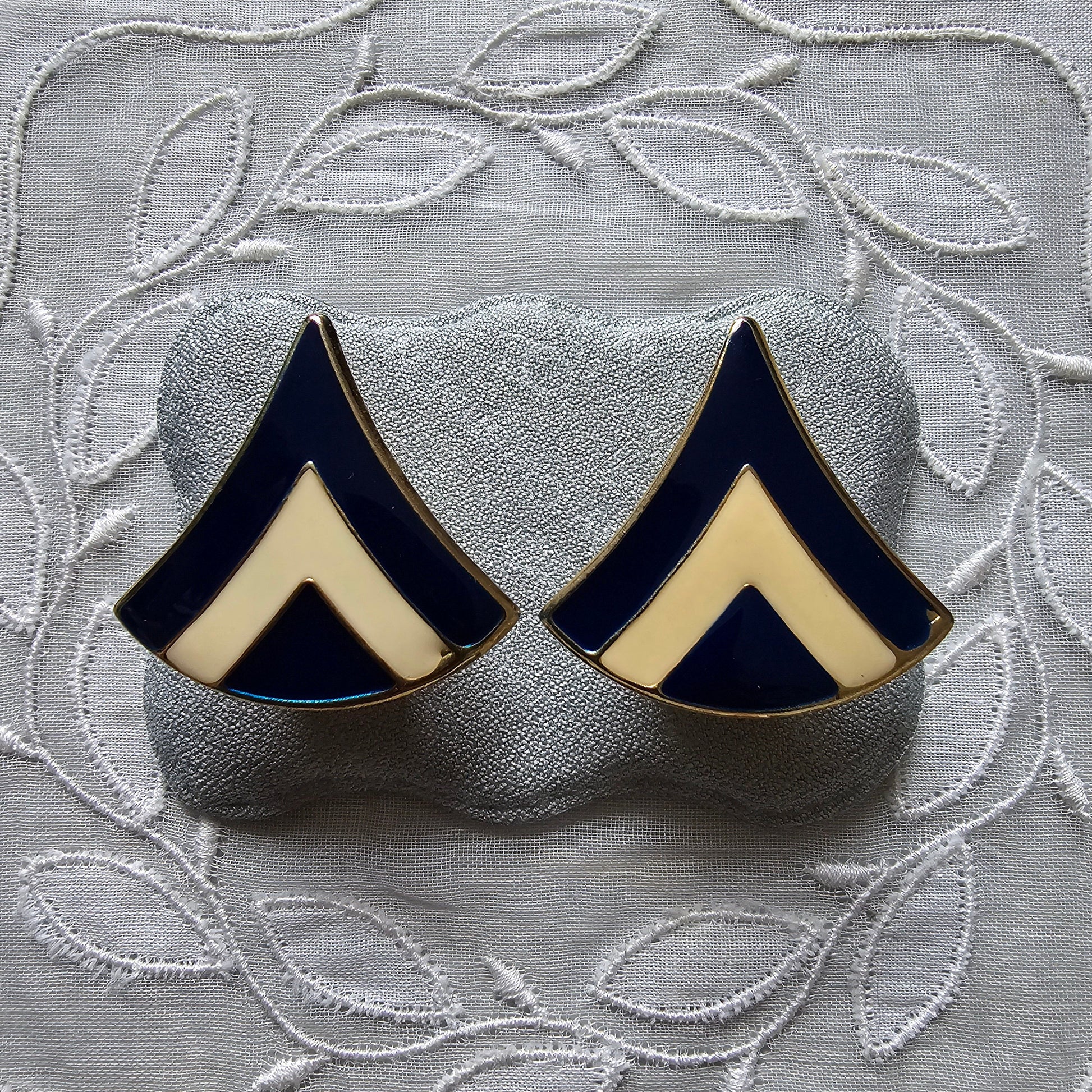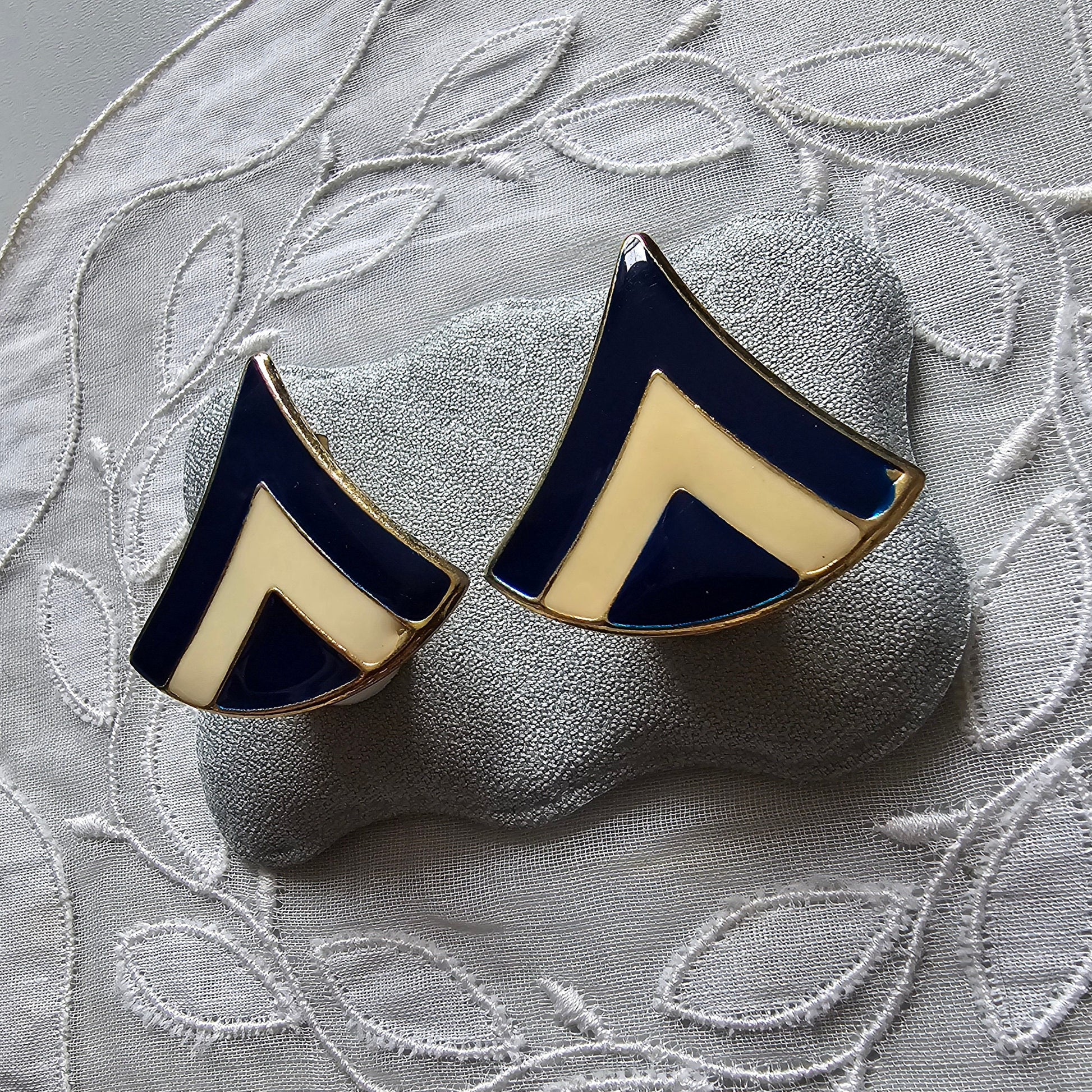 A chic pair of triangular shape lightweight earrings with navy blue and cream white enamel on gold plated metal
