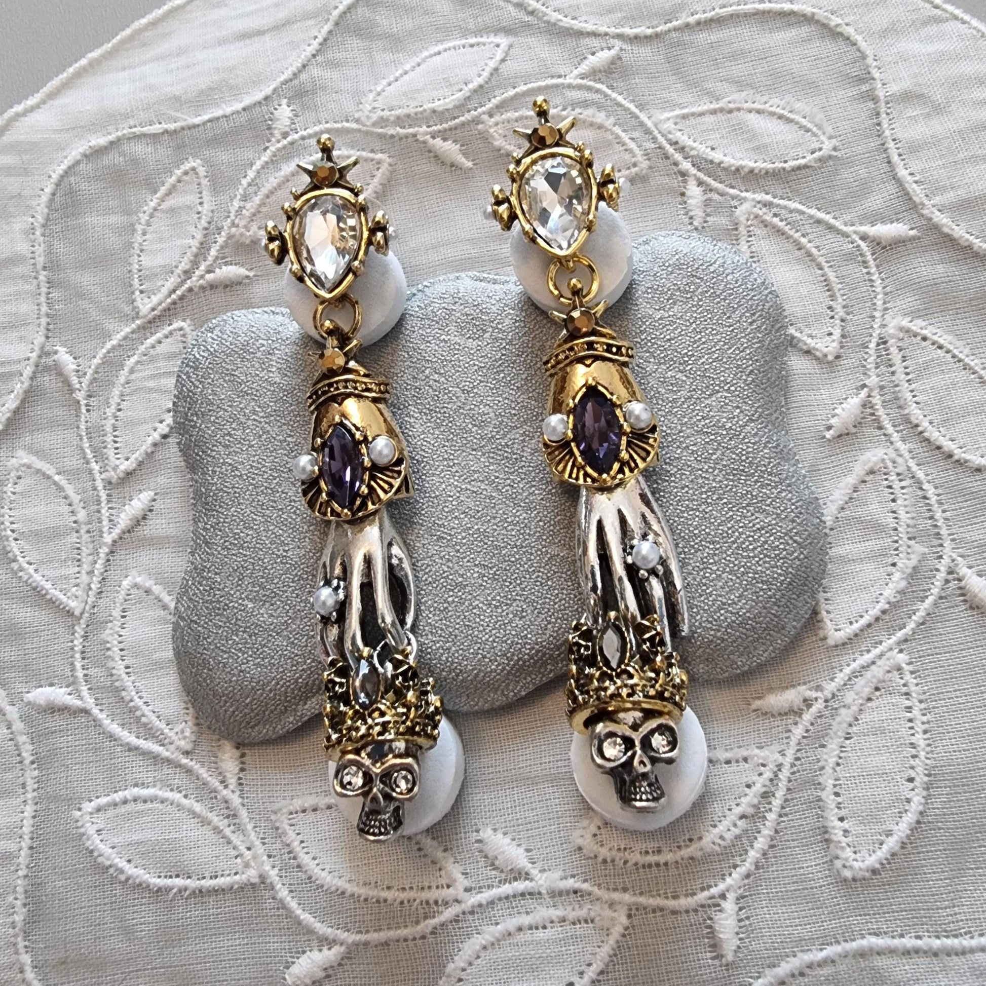 A stunning pair of skeleton hands drop earrings with clear, purple and grey crystals on gold and rhodium plated metal