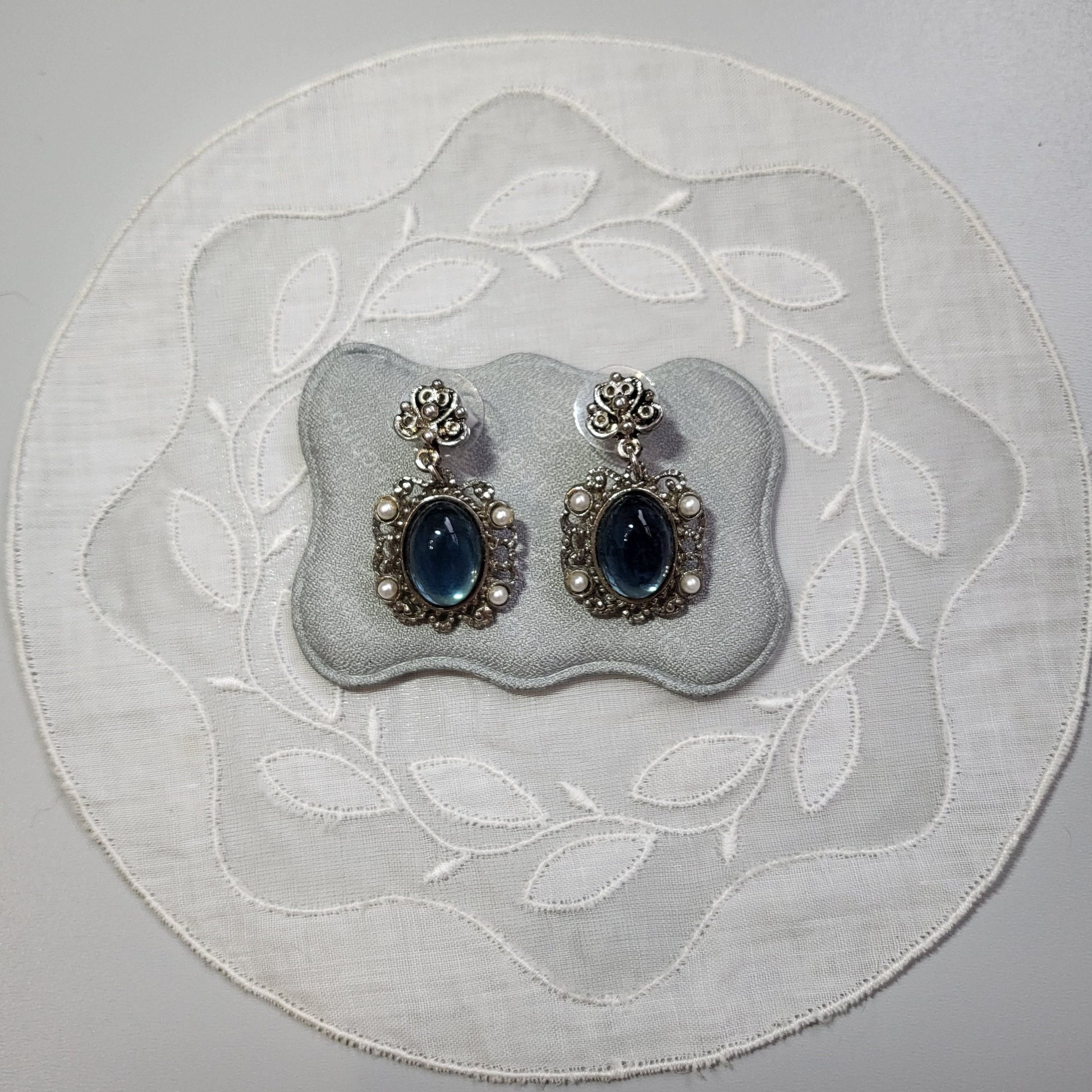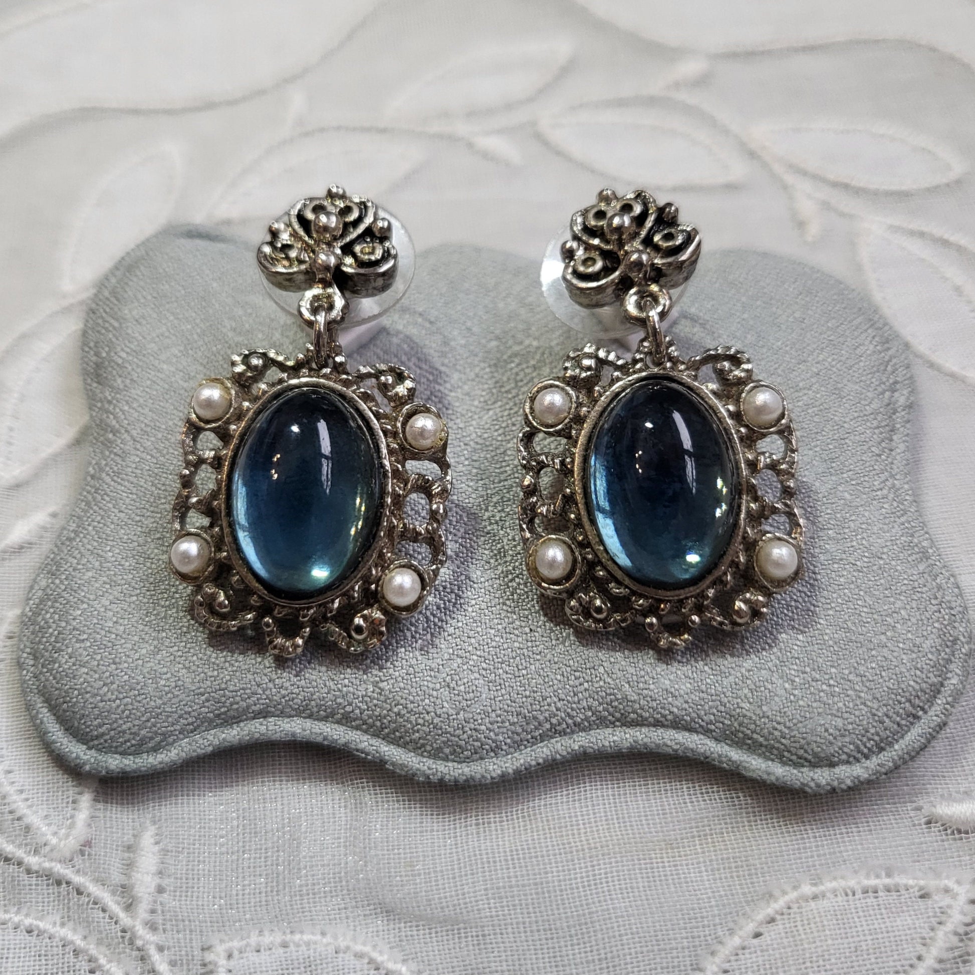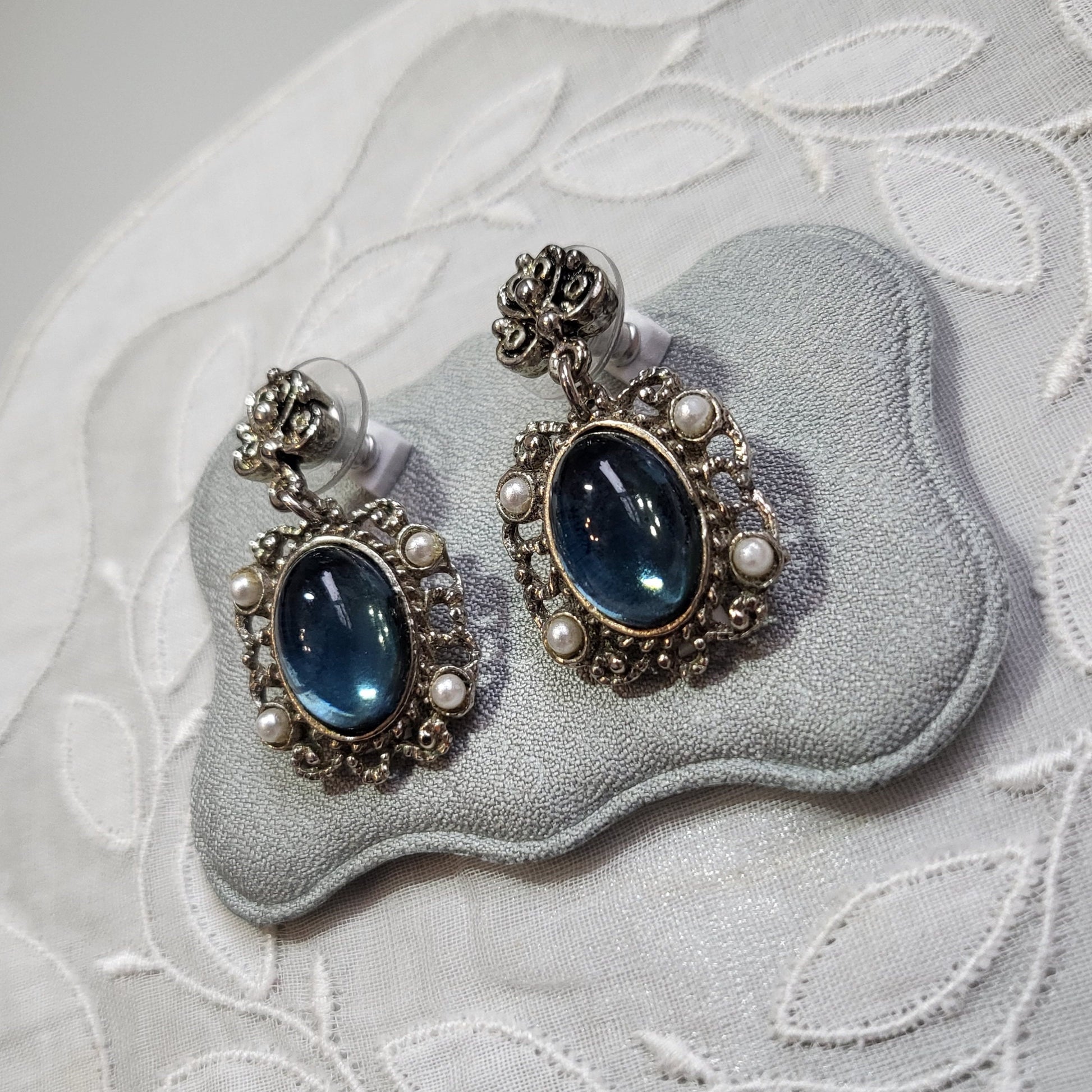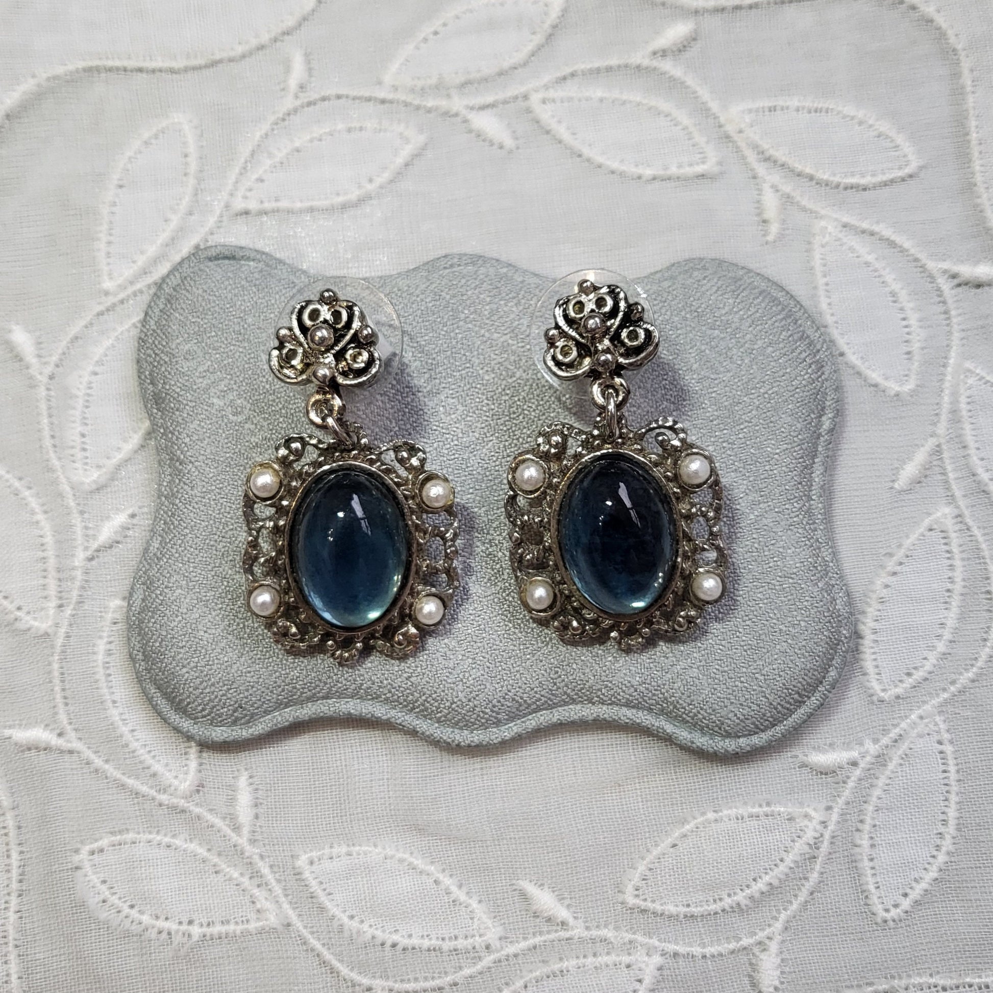 Posts - Filigree Style Blue Cabochon and Pearls Drop Earrings