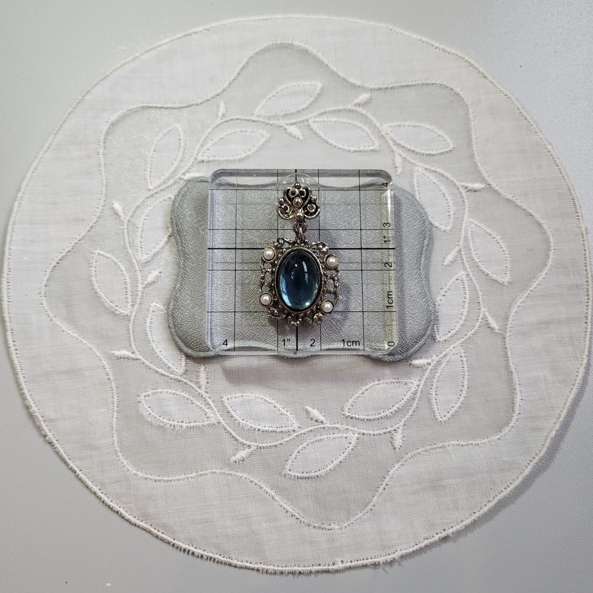 A beautiful pair of drop earrings with clear blue cabochon and faux pearls on silver tone jewellery metal alloy