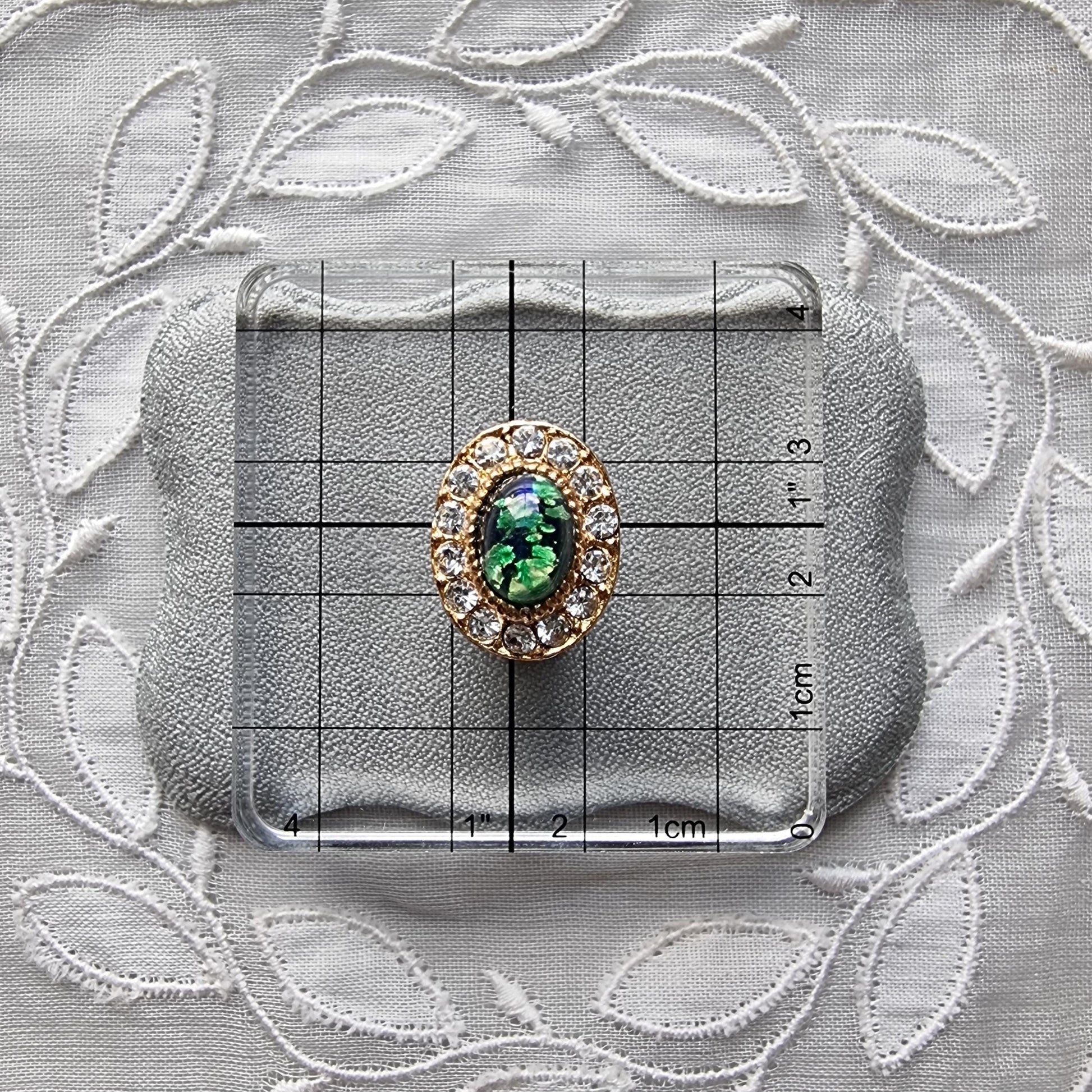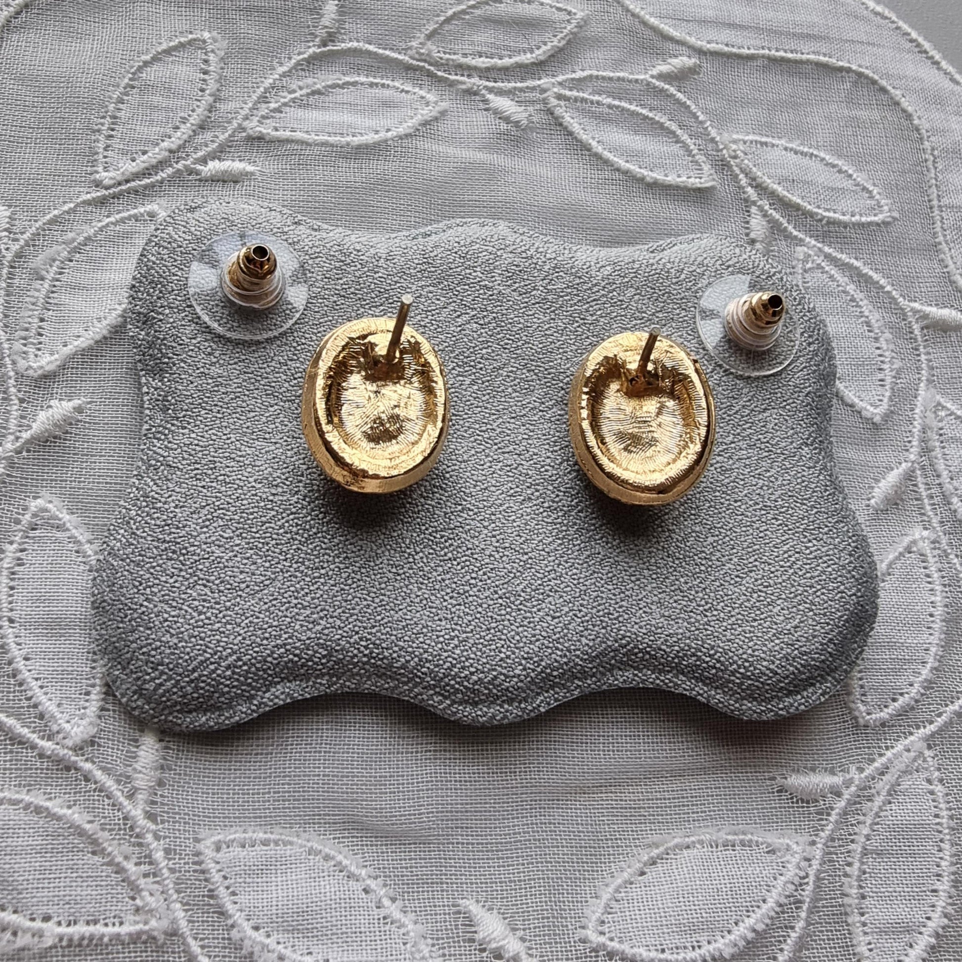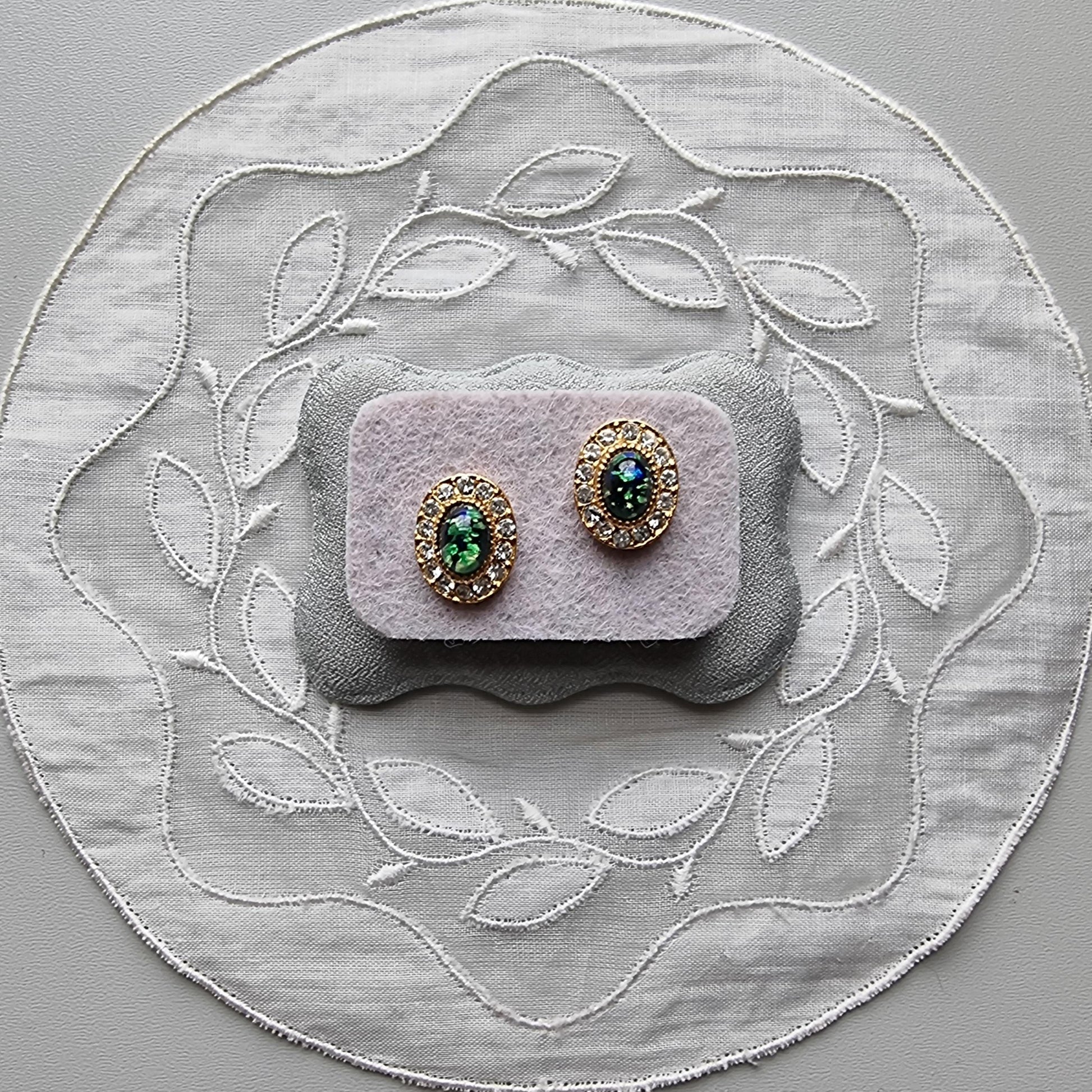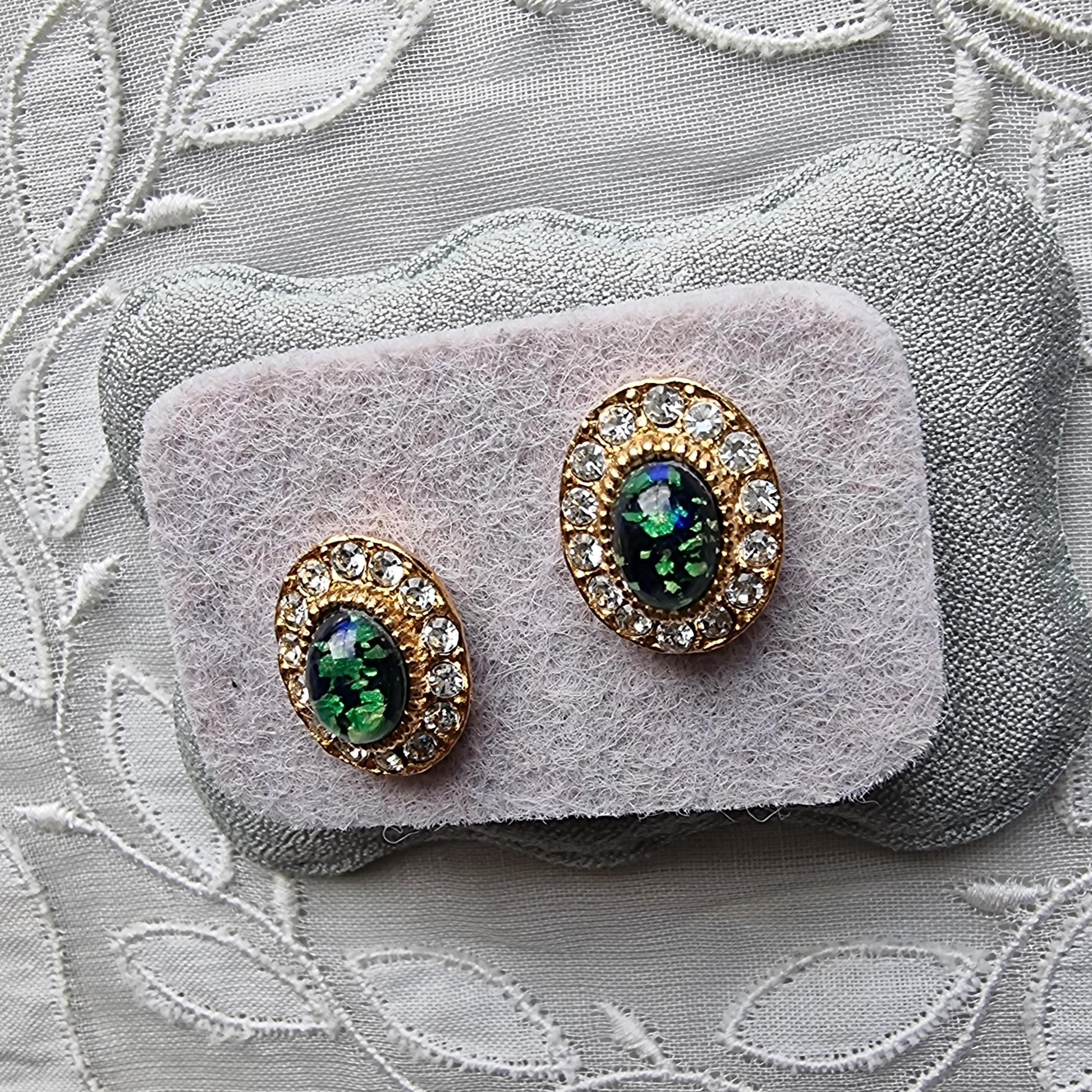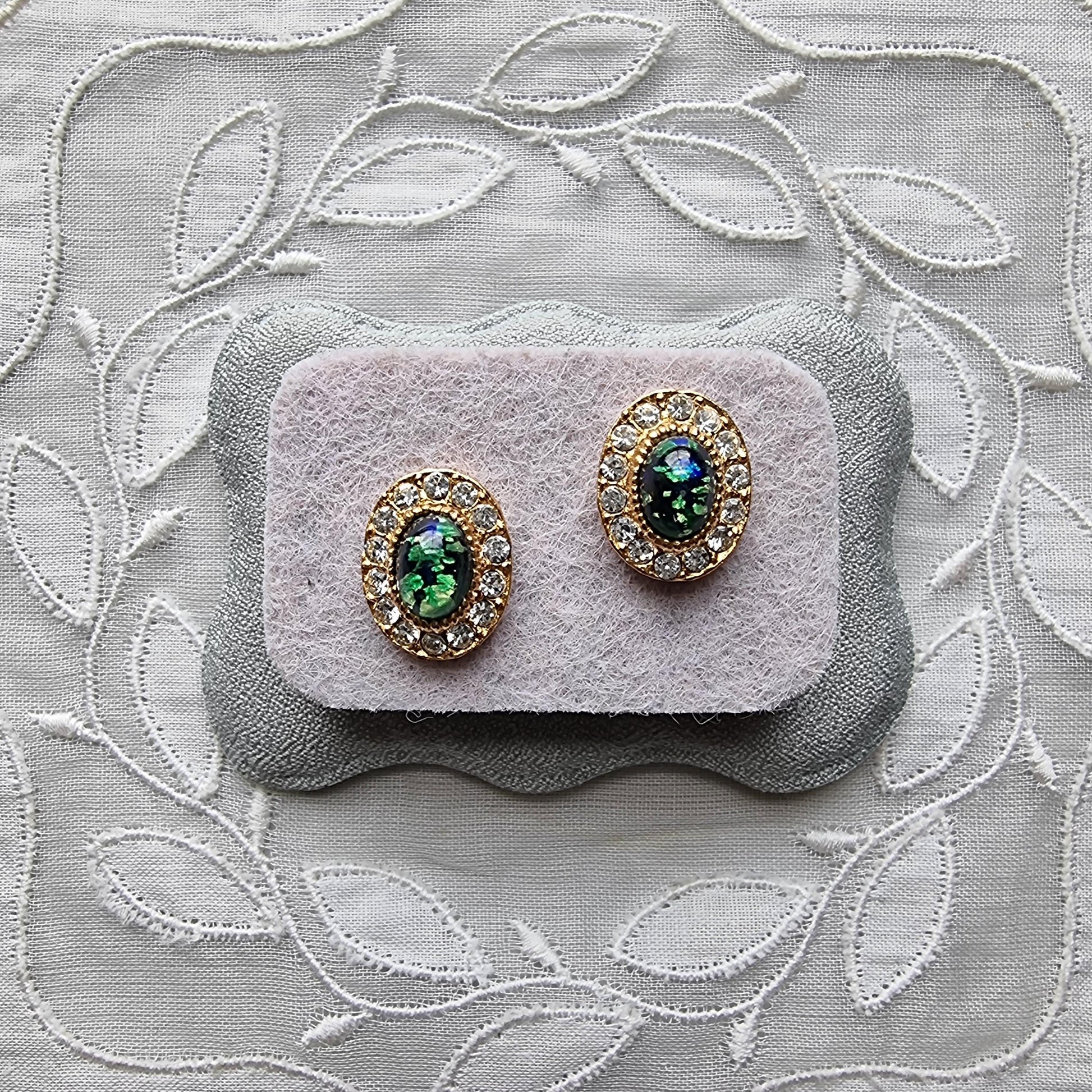A classic halo design stud earrings with foiled glass cabochon and clear crystals on gold plated metal