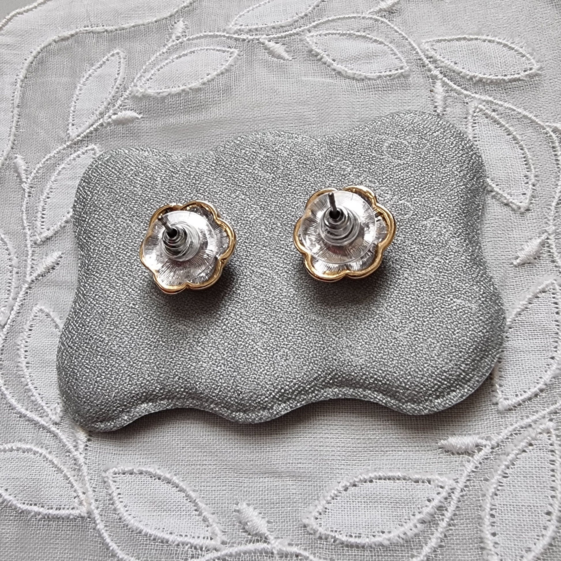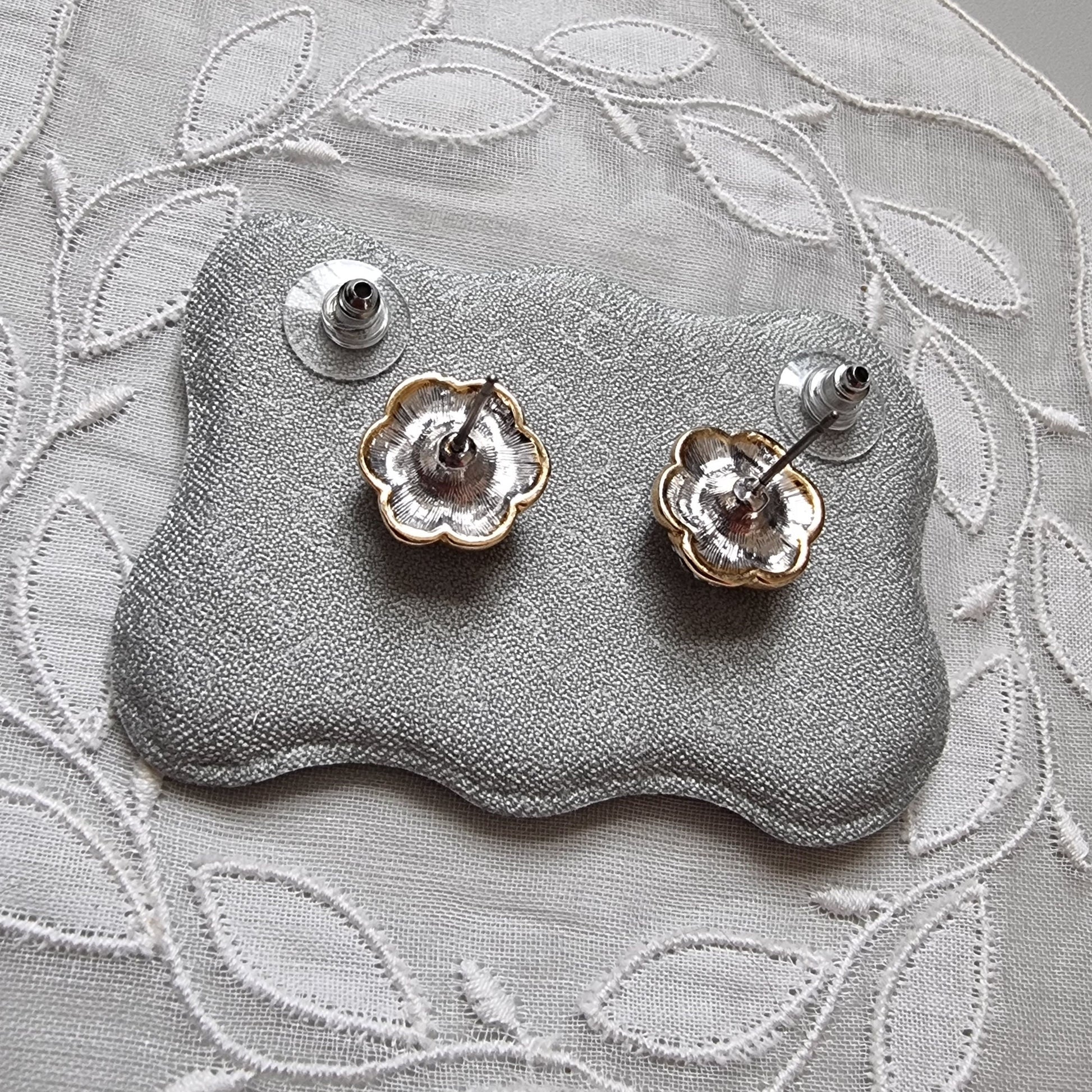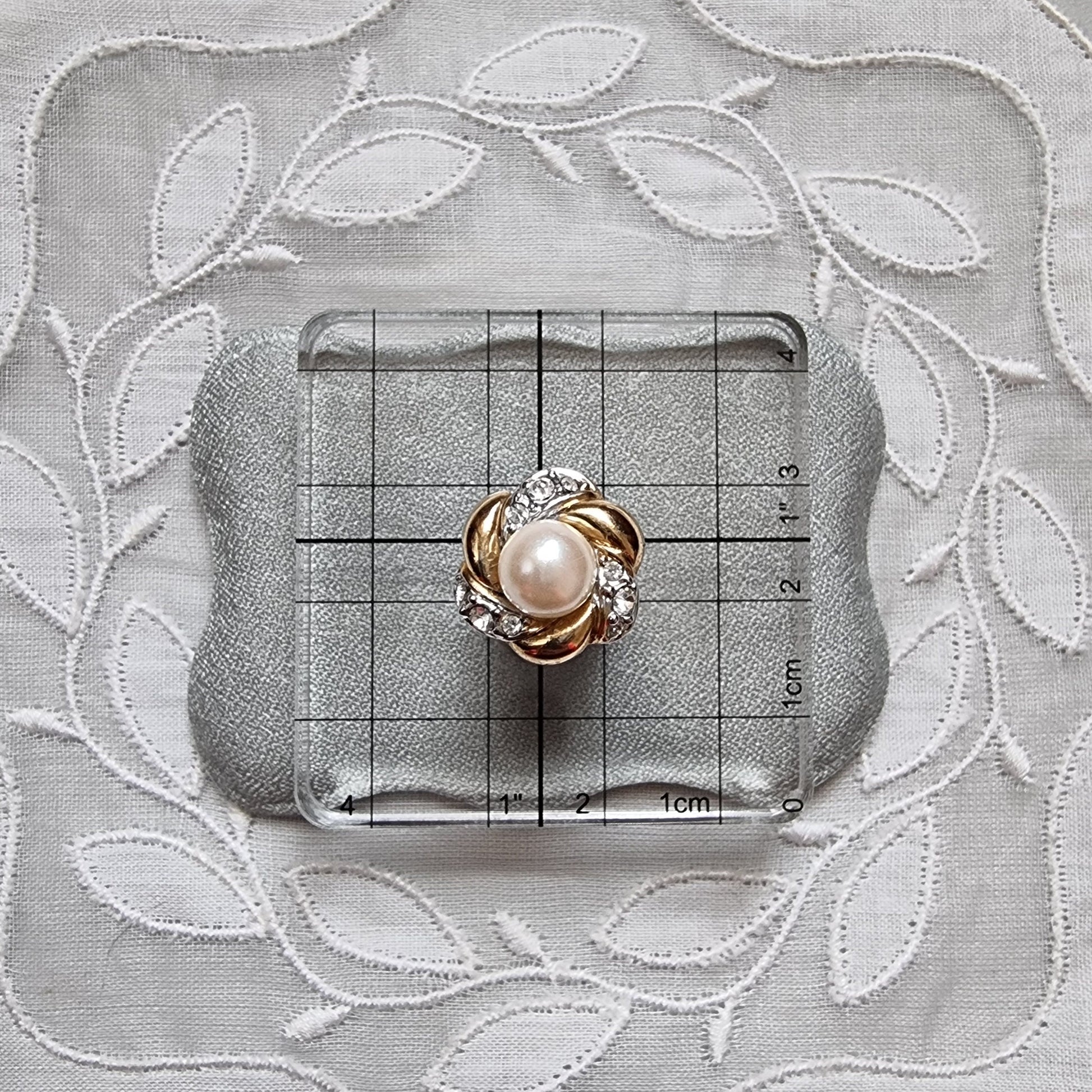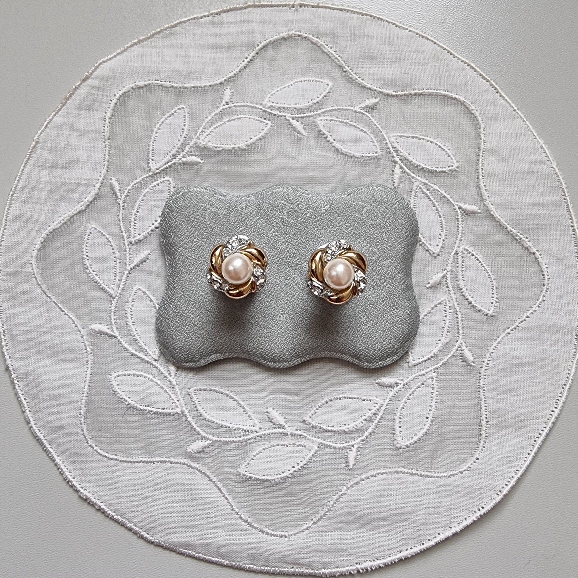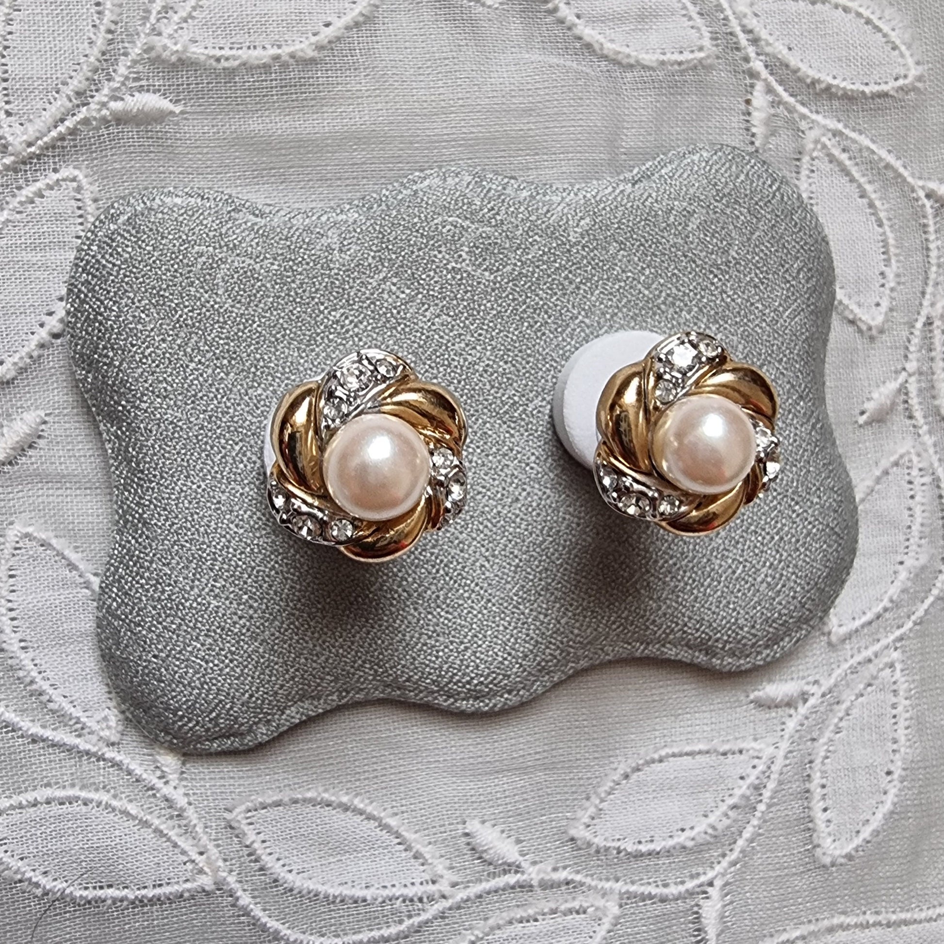 A sweet pair of round stud earrings with faux pearls and clear crystals set on gold plated metal