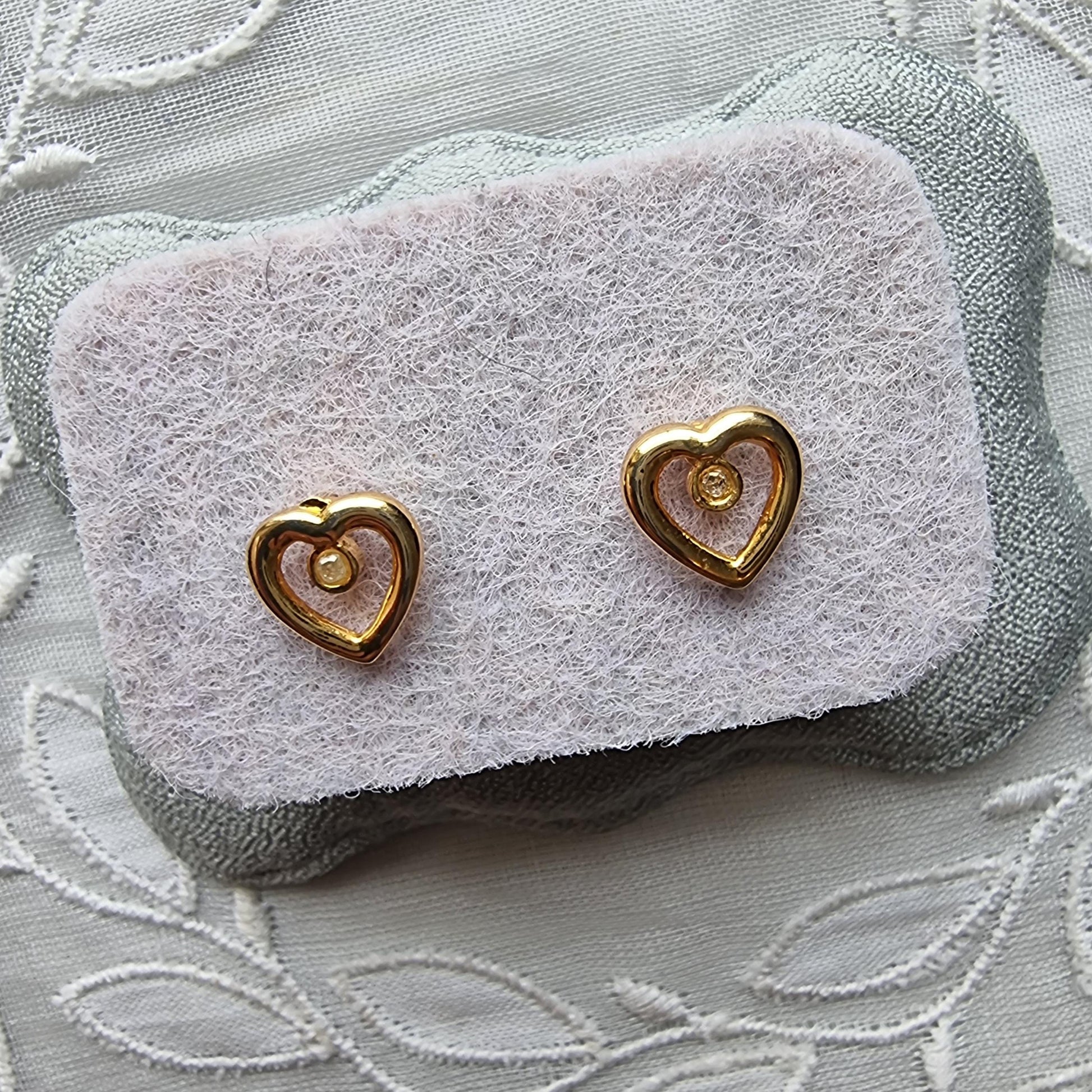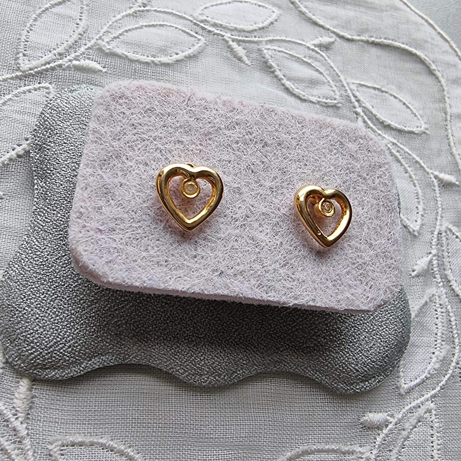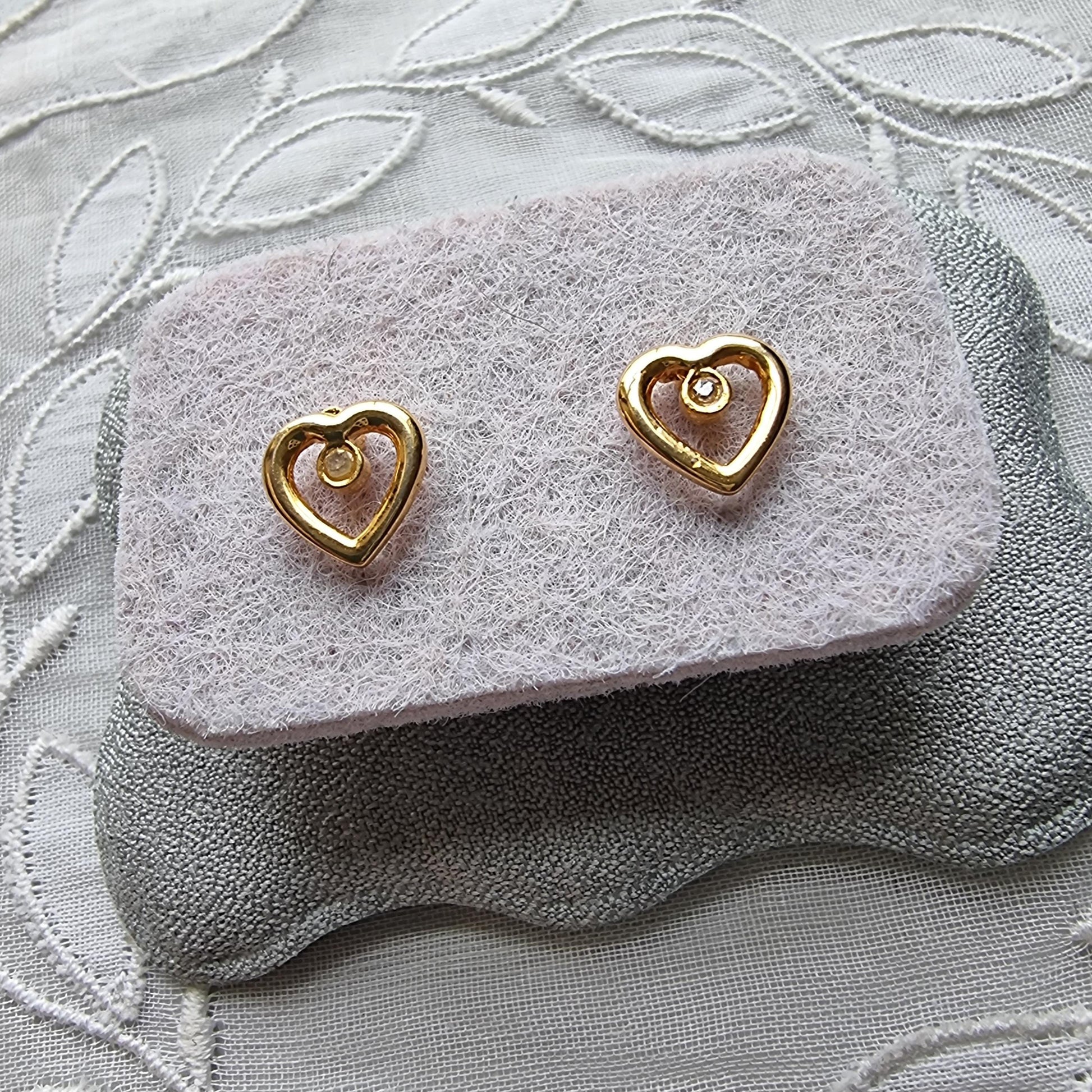 A sweet pair of open heart stud earrings with small clear crystals on gold plated metal