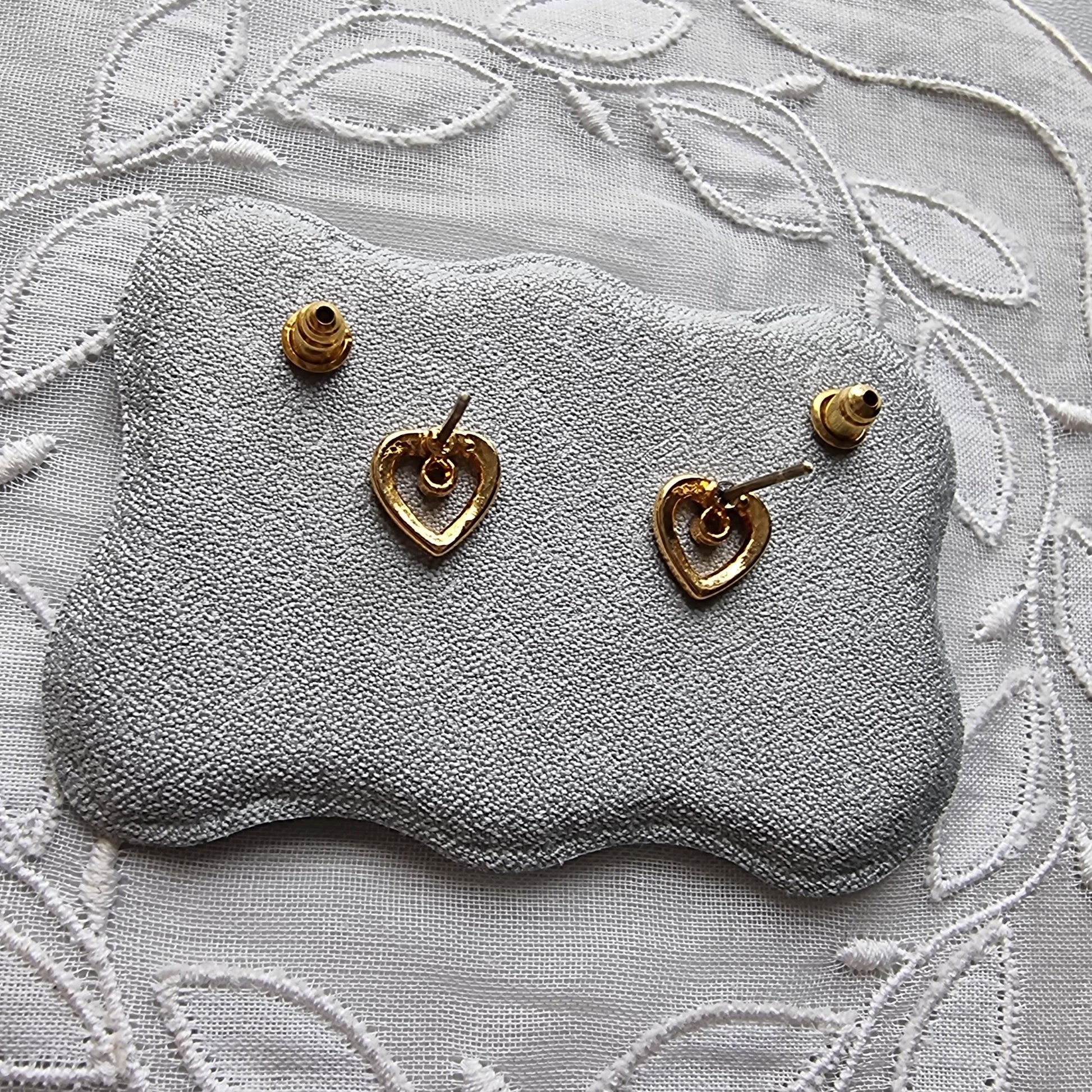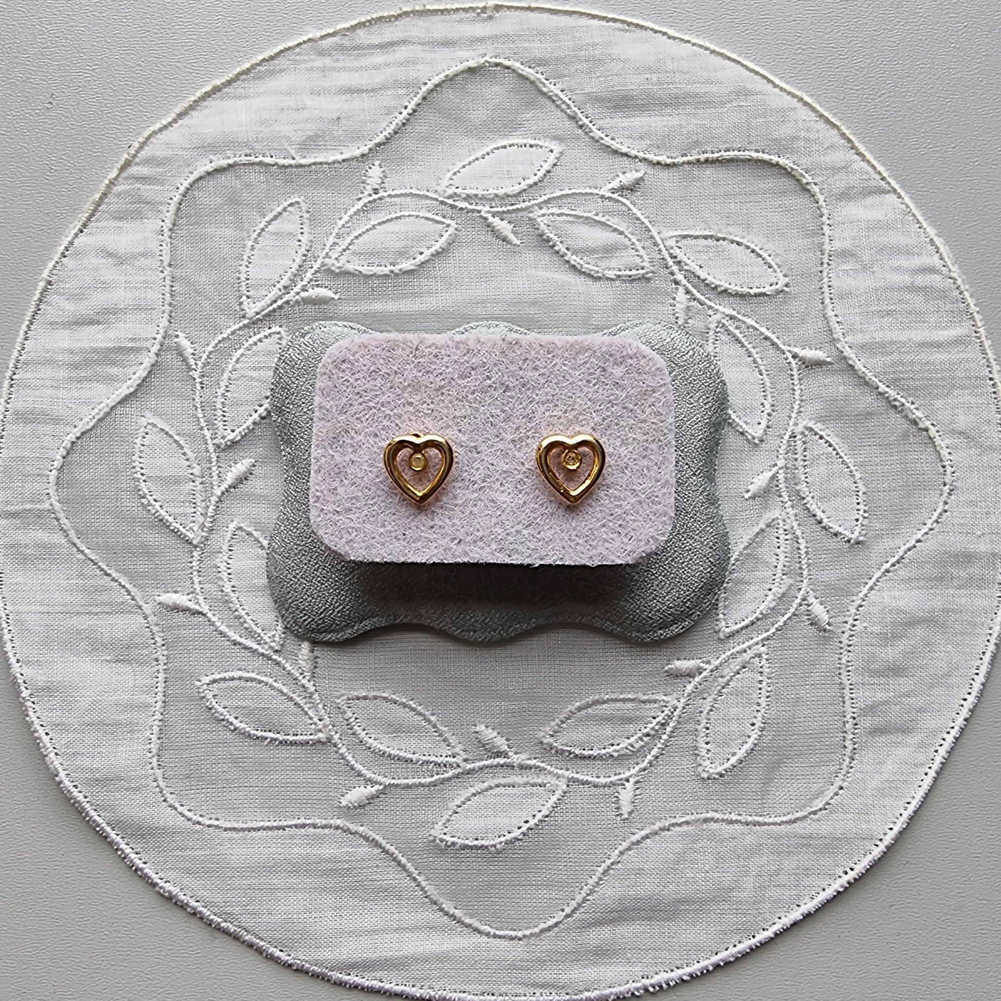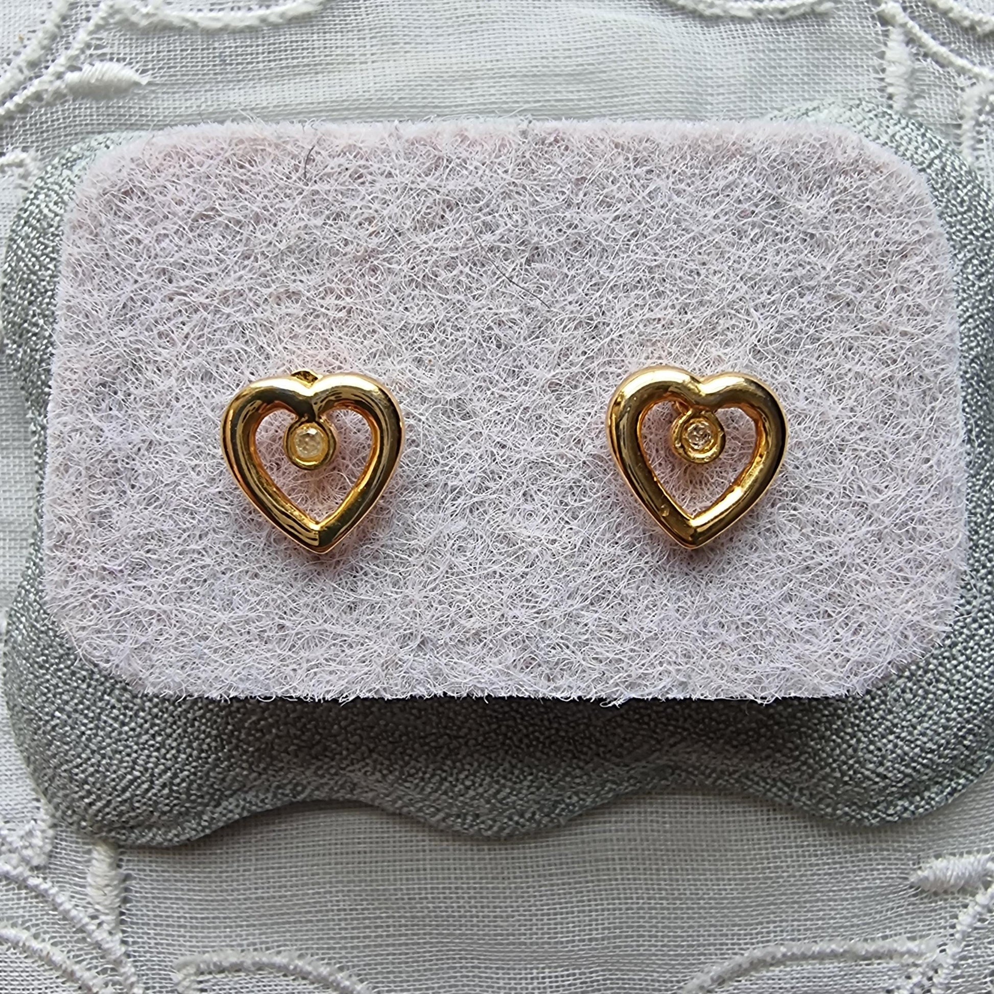 A sweet pair of open heart stud earrings with small clear crystals on gold plated metal