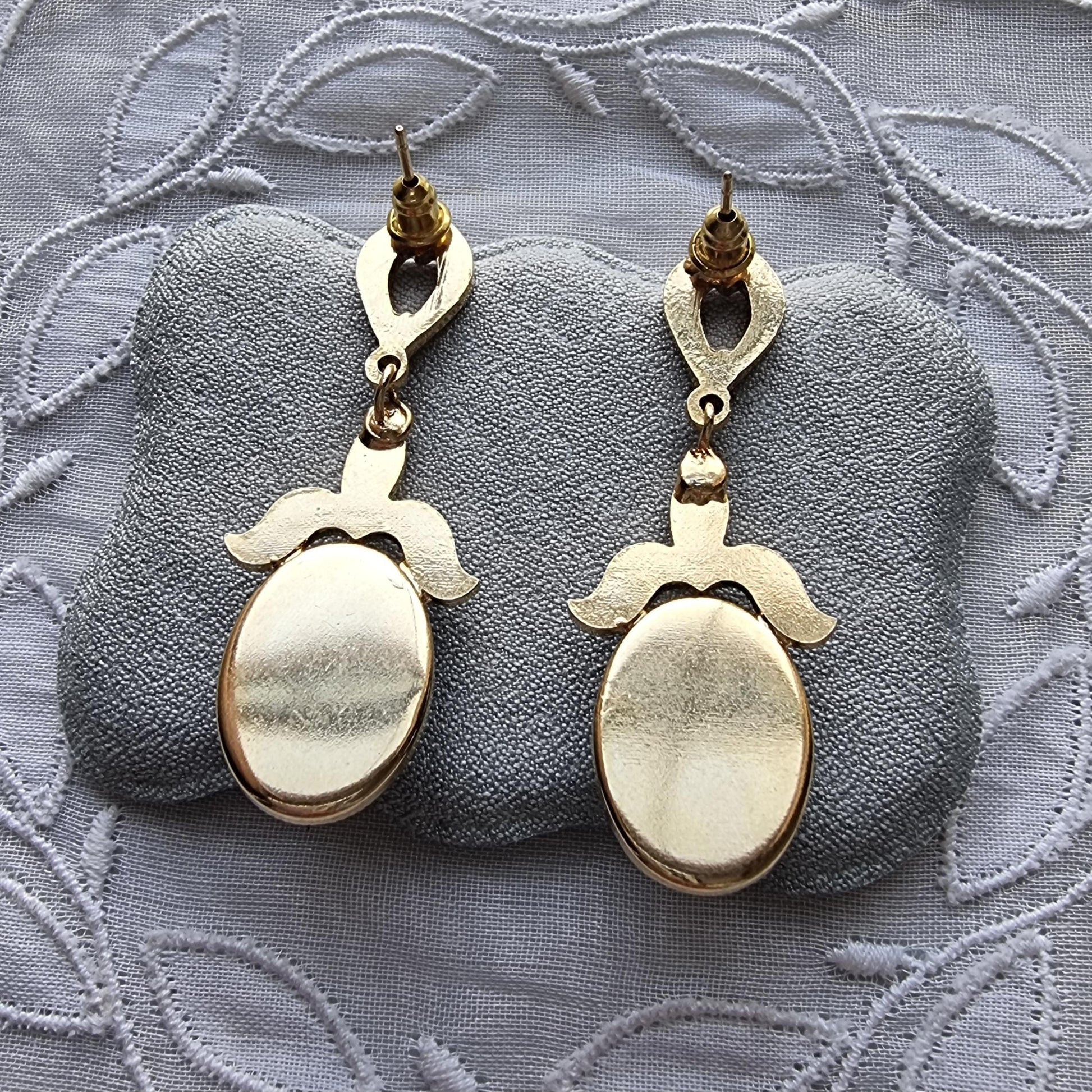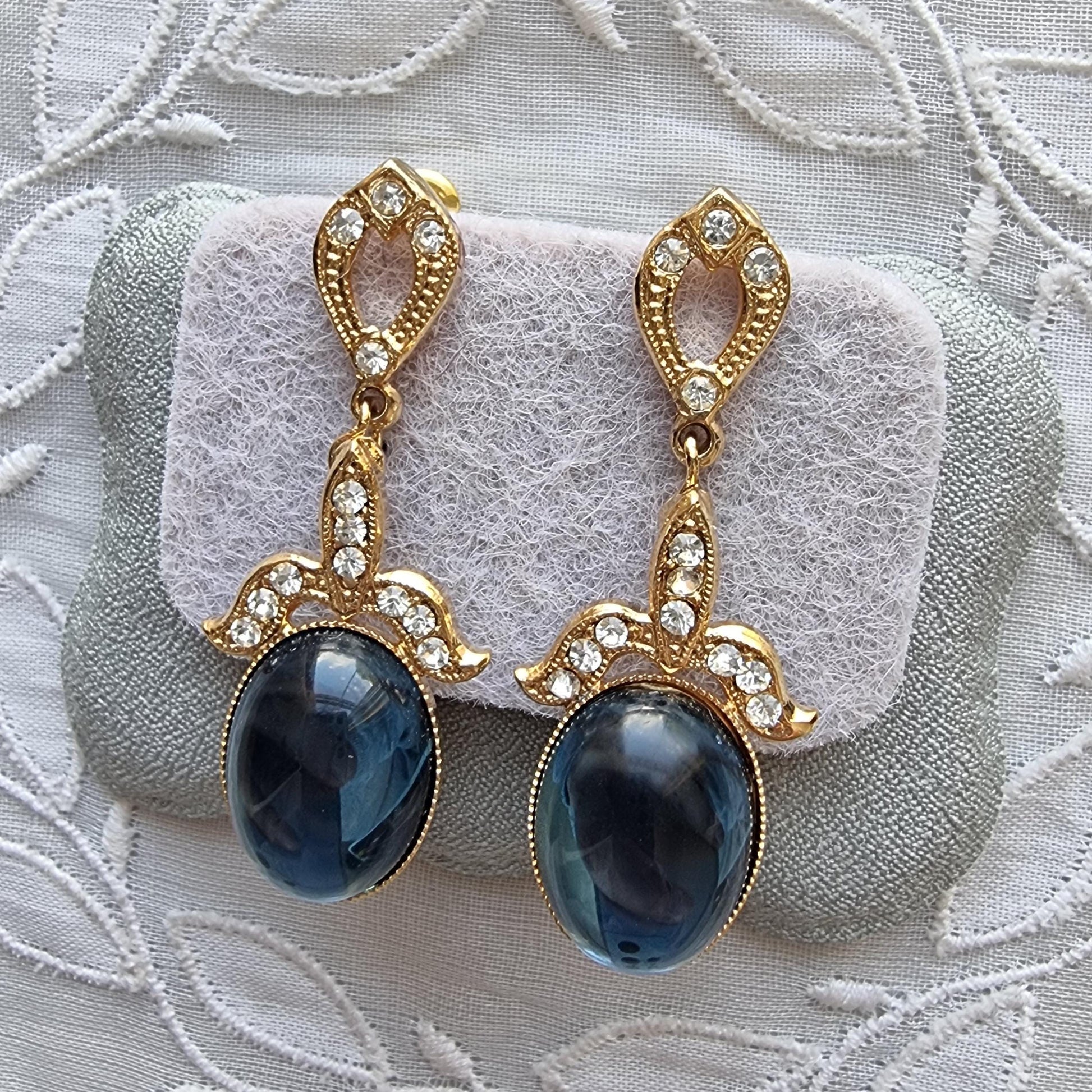 A gorgeous pair of dress earrings with blue oval cabochons and clear crystals on gold plated metal