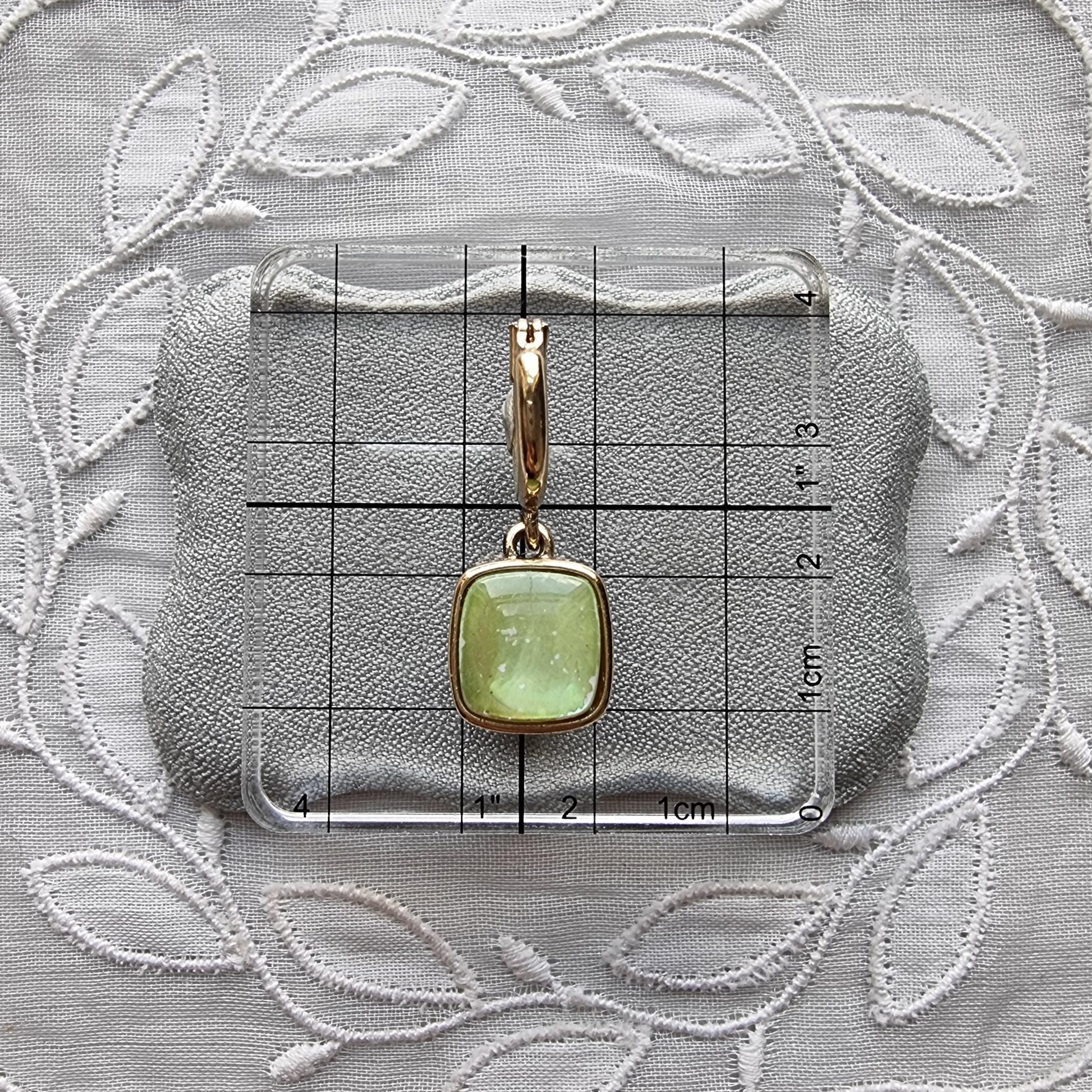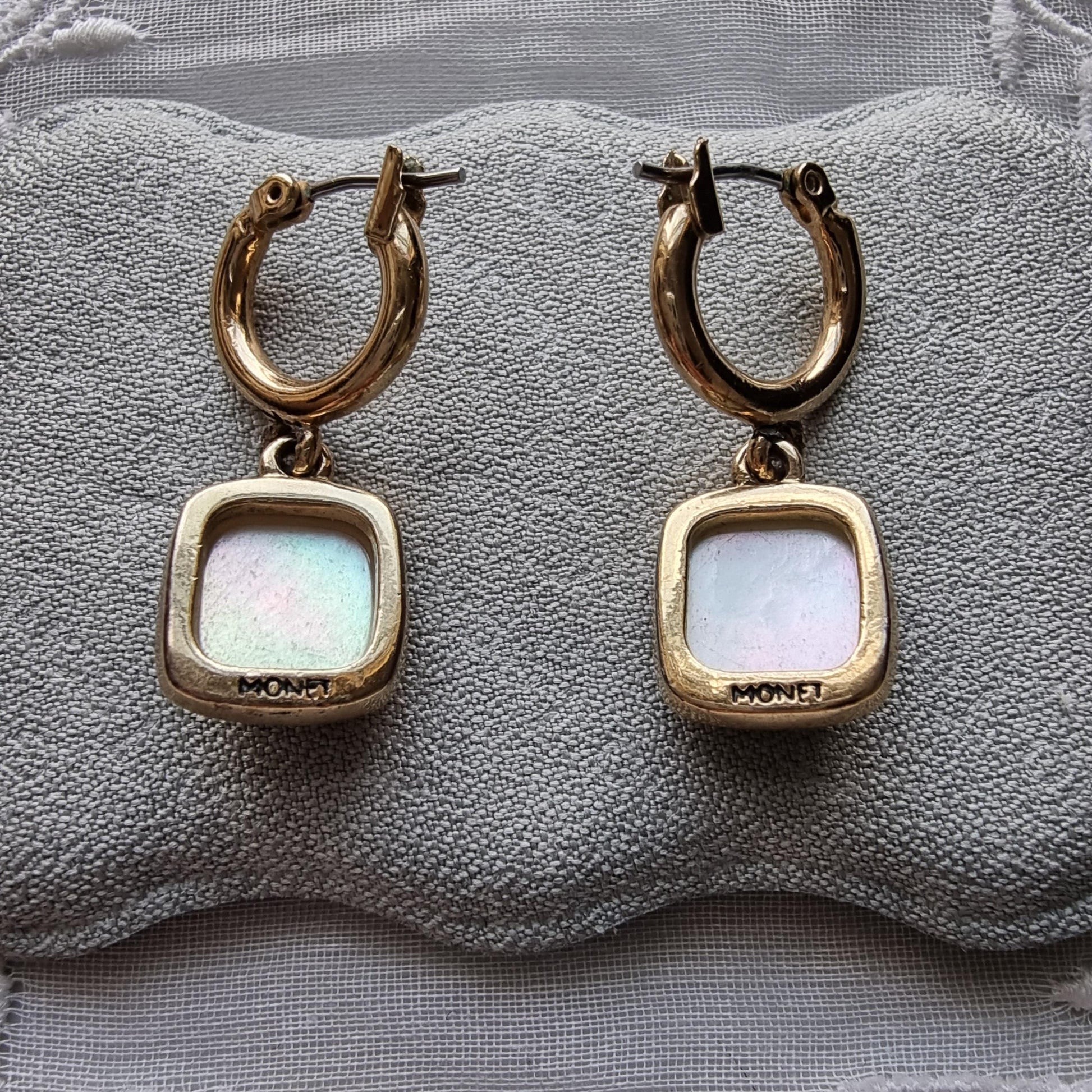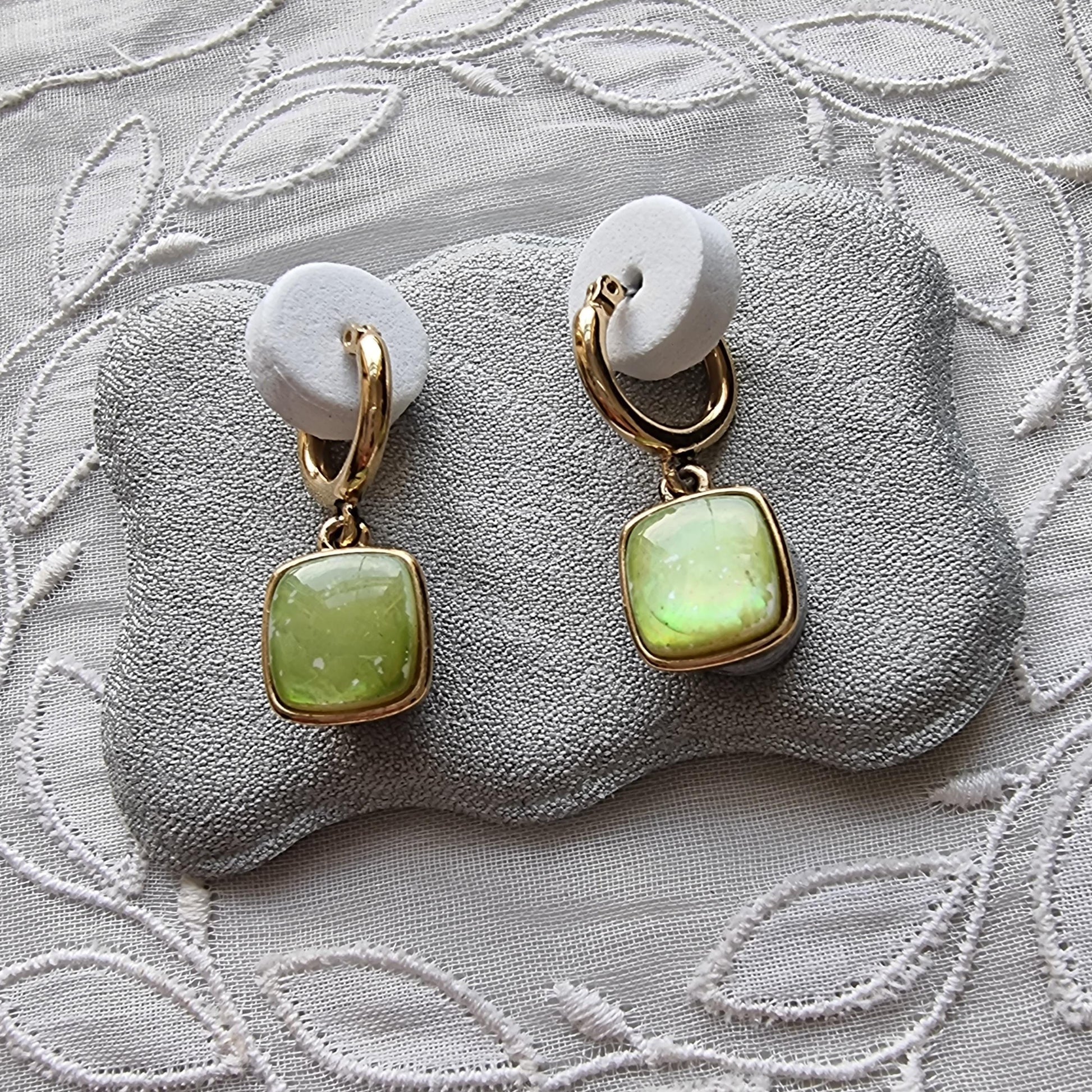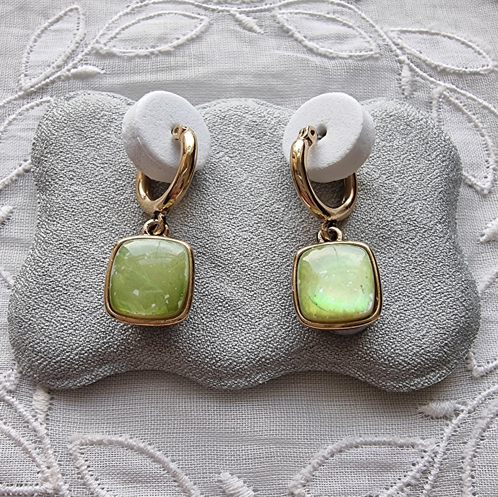 A gorgeous pair of drop earrings by Monetwith rounded square pearlescent light green cabochons on gold plated metal