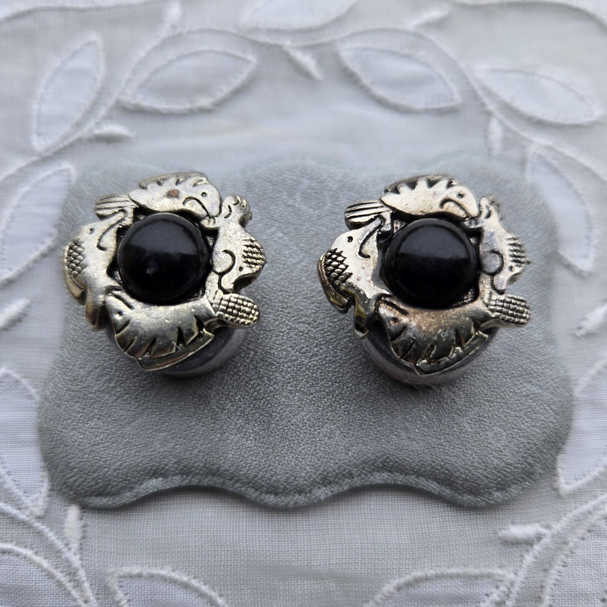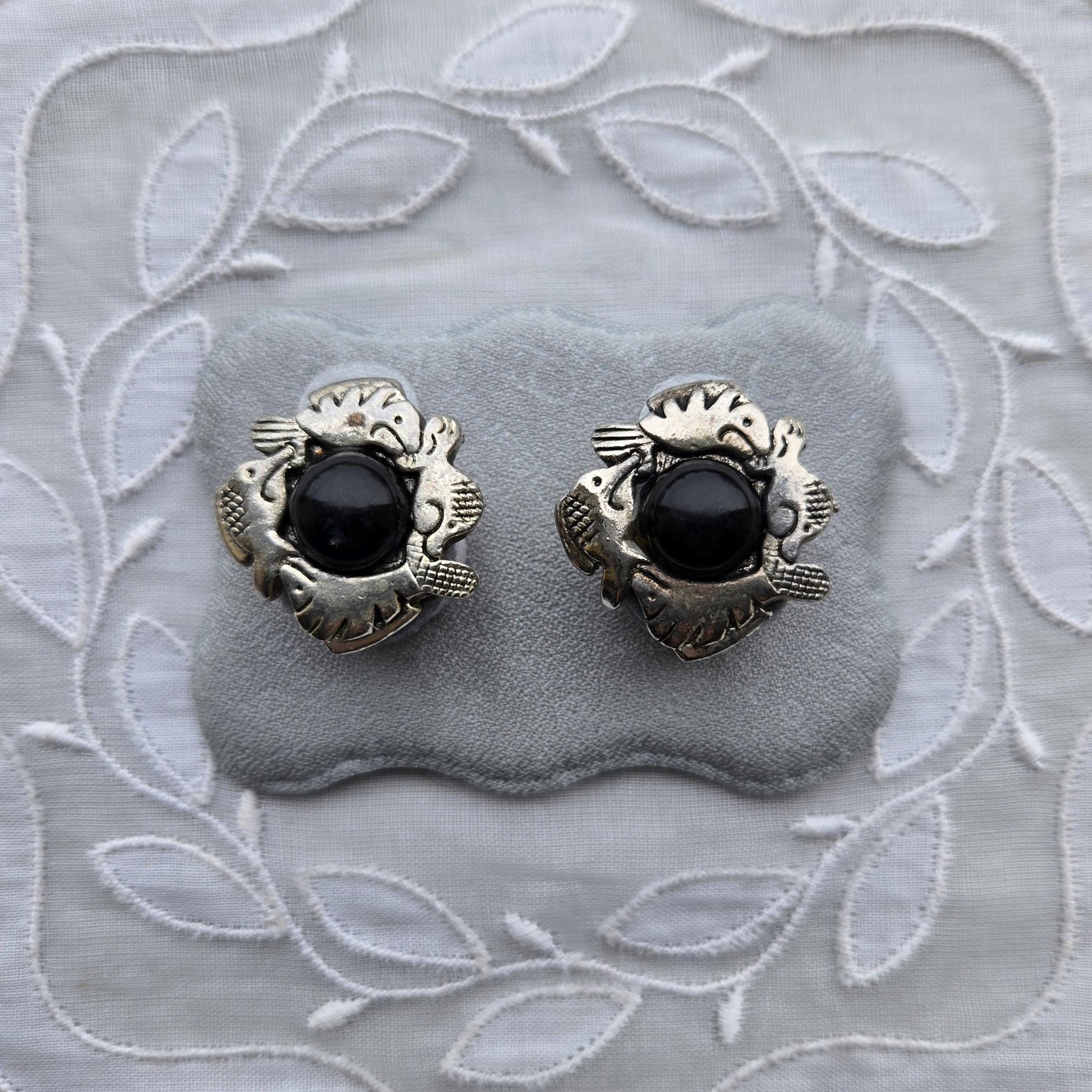 A fun pair of stylised fish earrings with black cabochon on oxidised silver tone metal