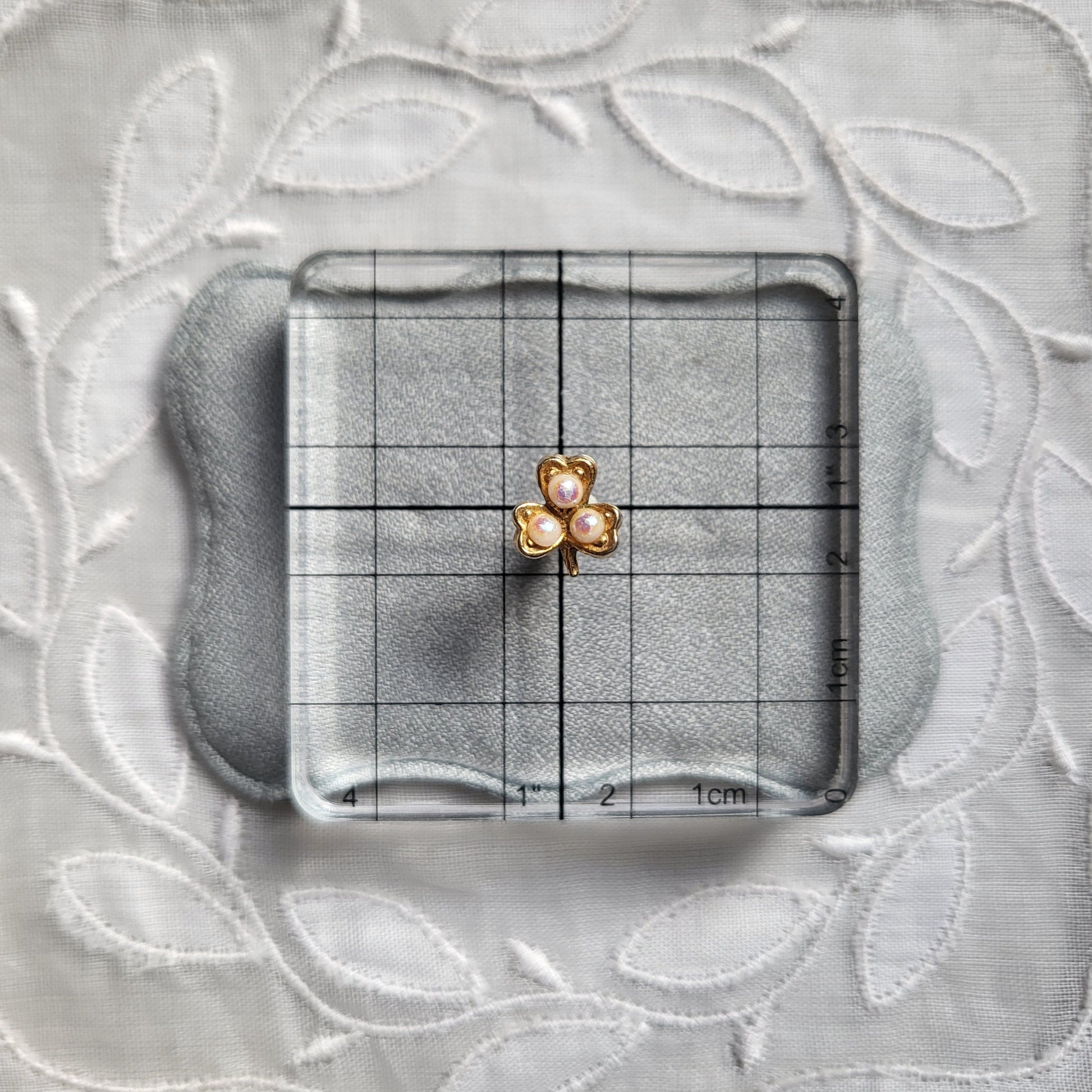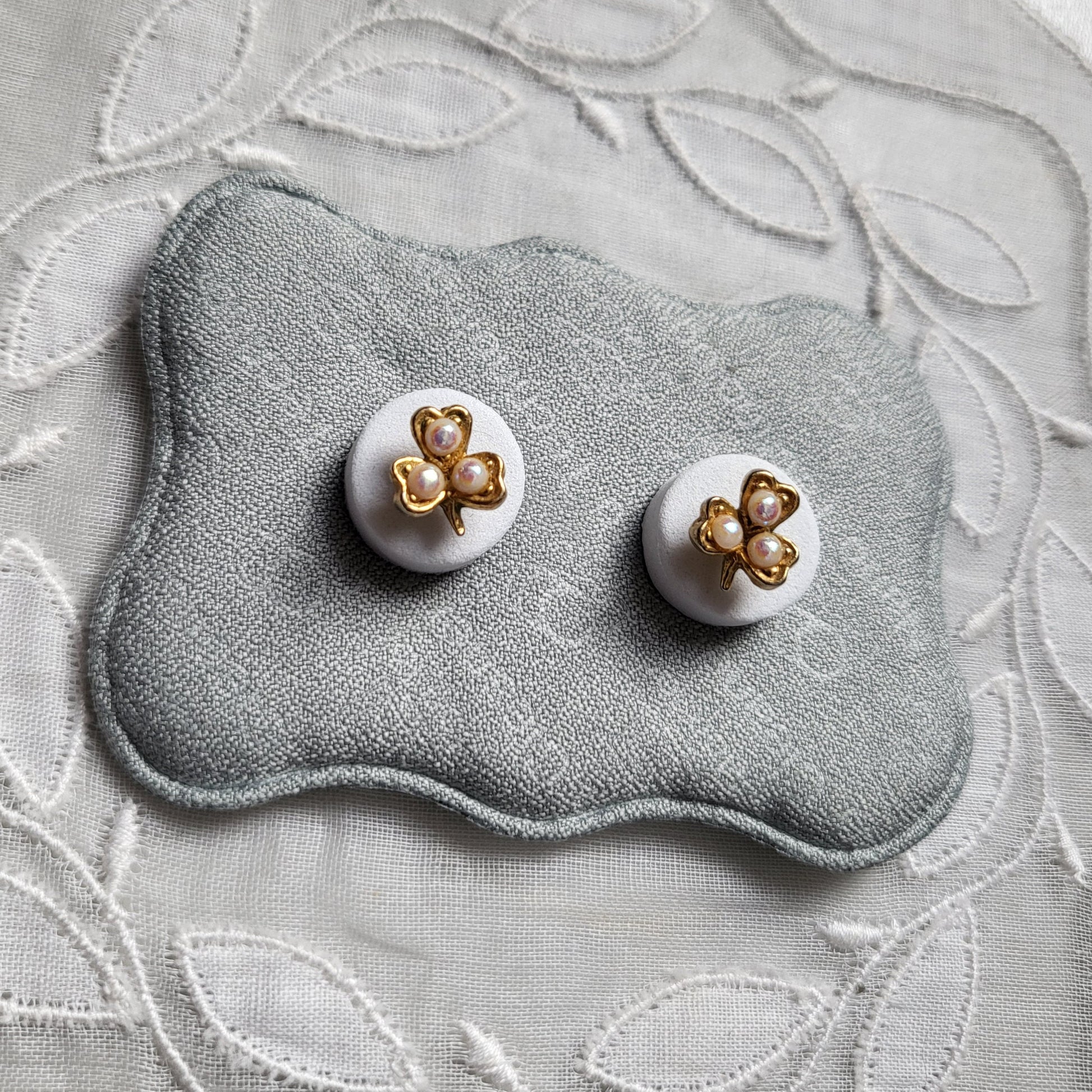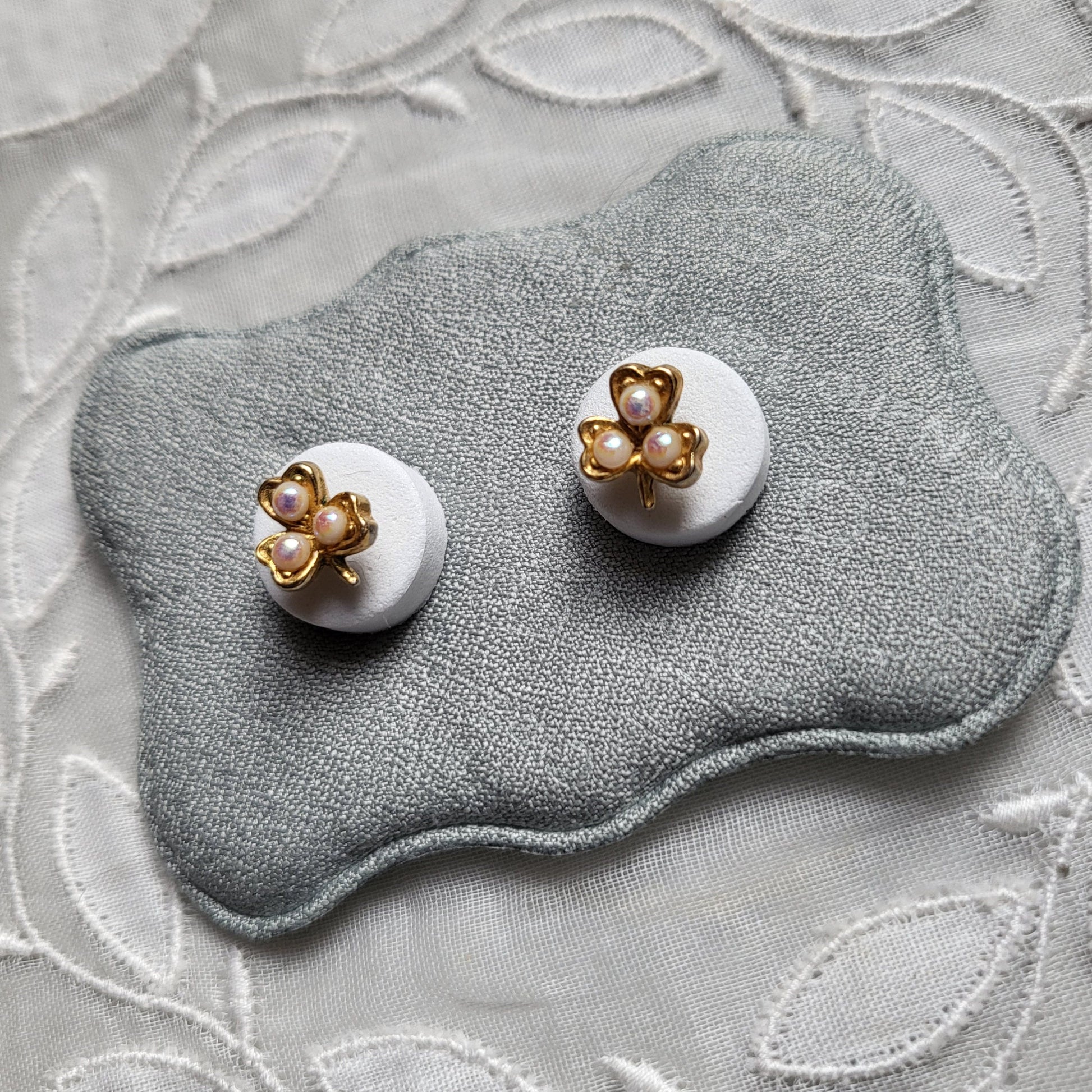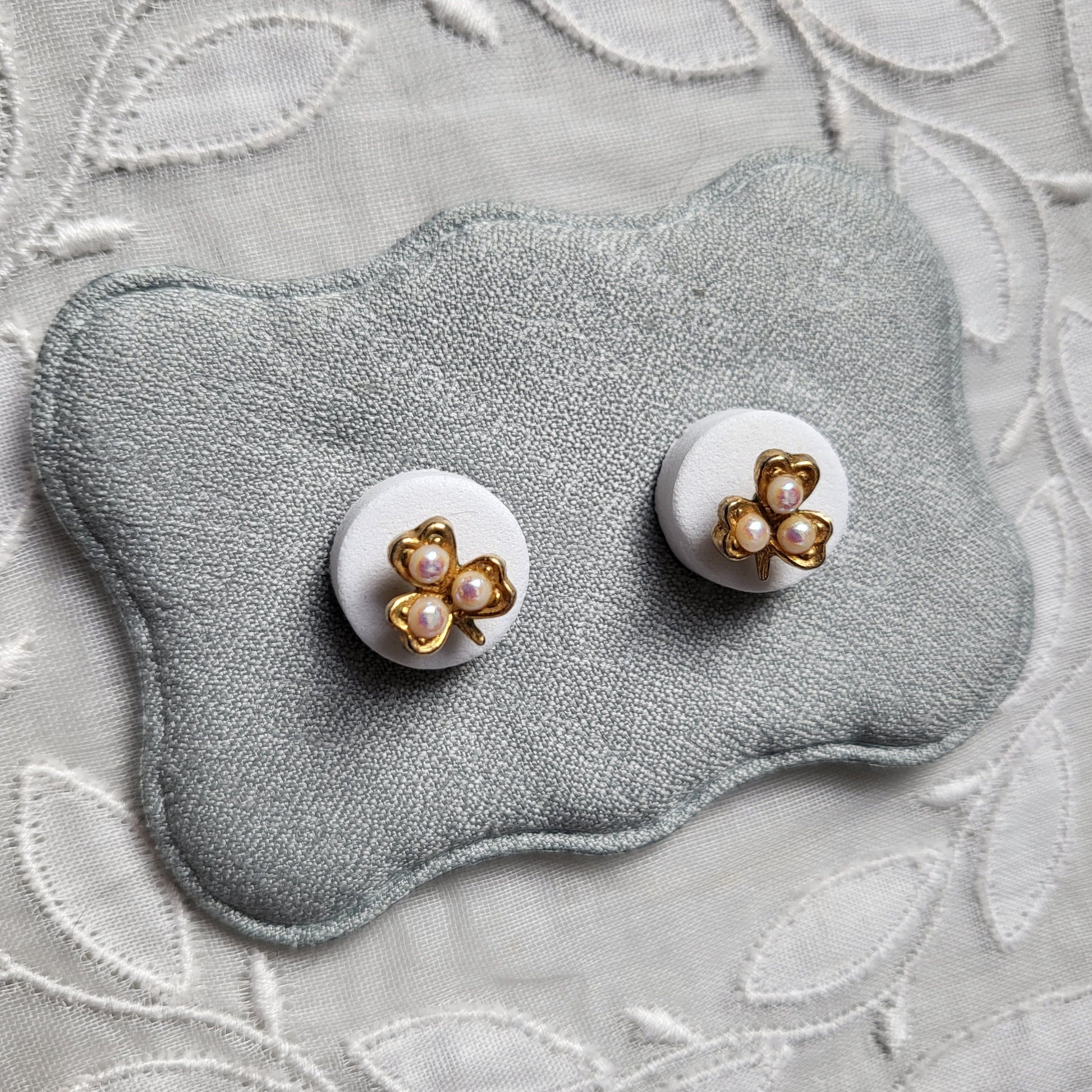 A sweet pair of clover design stud earrings with iridescent faux pearls on gold plated metal