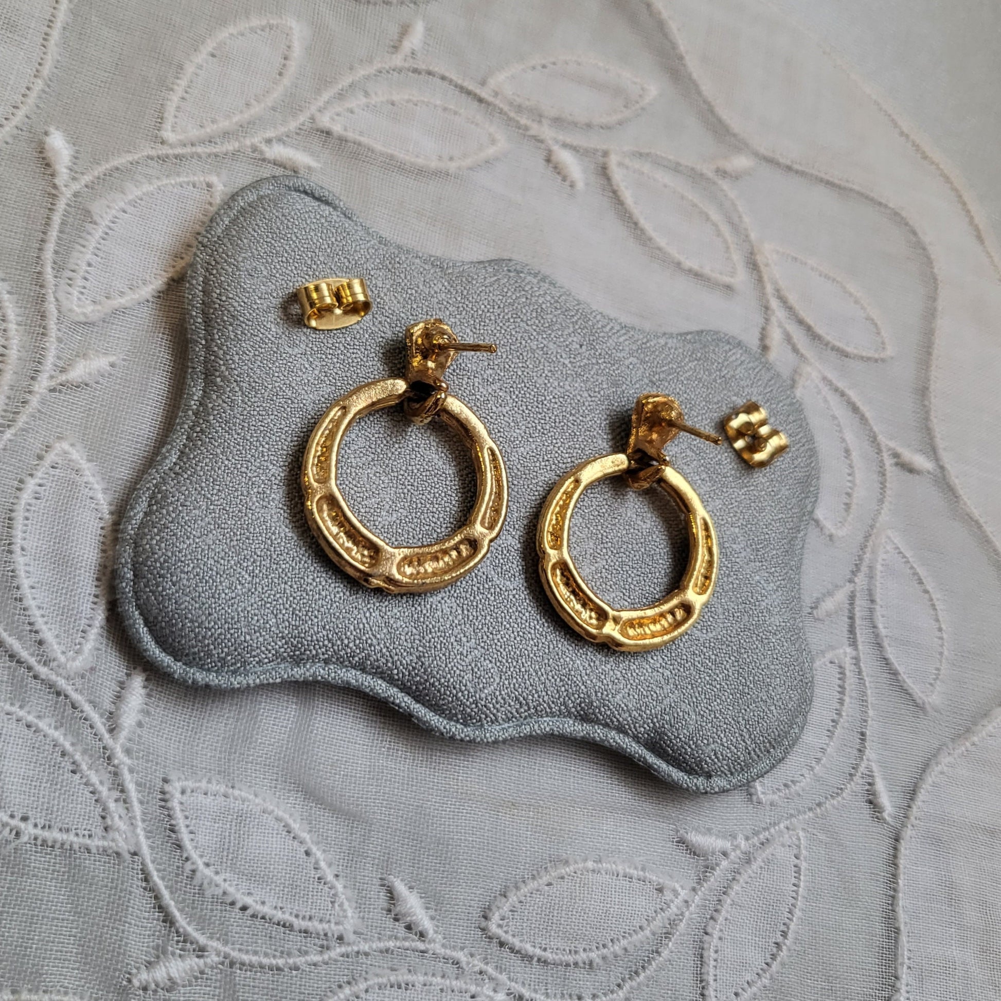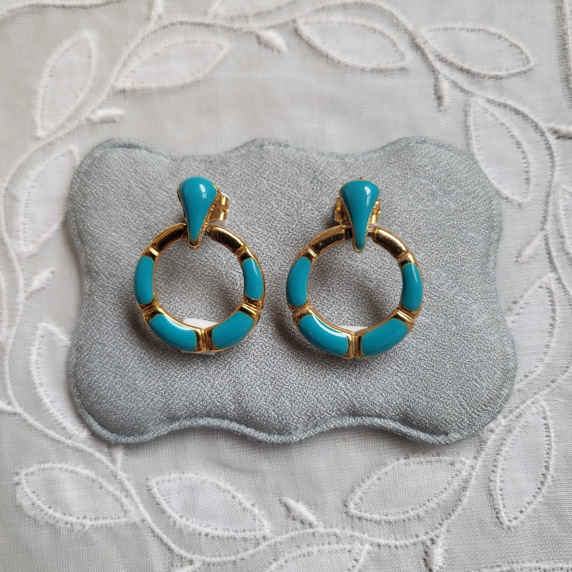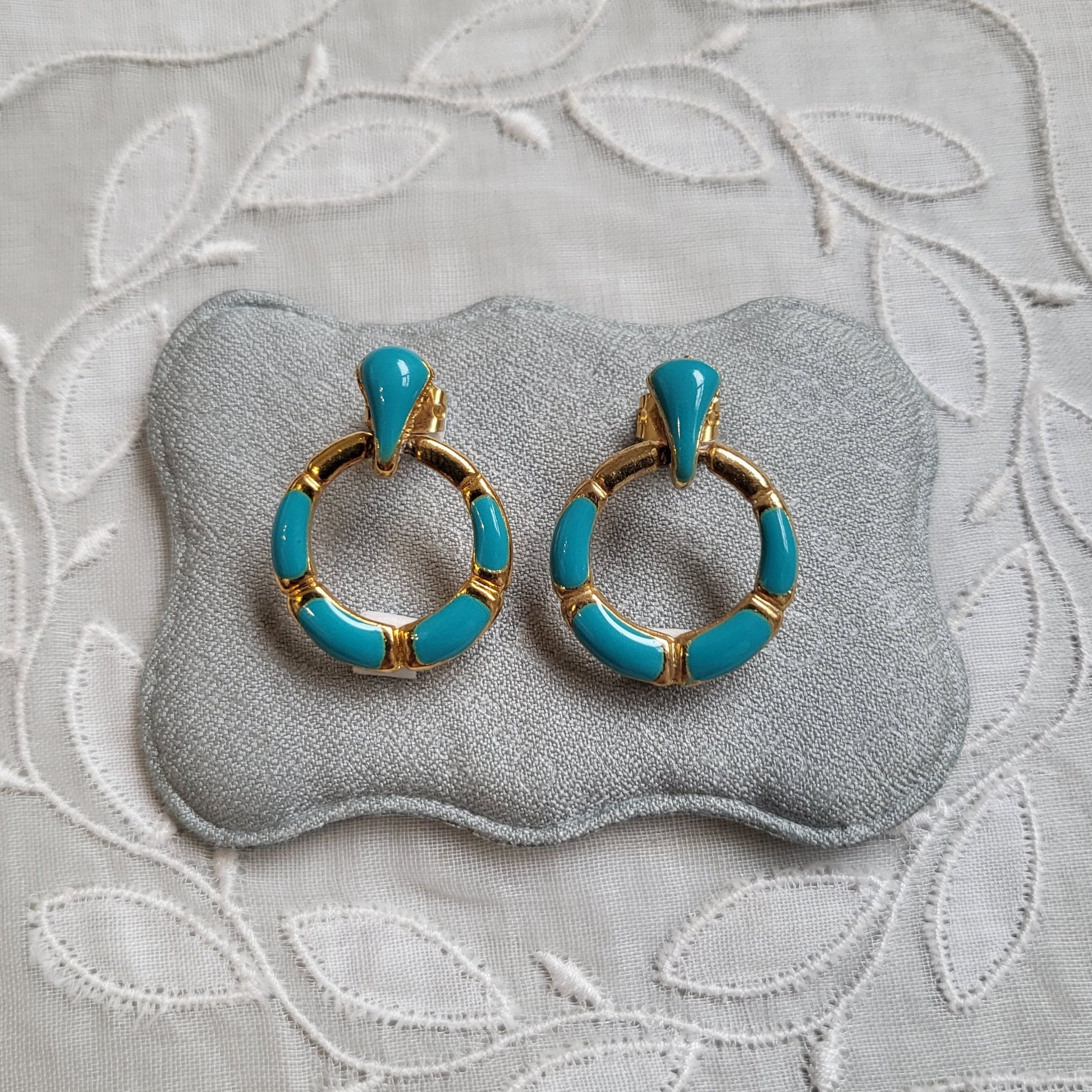 A sweet pair of door knocker earrings with turquoise enamel on gold plated metal