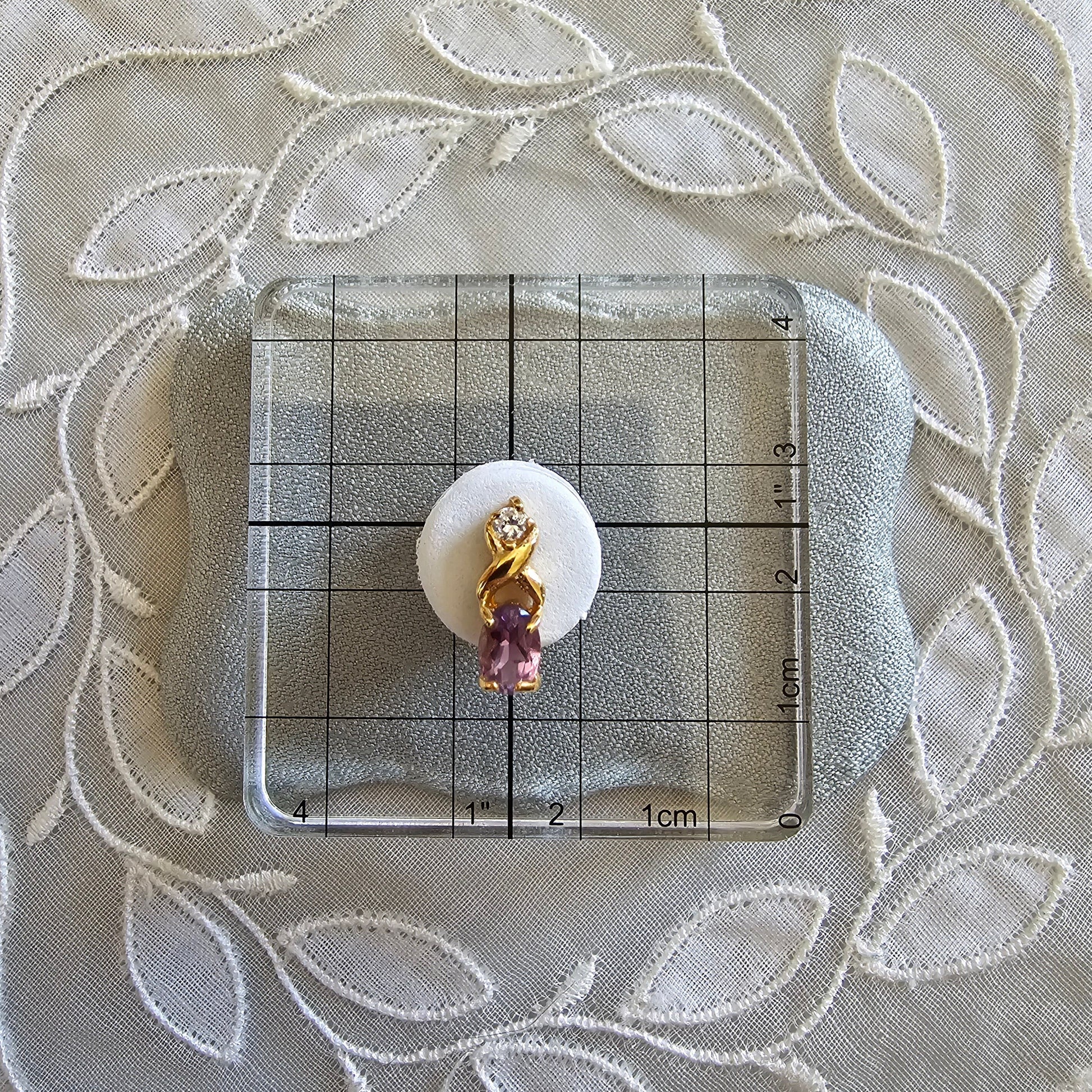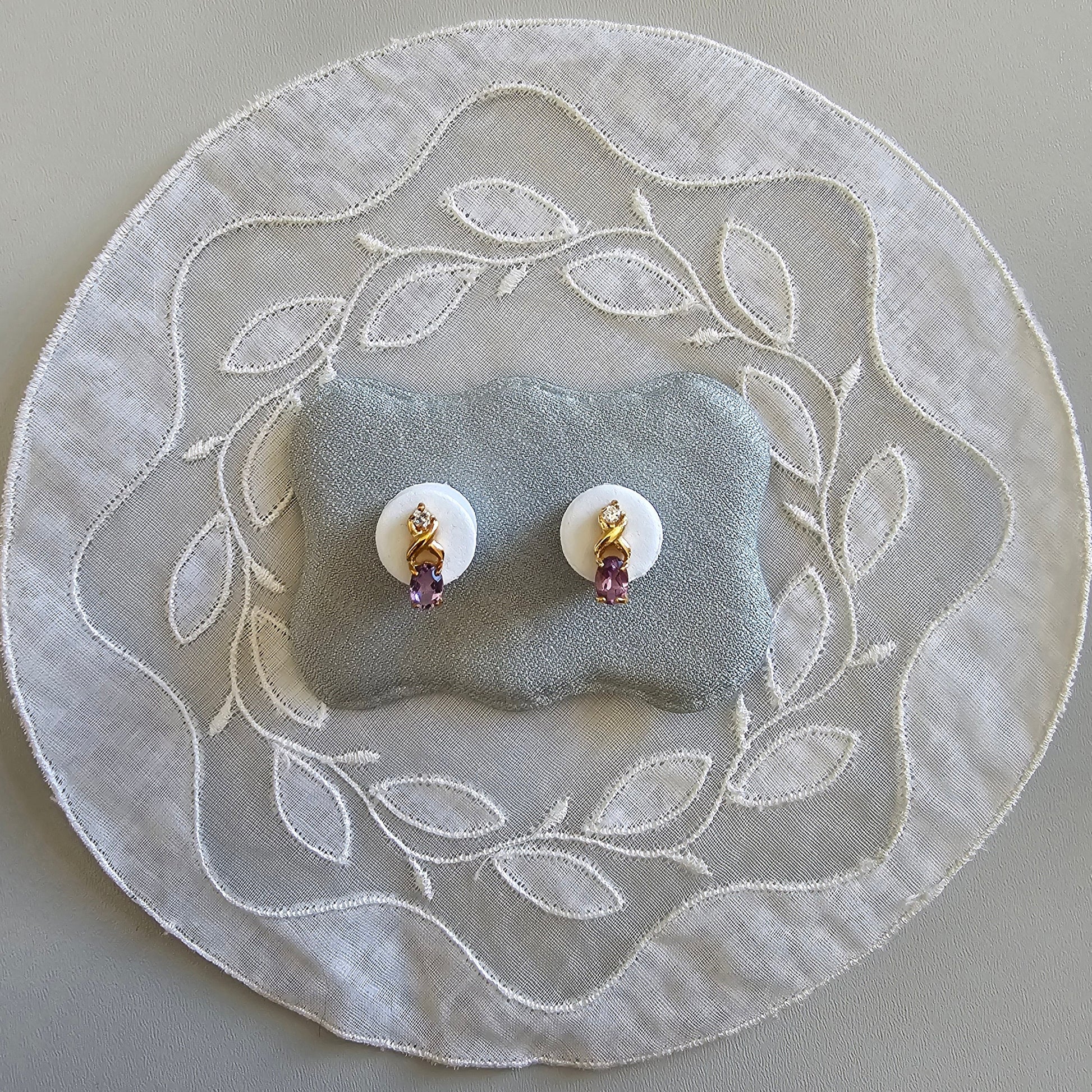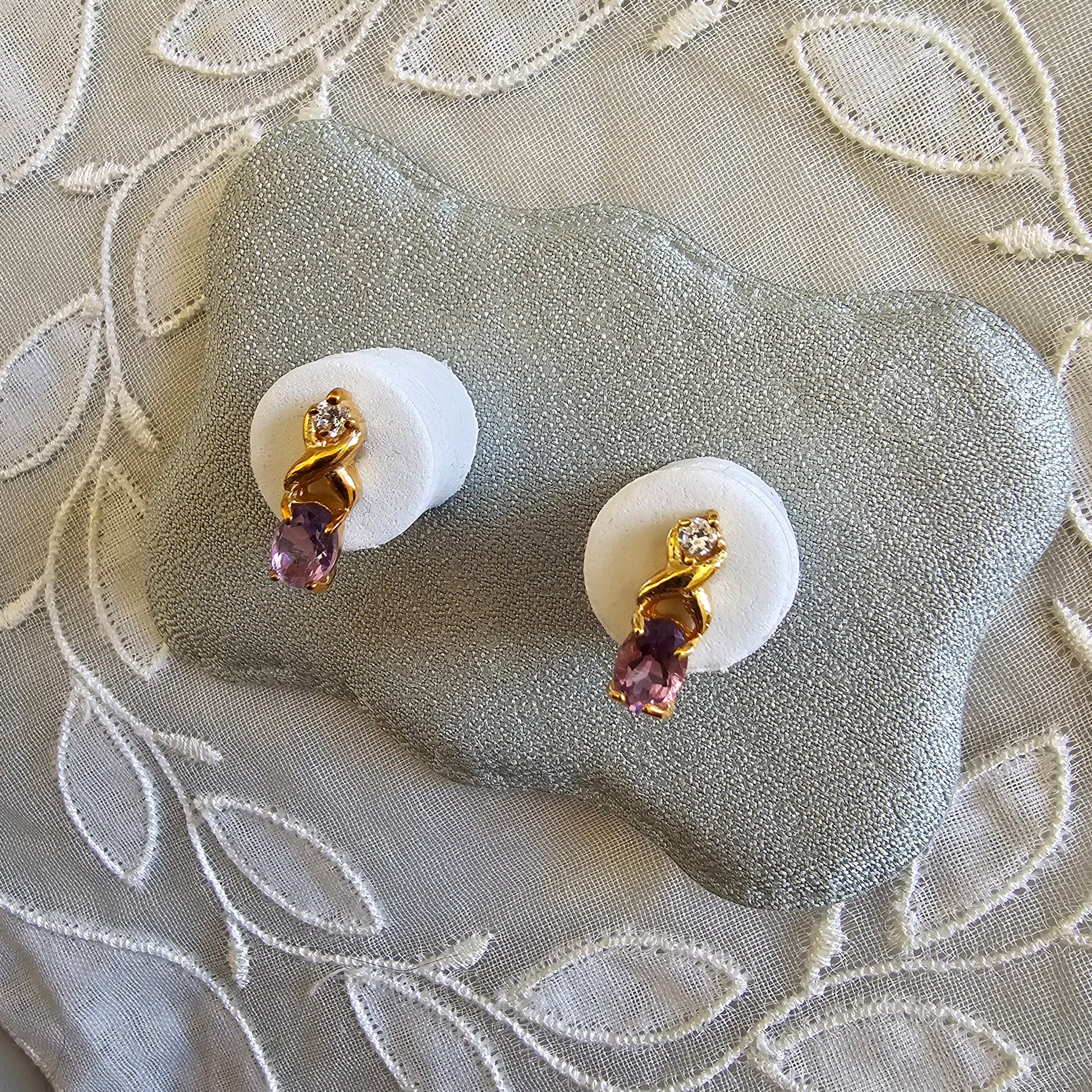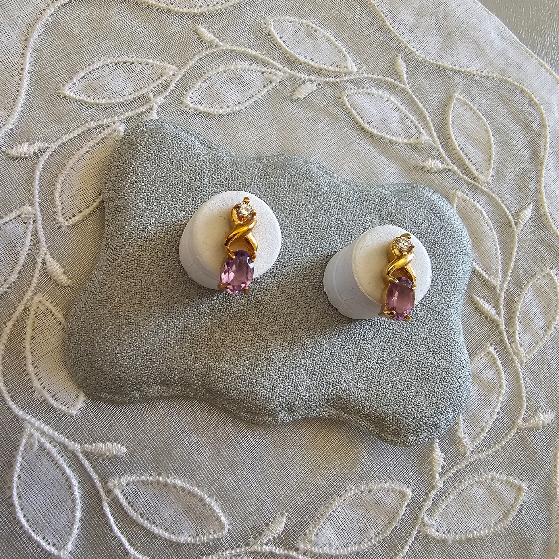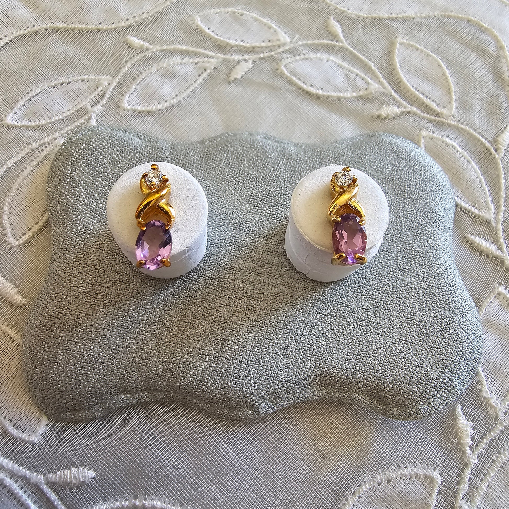 A dainty small stud earrings with clear and purple crystals on gold plated metal