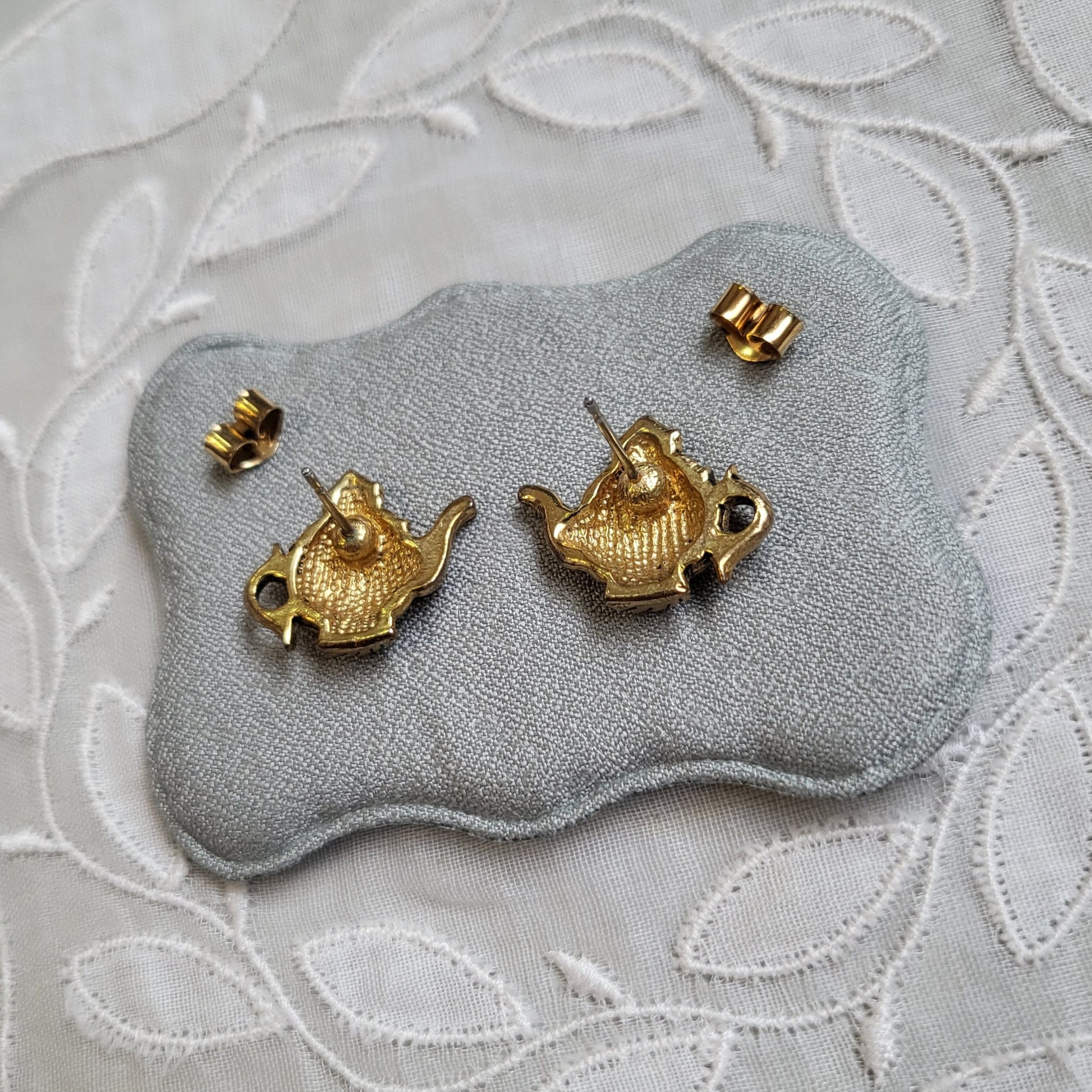 A quirky pair of vintage rose teapot stud earrings in red gold toned jewellery metal alloy