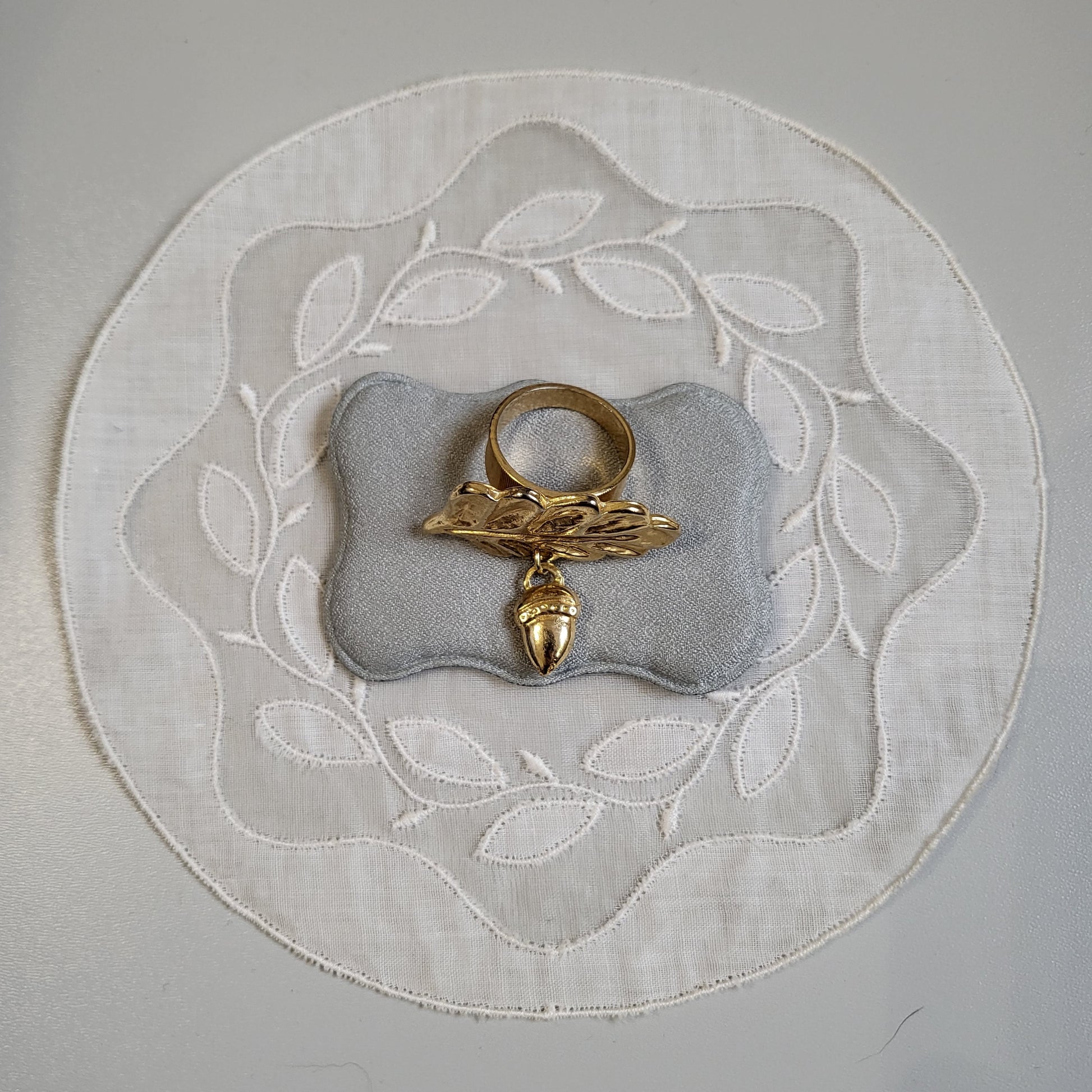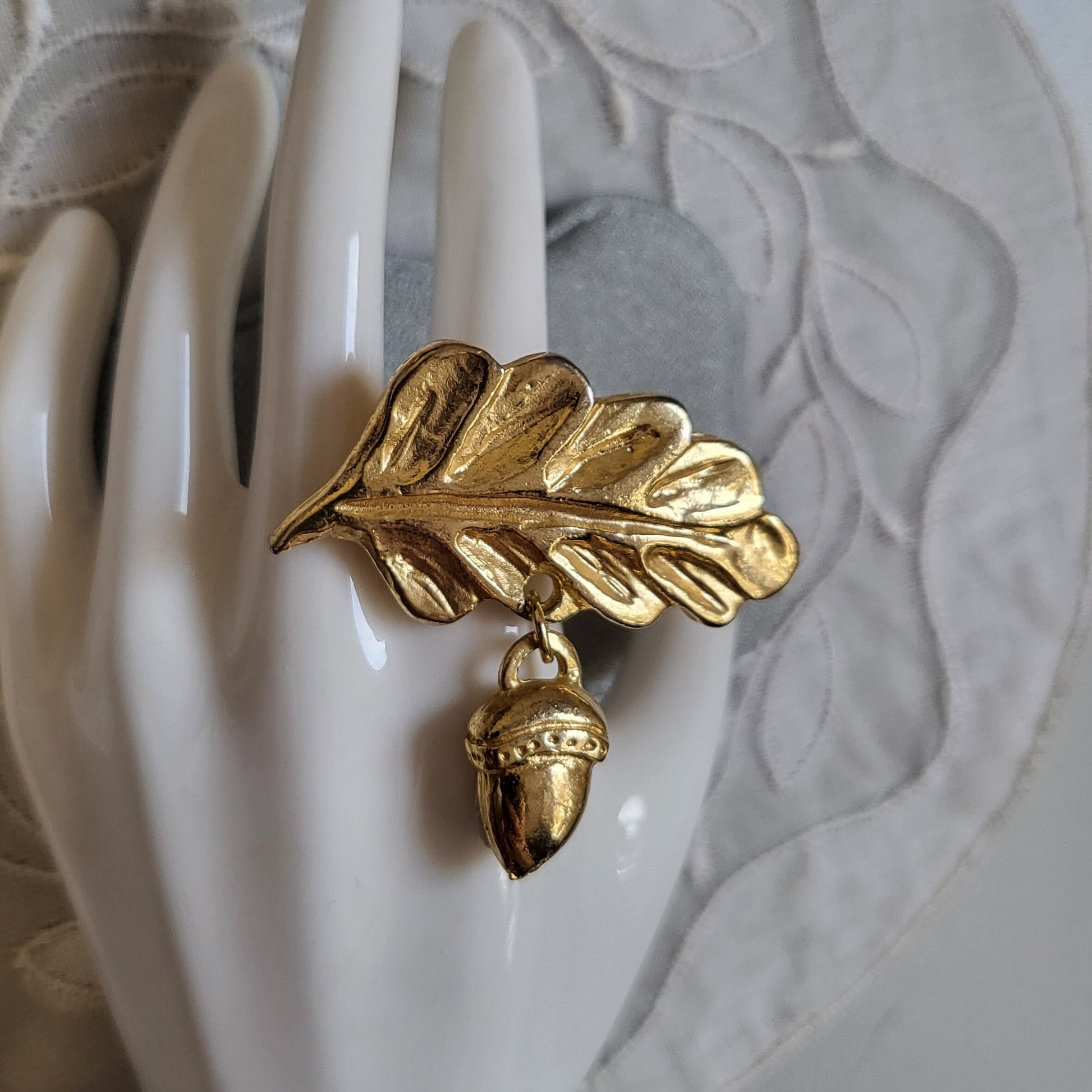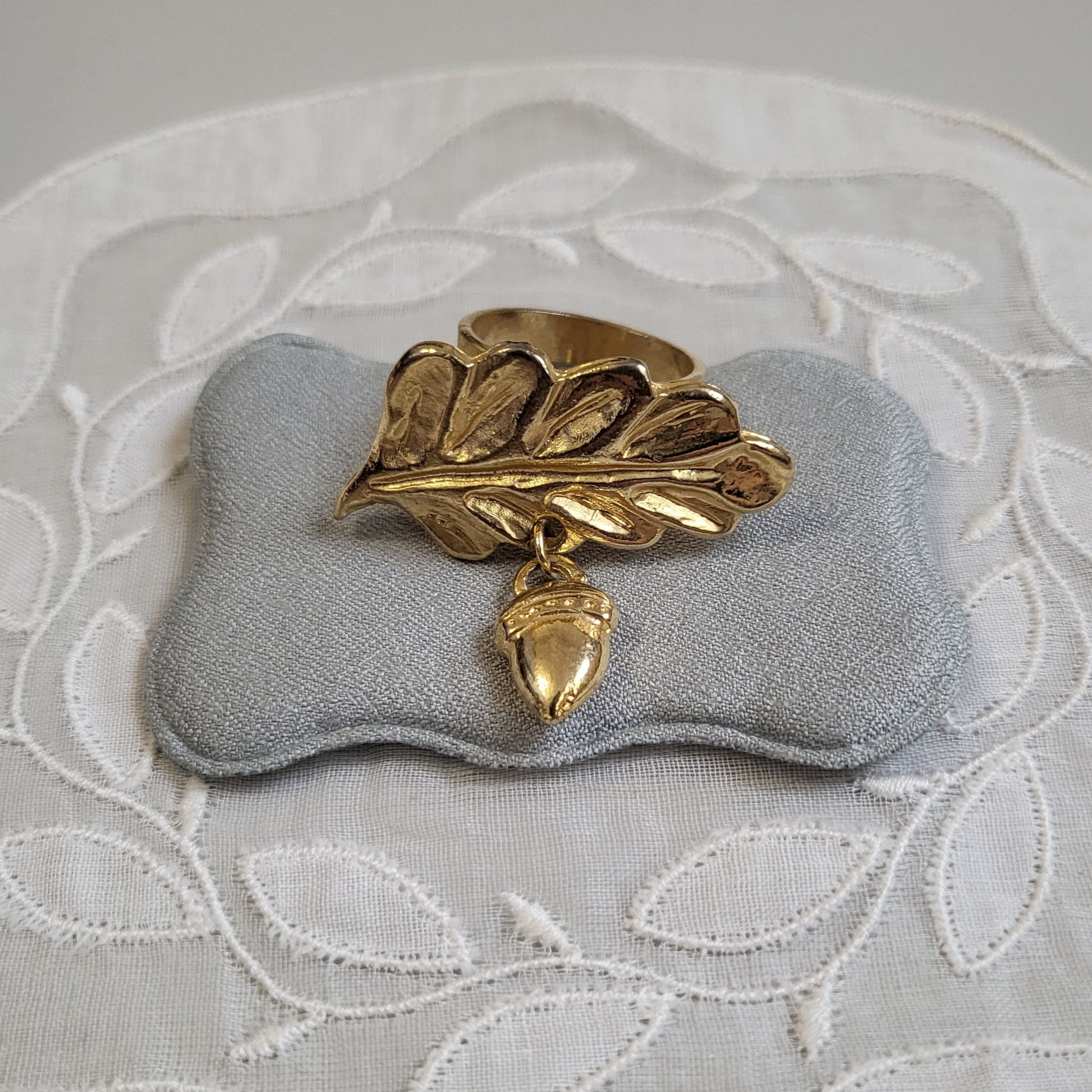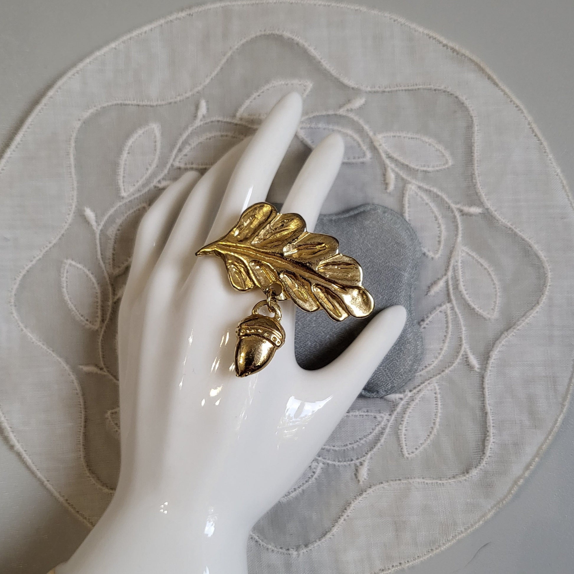 A beautiful leaf ring with a sweet acorn drop in gold plated metal