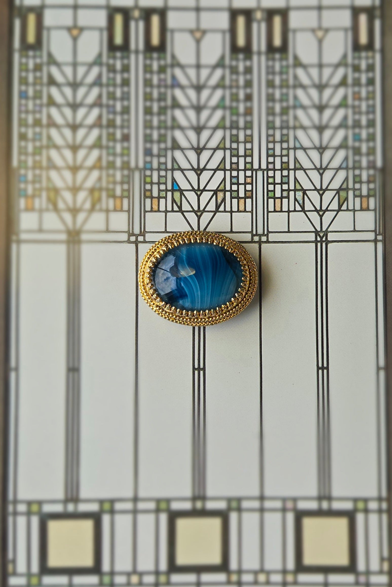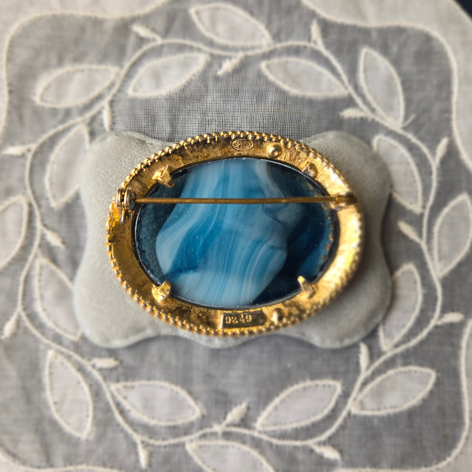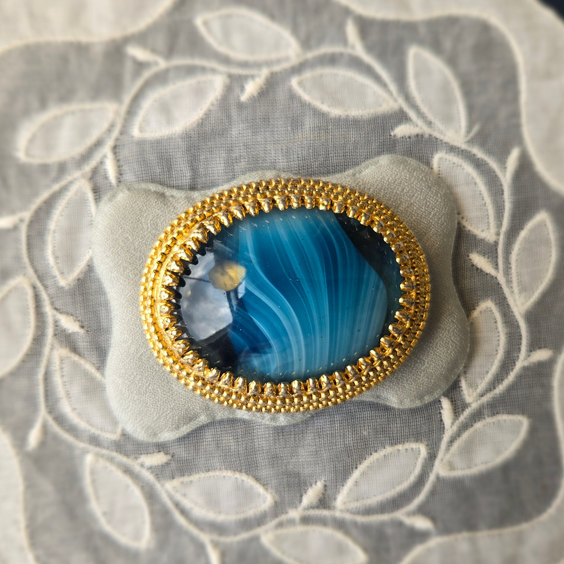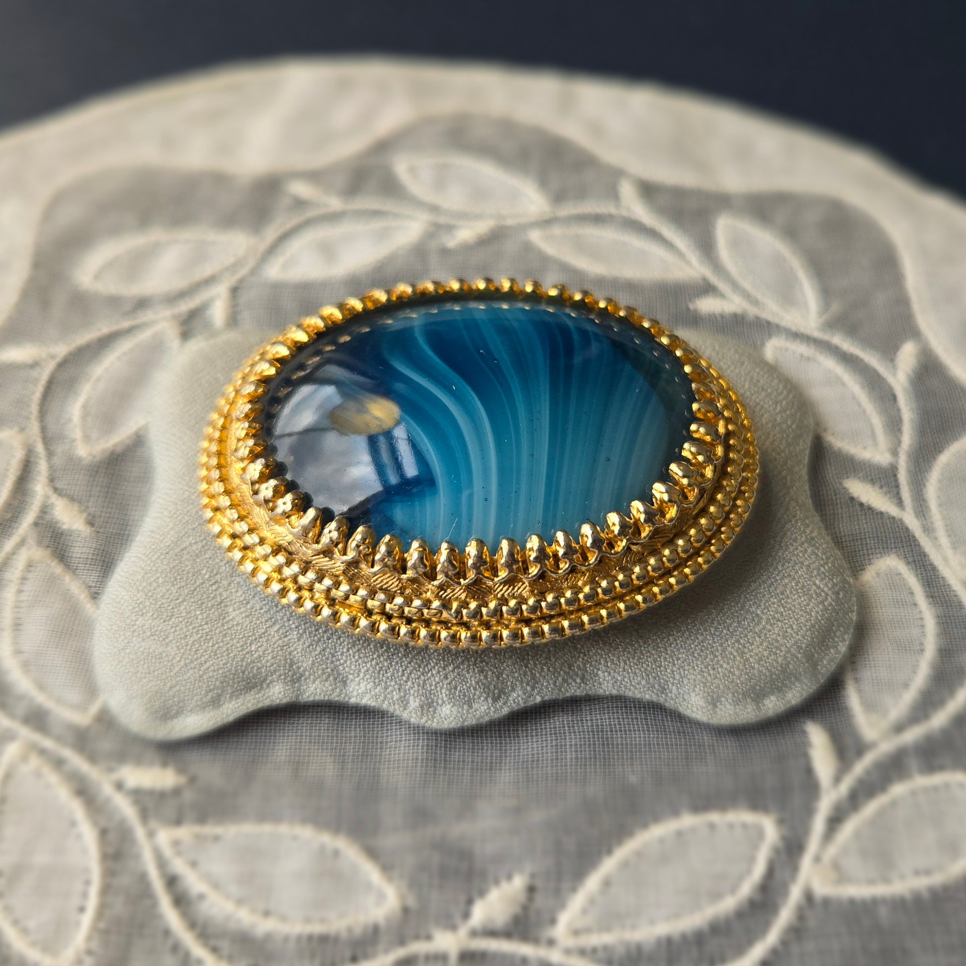 A beautiful vintage brooch from British costume jewellery maker Sphinx, featuring a domed glass cabochon in rich blue tones with agate-style banding. The oval stone is set in a detailed gold-tone frame with a classic rope-style edge. A bold and elegant statement piece from the 1980s—ideal for collectors or as a standout accessory on a lapel, scarf, or coat.