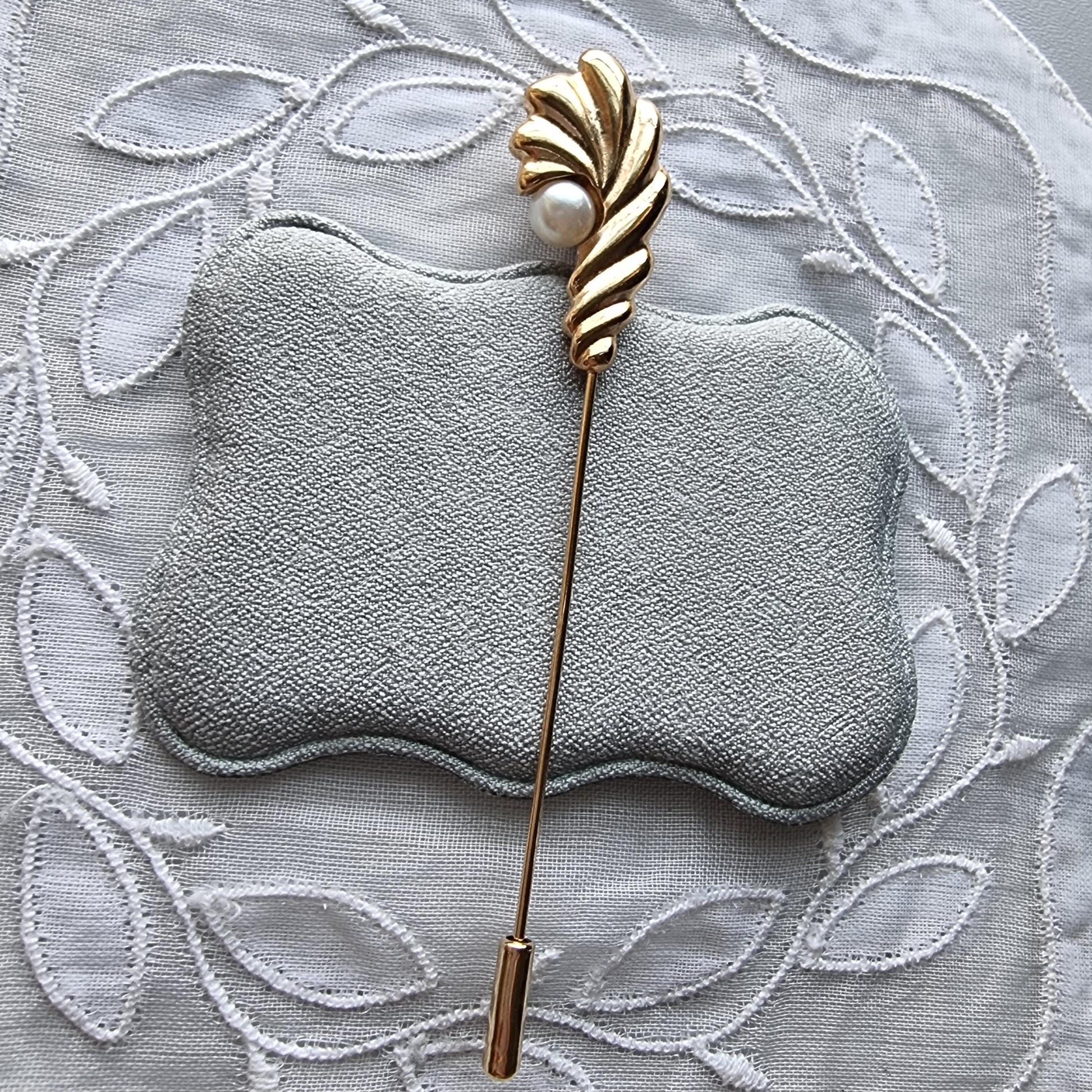 A gorgeous stylised cocoon/shell design stick pin with a faux pearl on gold plated metal