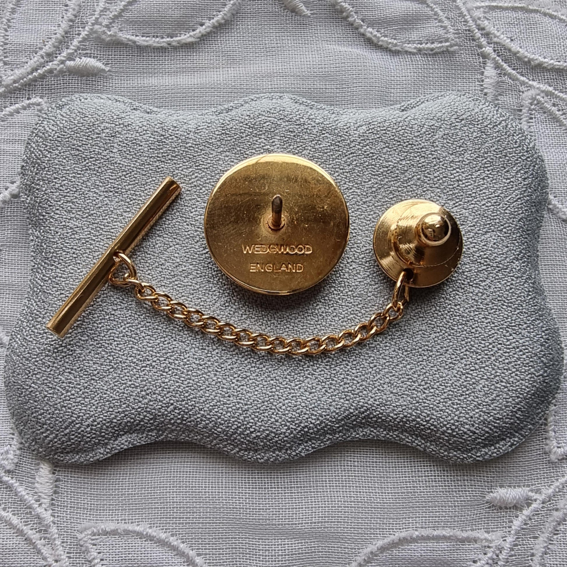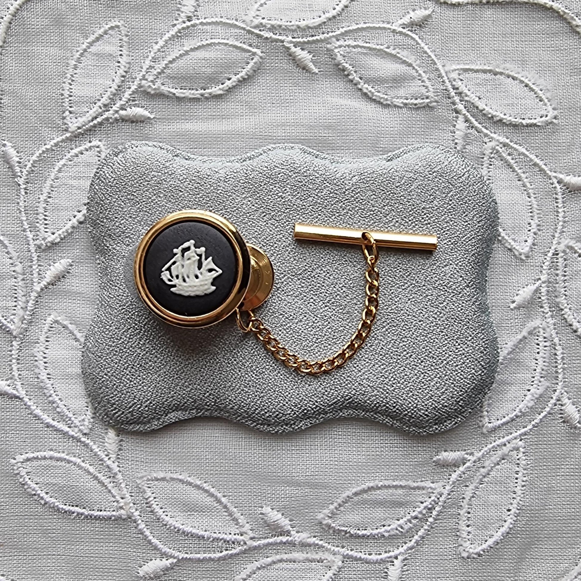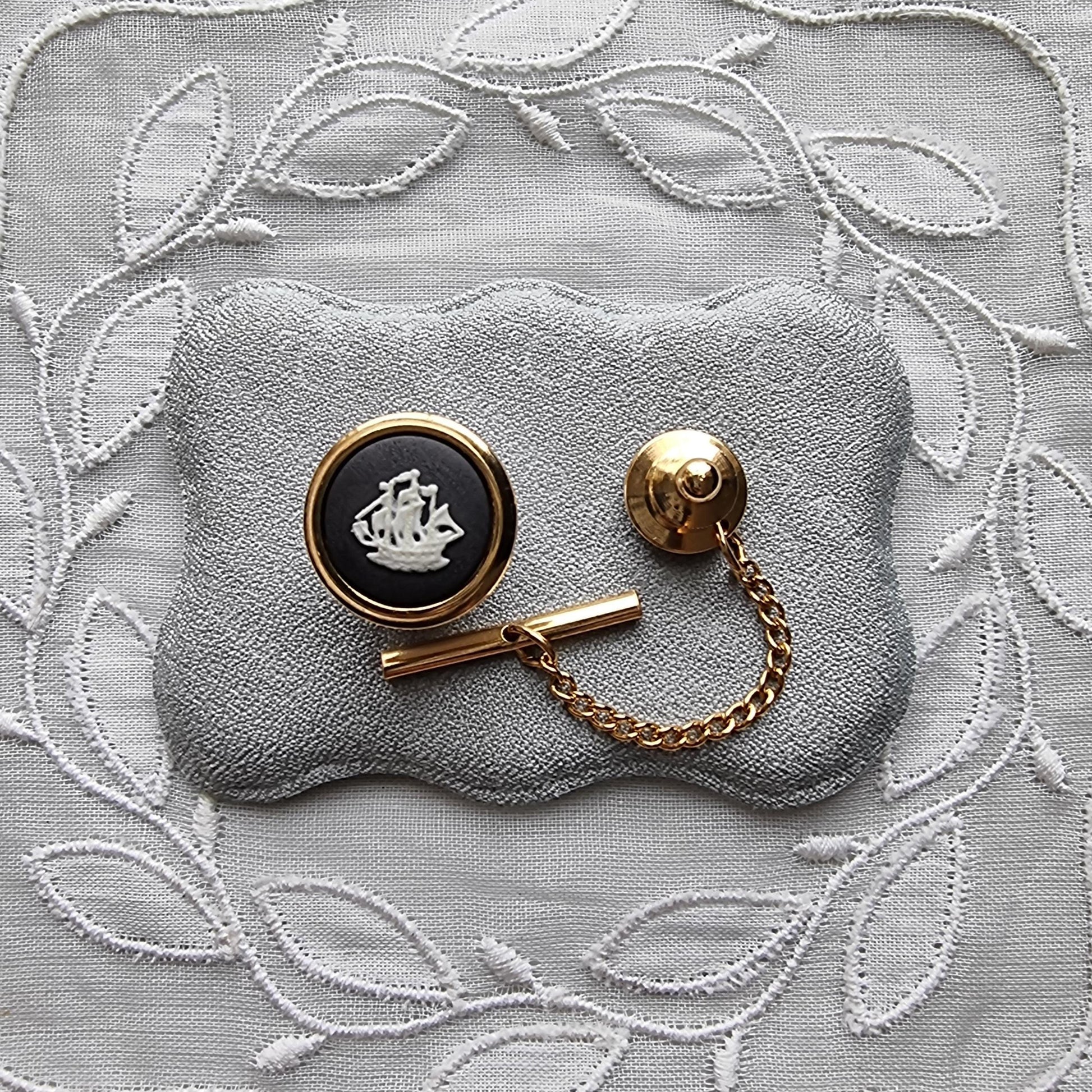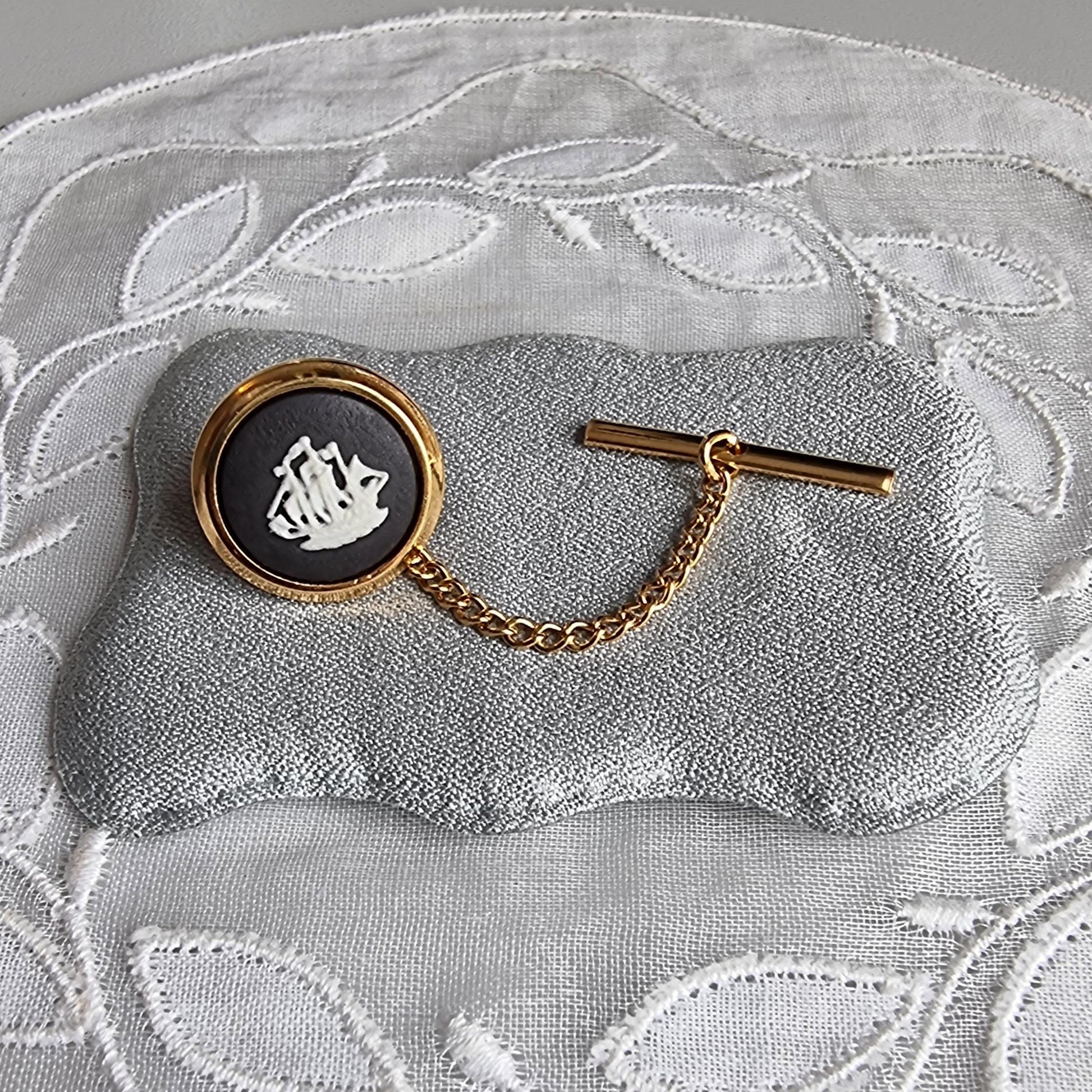 A stunning black and white jasperware tie pin by Wedgwood with a sailing ship plaque on gold plated metal